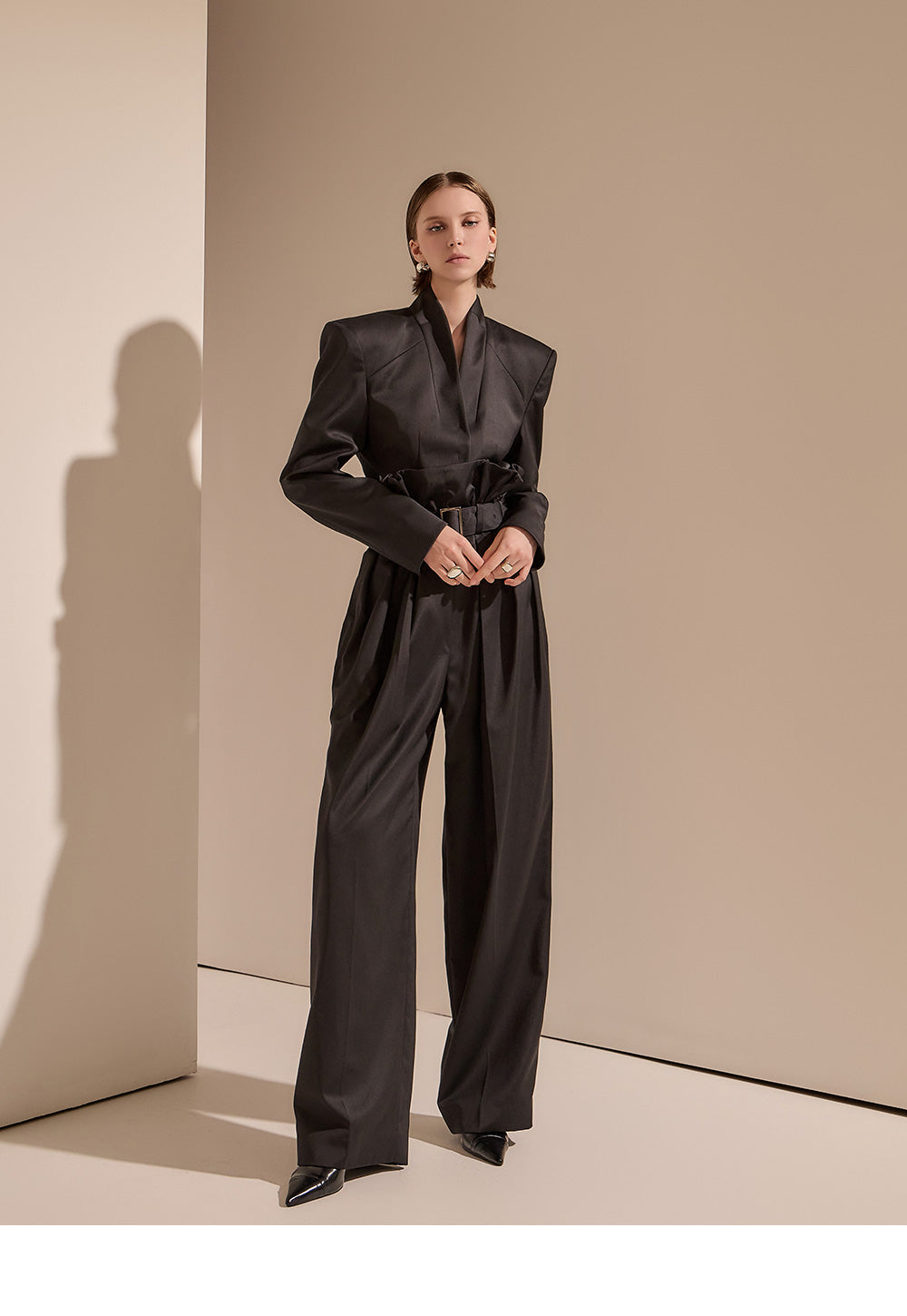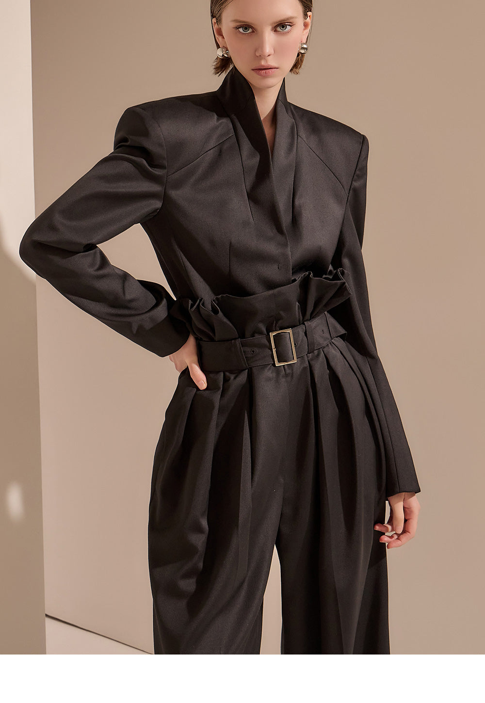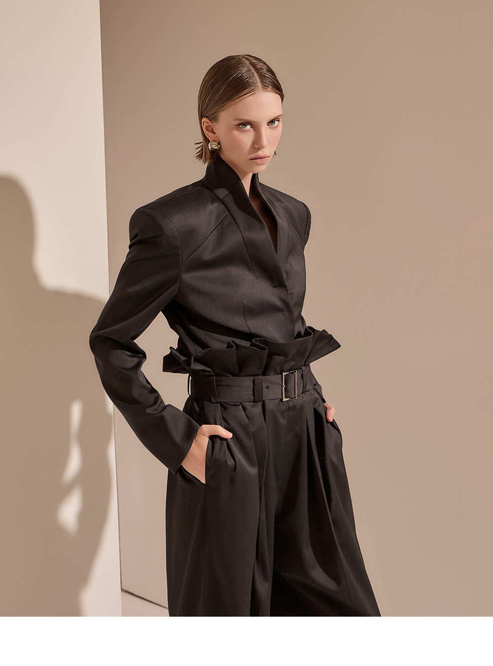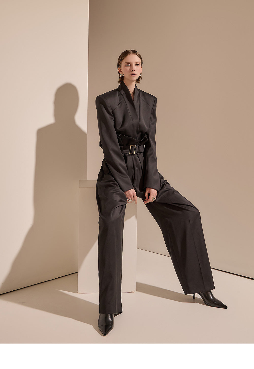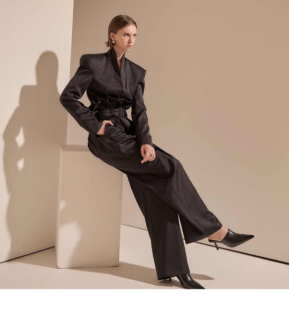 模特身高 174 厘米,穿着均码的黑色上衣/裤子。
