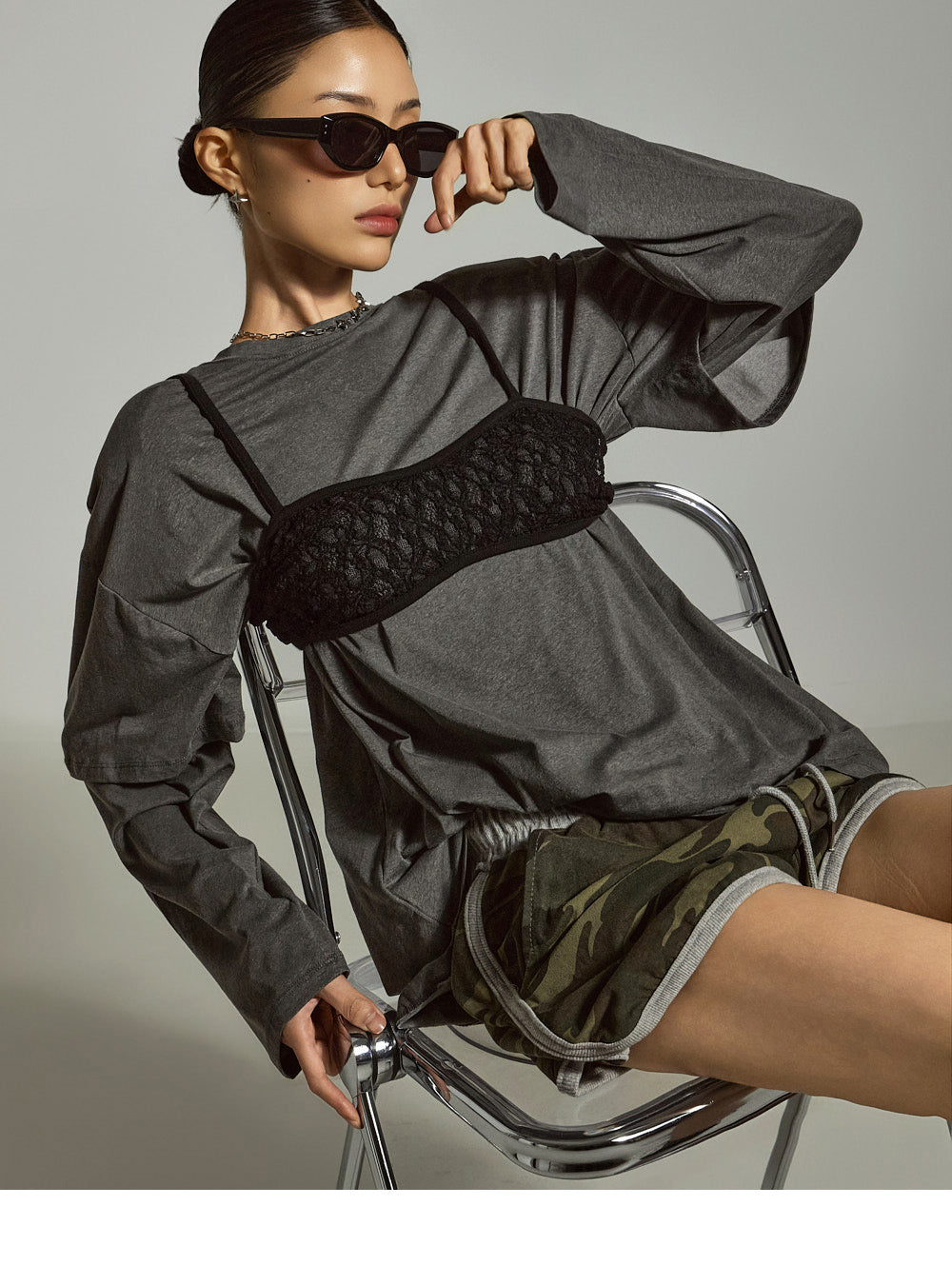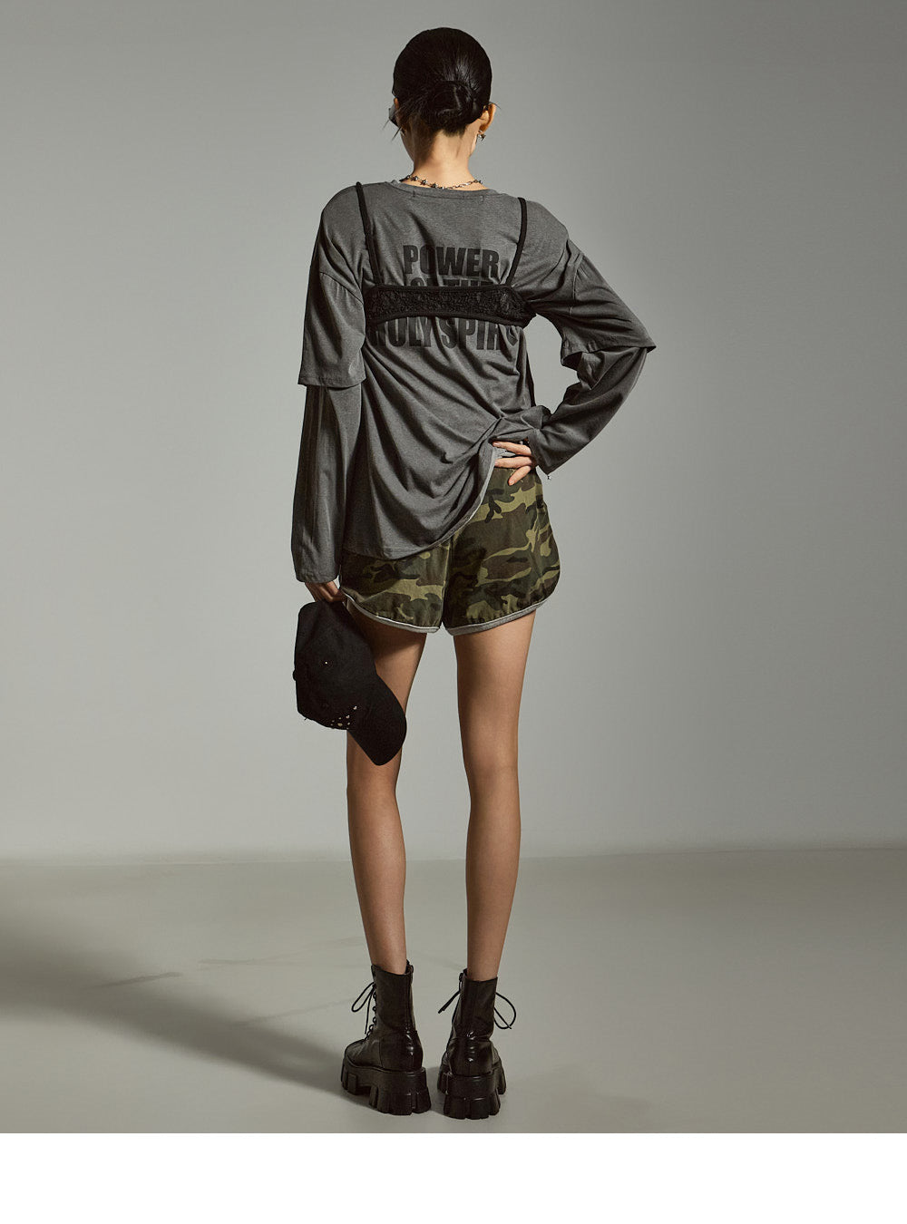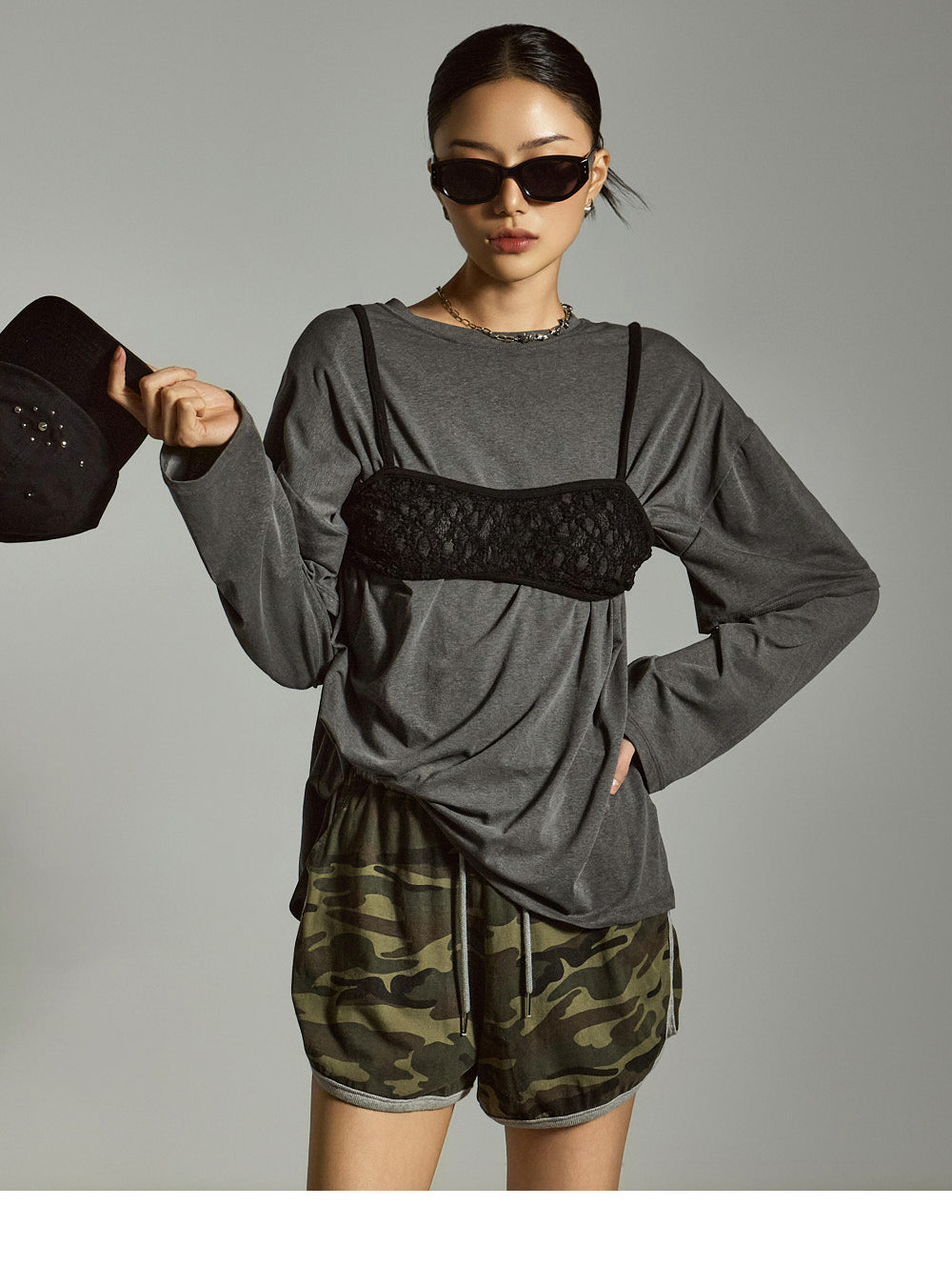 模特身高 171 厘米,穿着均码的灰色衣服。
