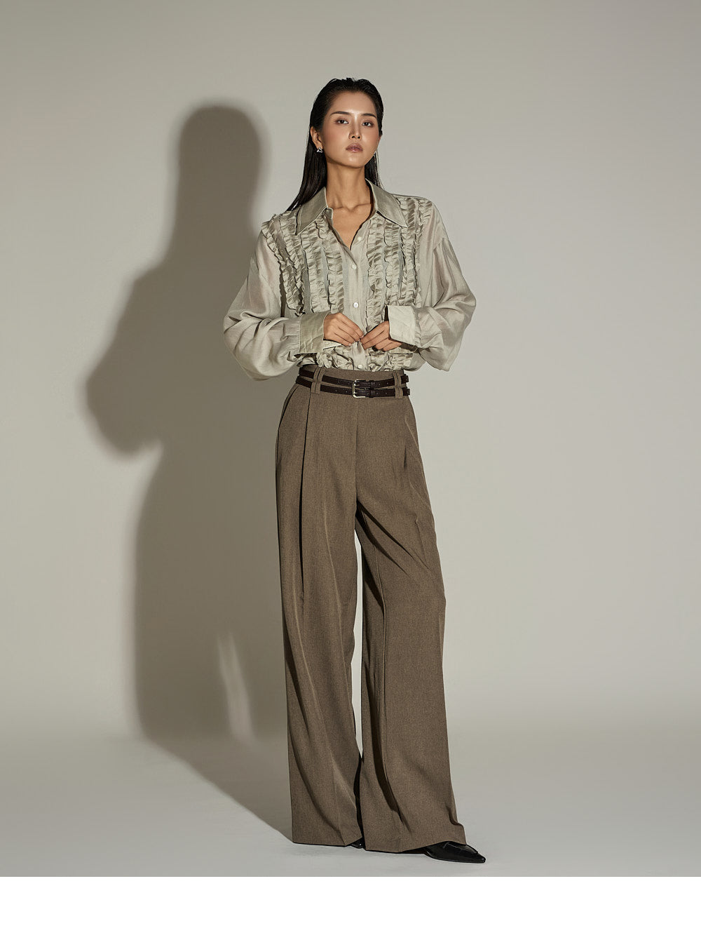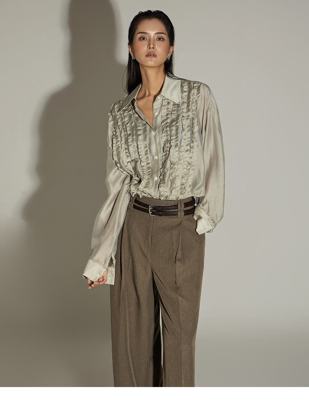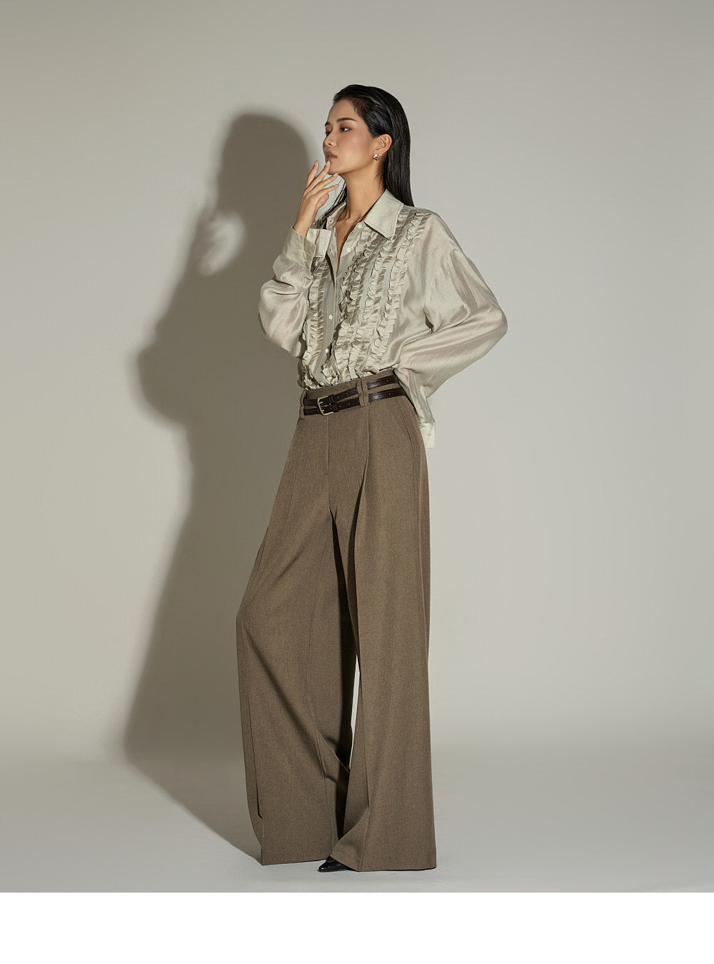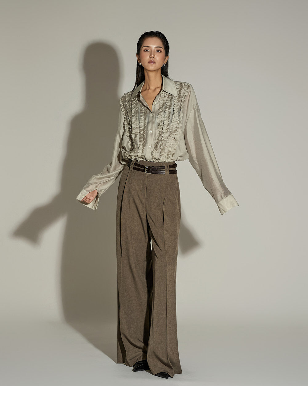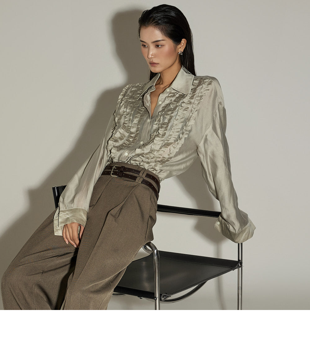 The wide silhouette and front pintuck detailing