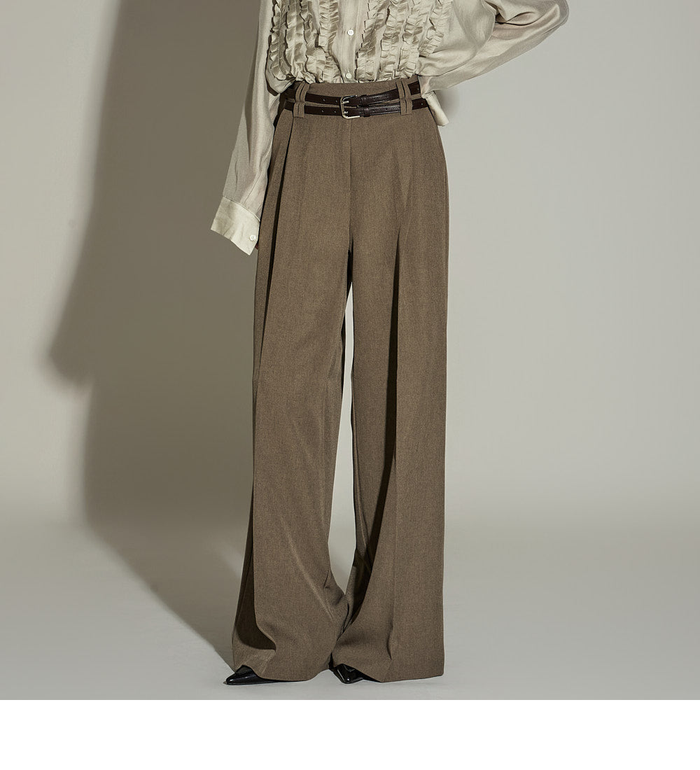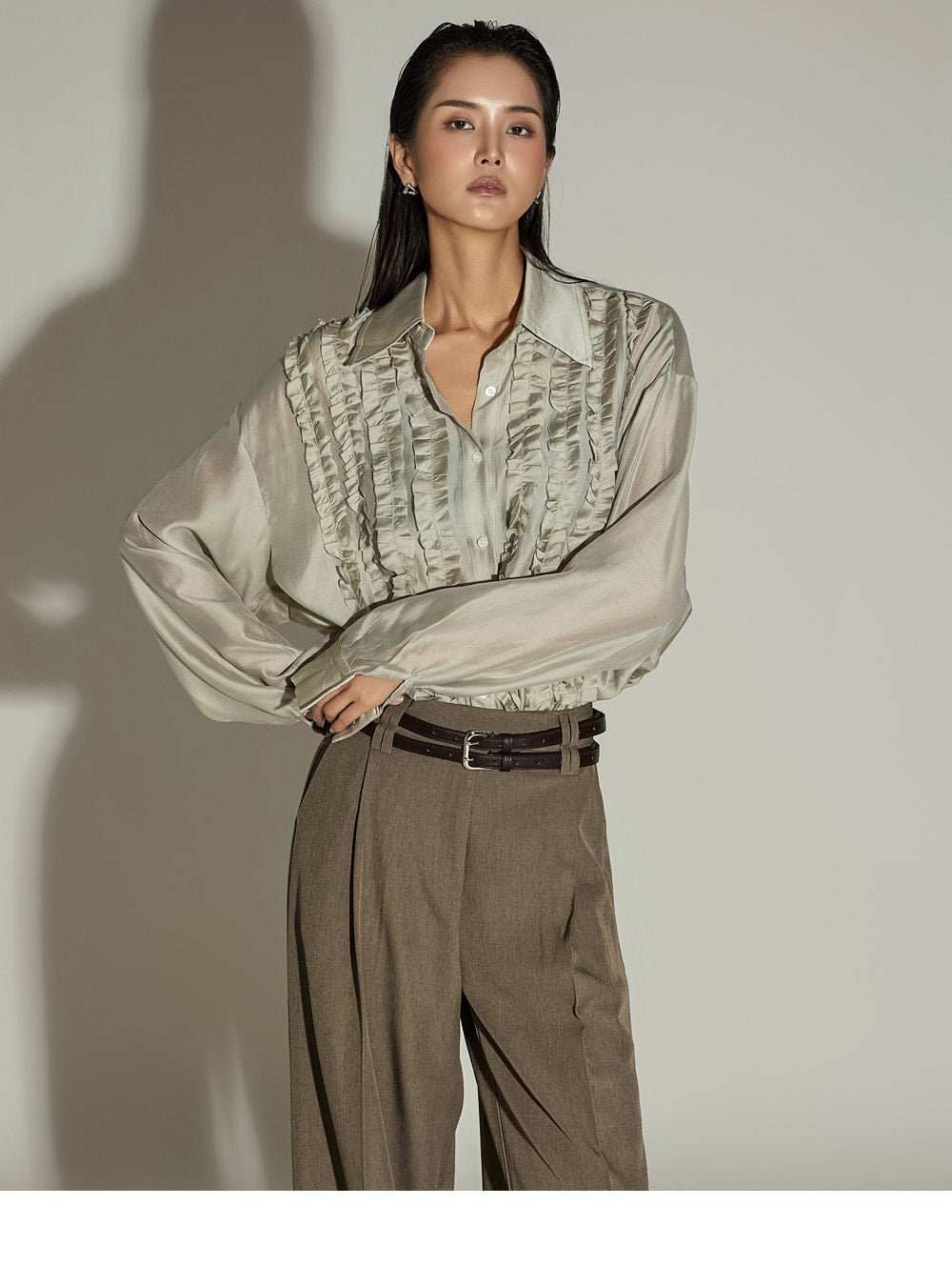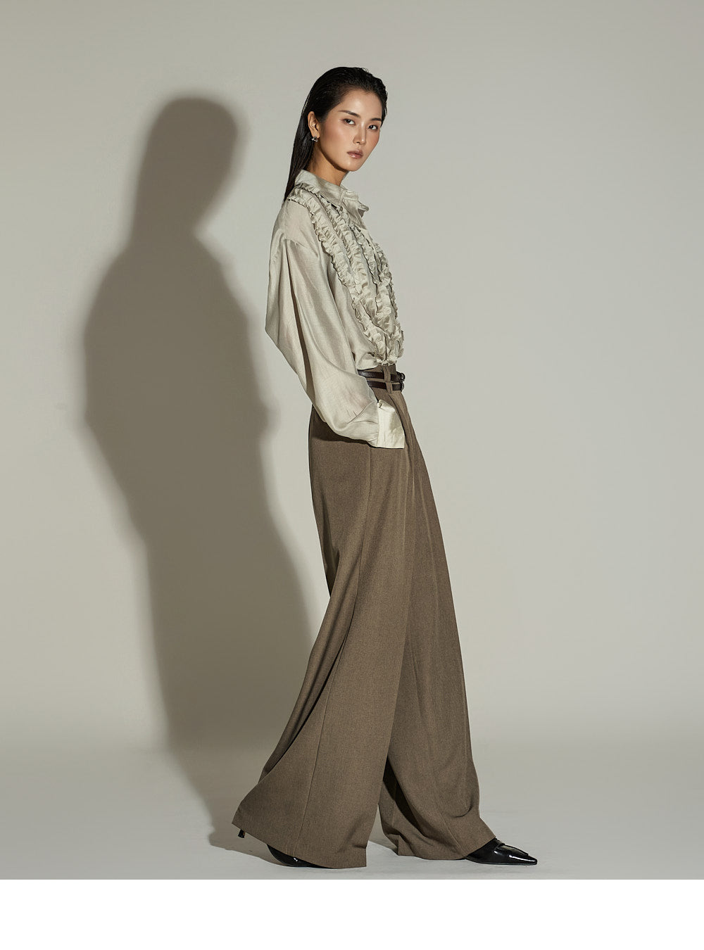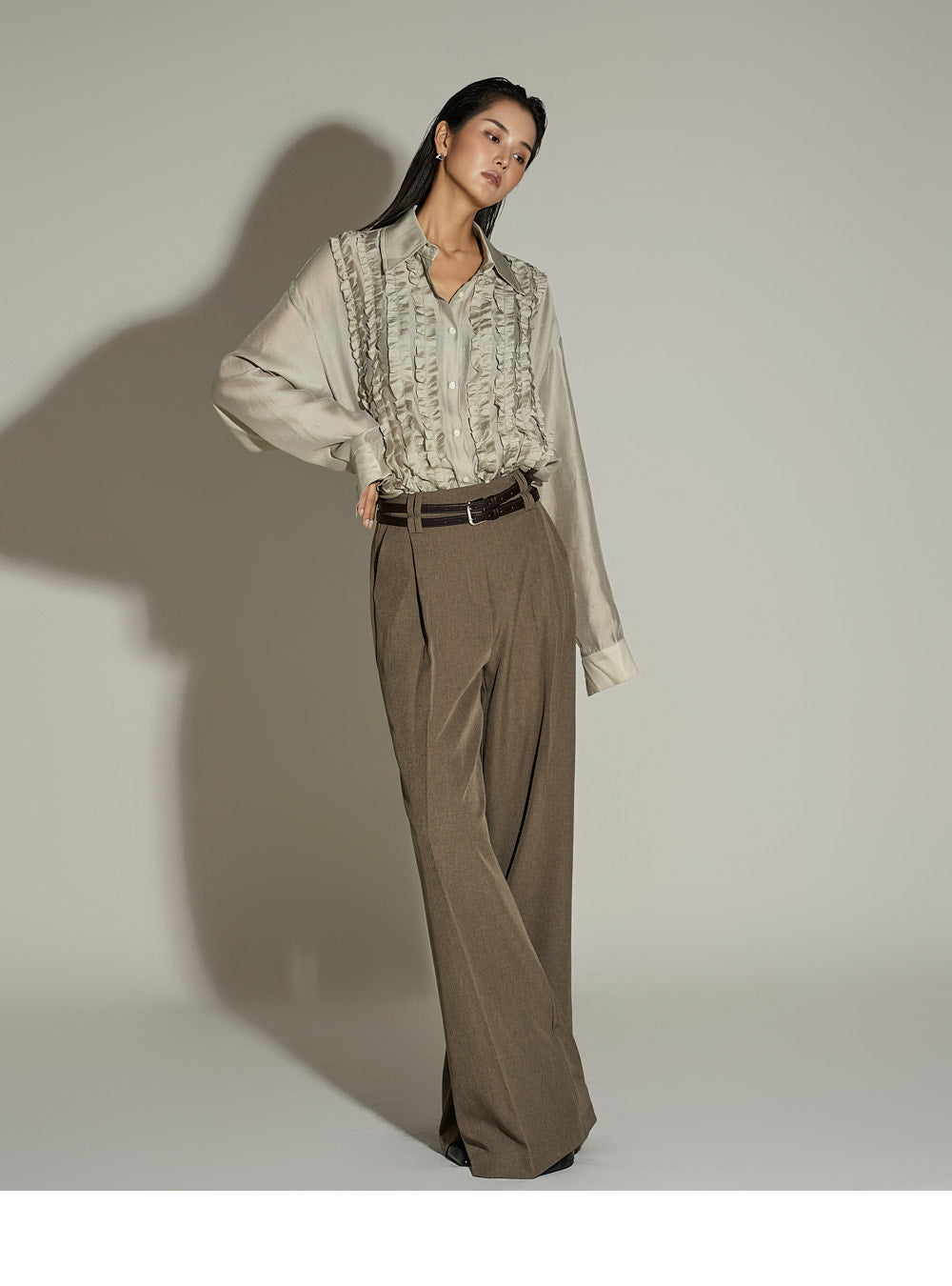 The wide silhouette and front pintuck detailing