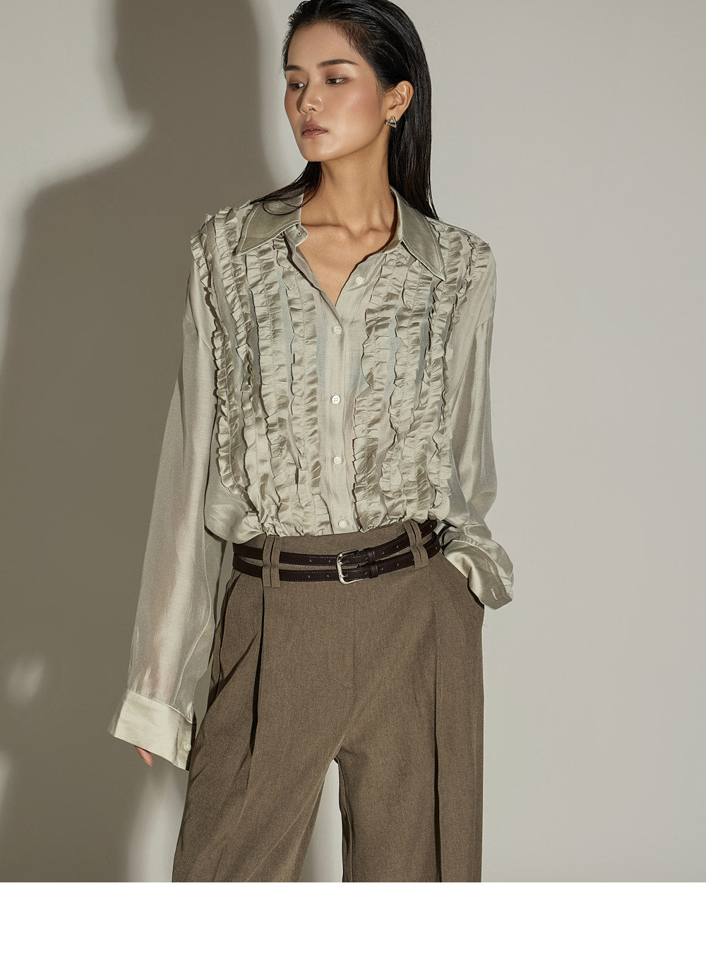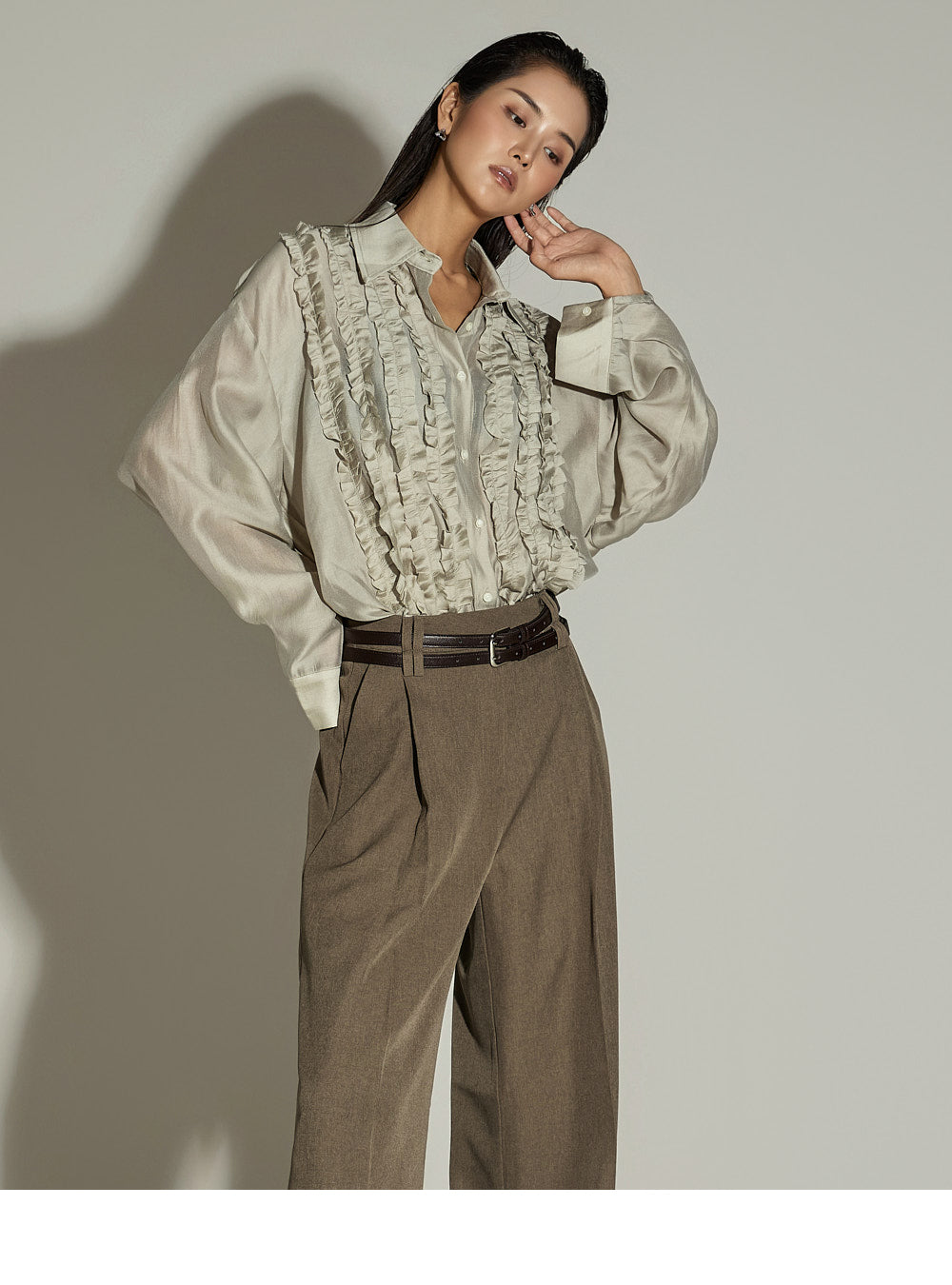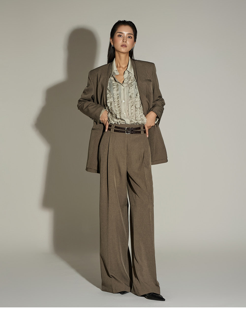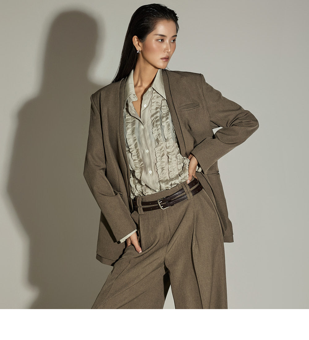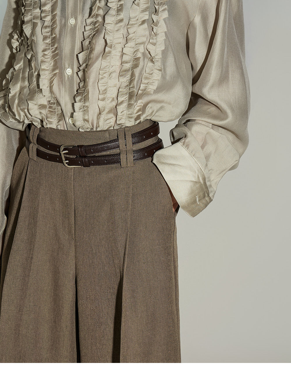 The wide silhouette and front pintuck detailing