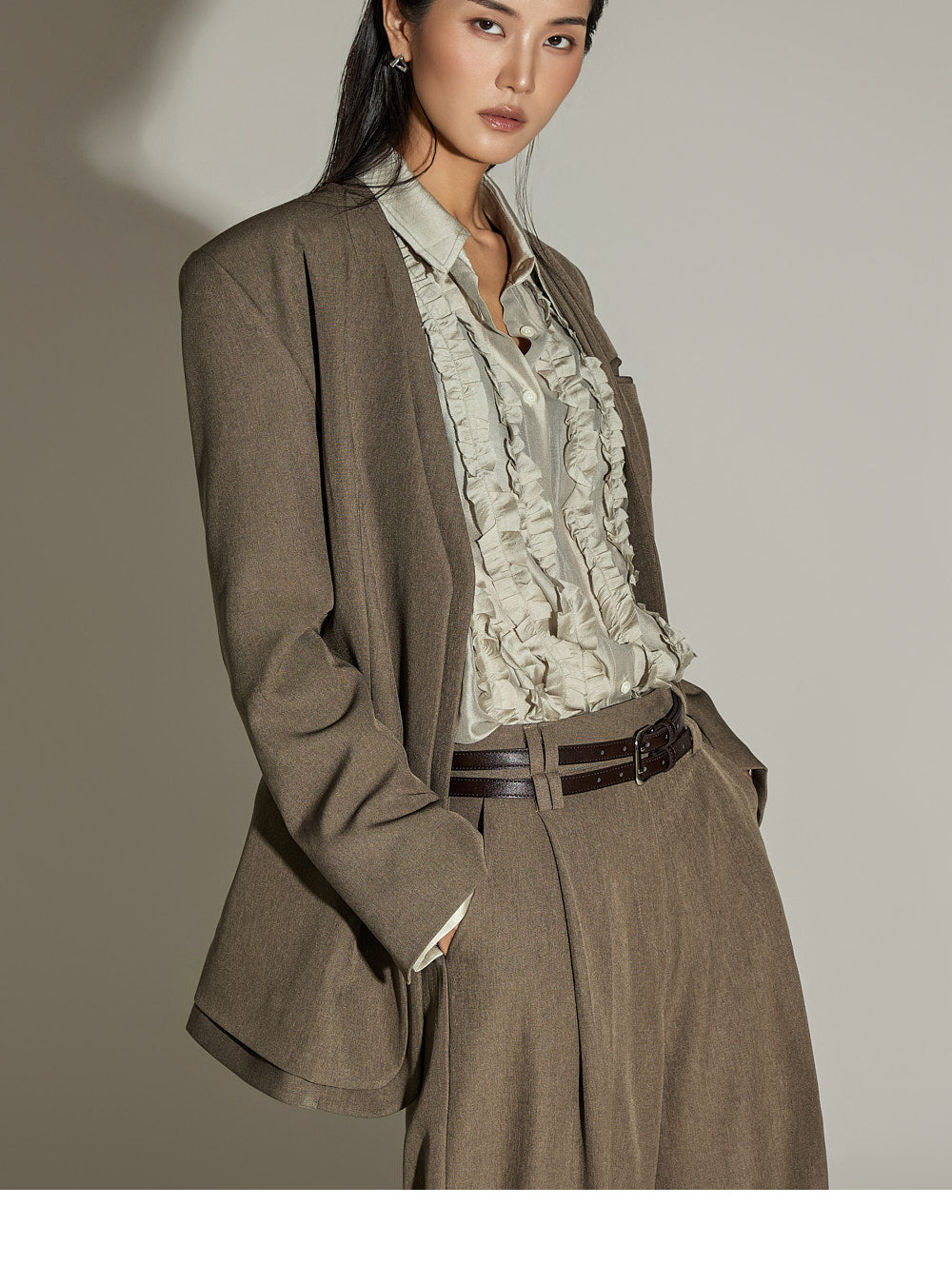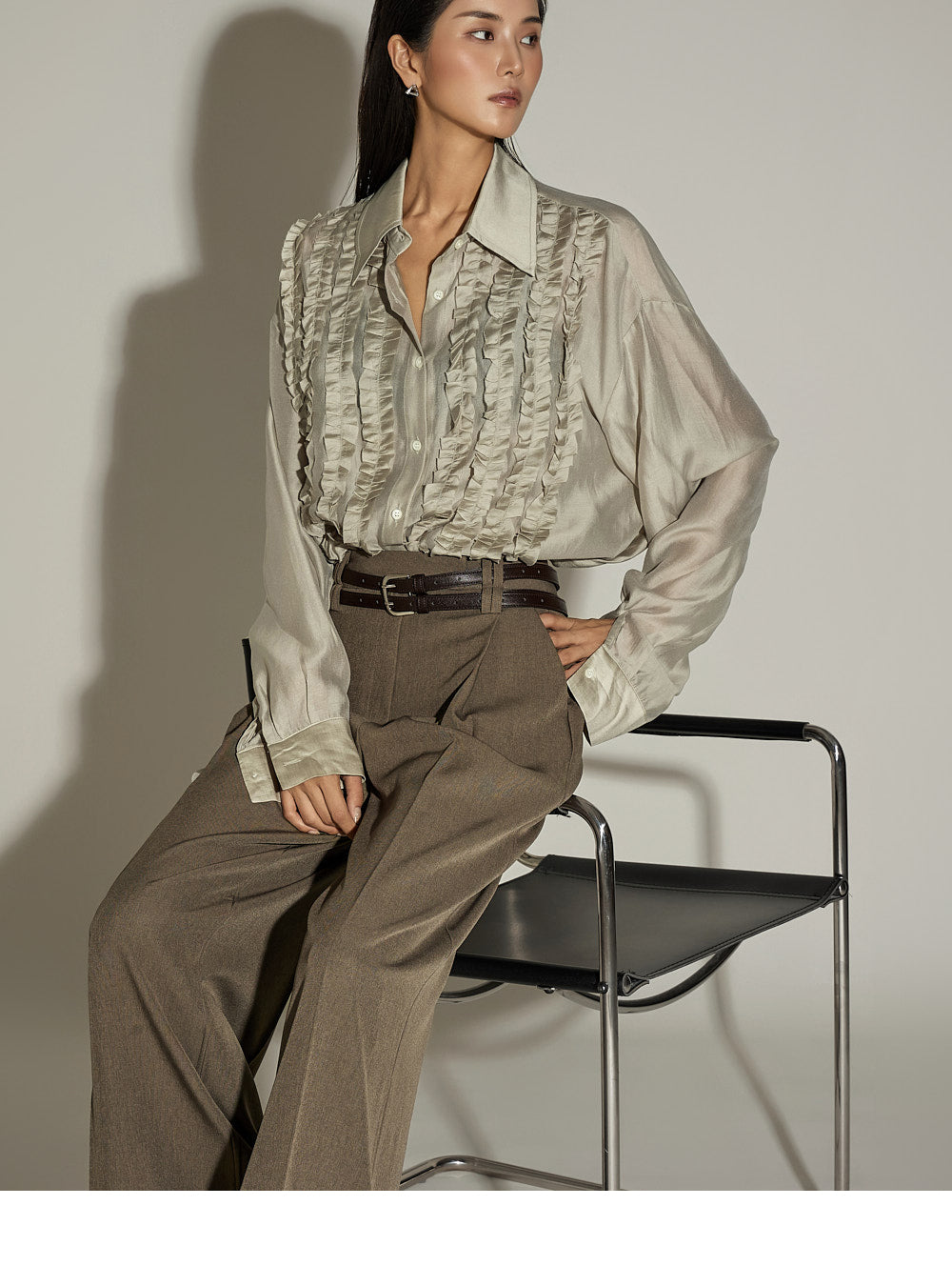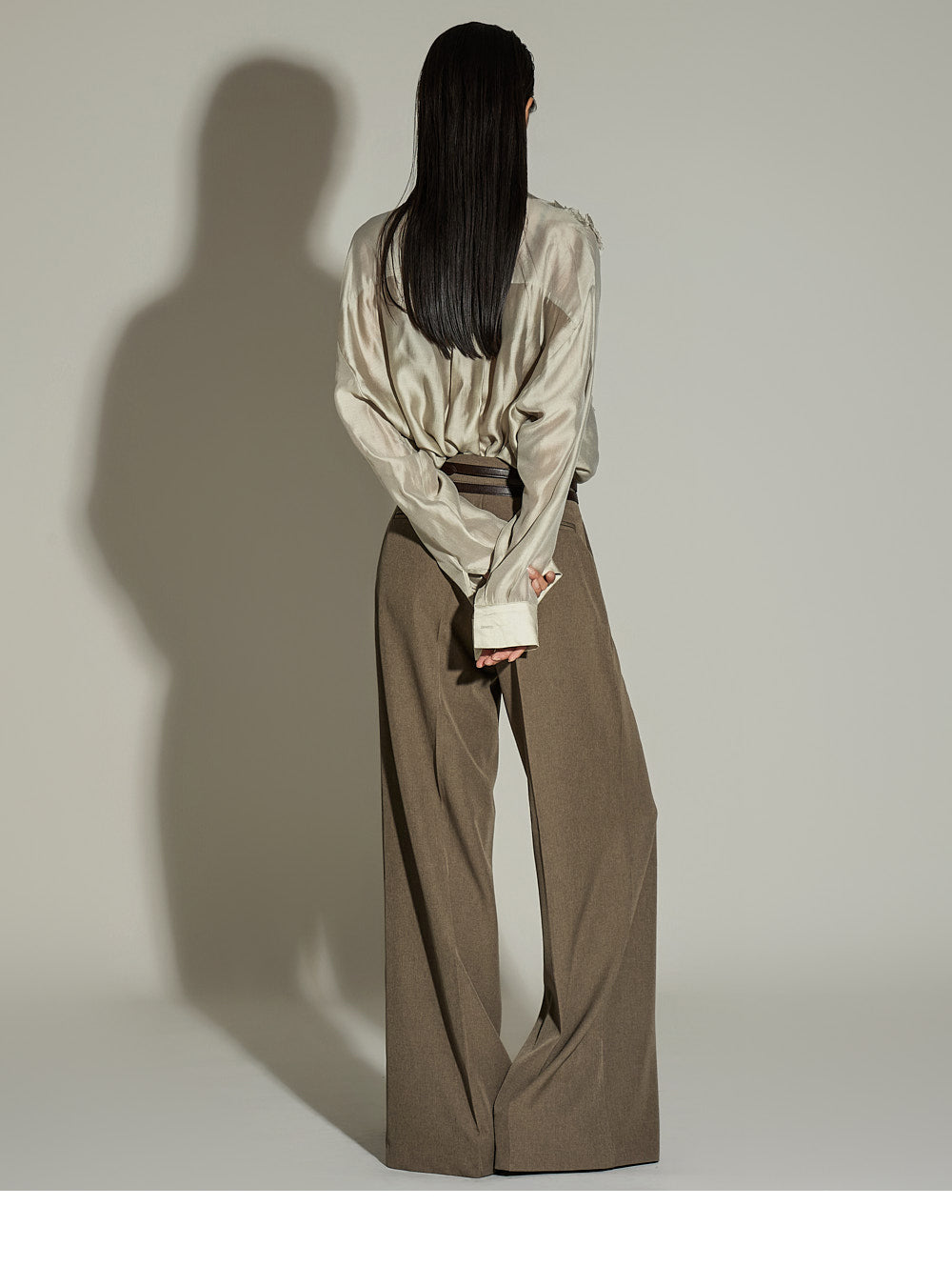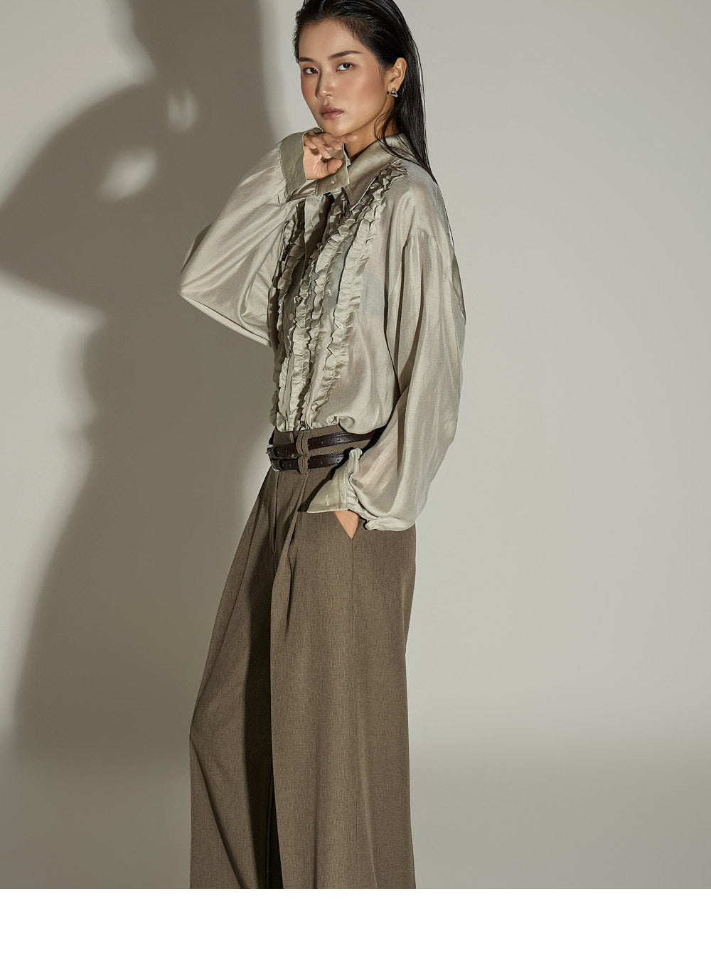 The wide silhouette and front pintuck detailing