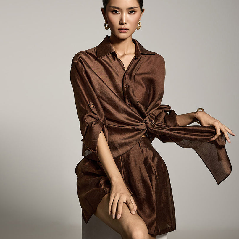 独特的不对称裹身衬衫,采用轻质面料制成