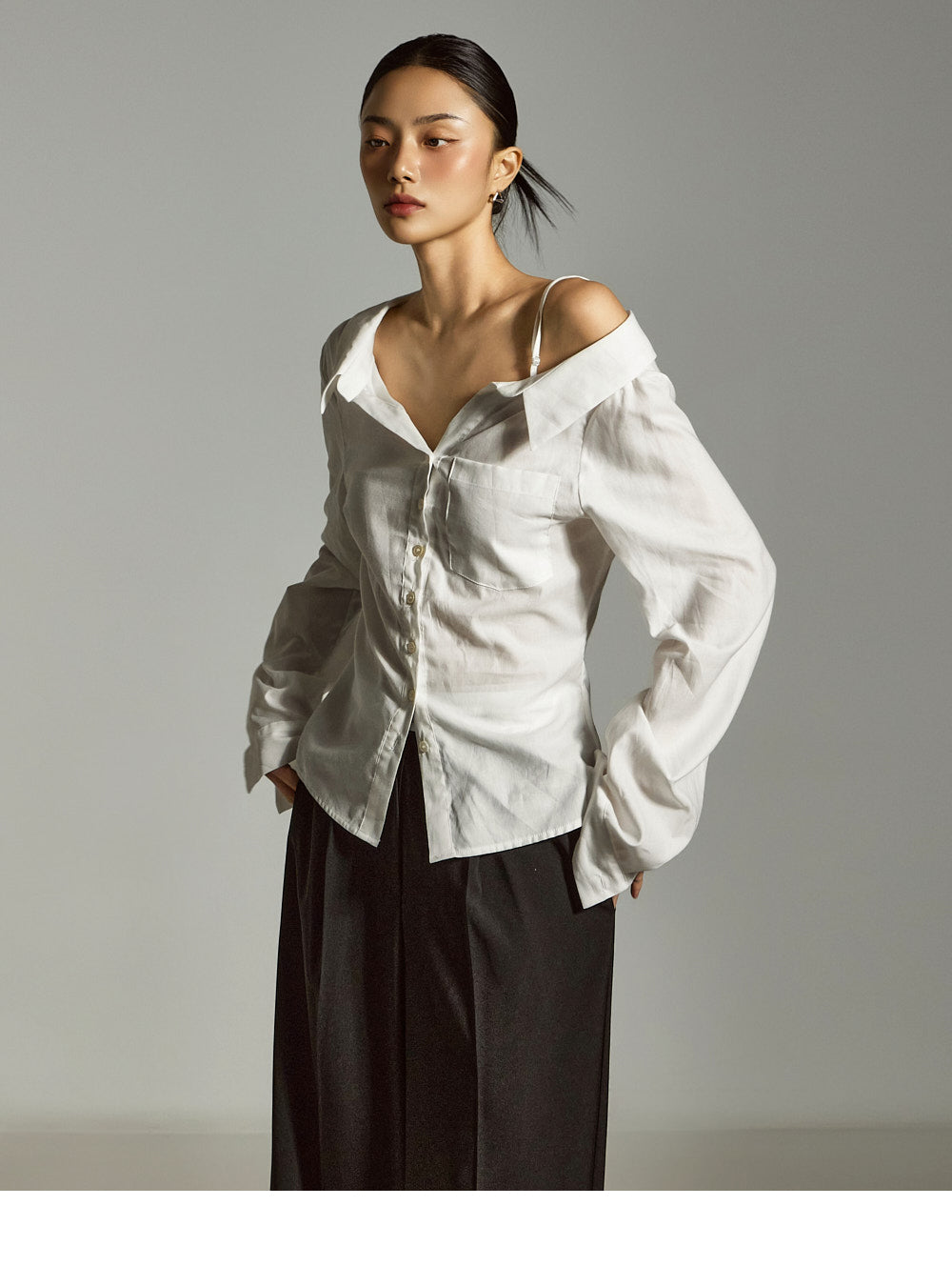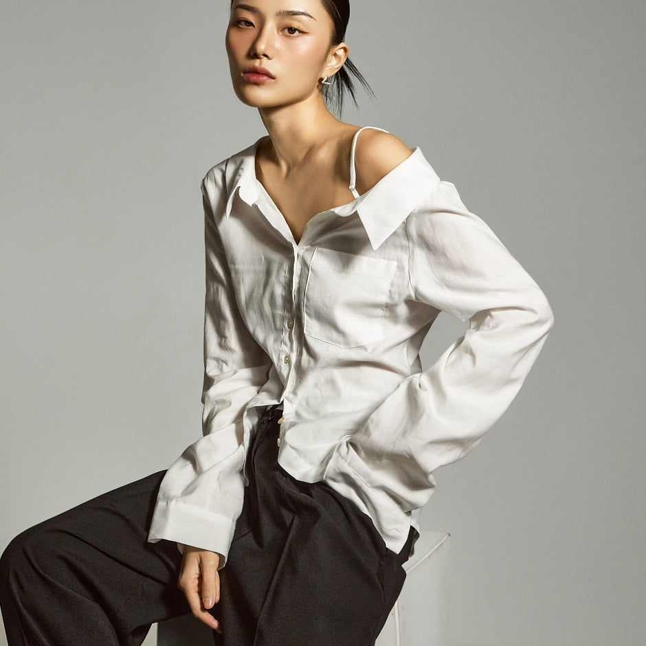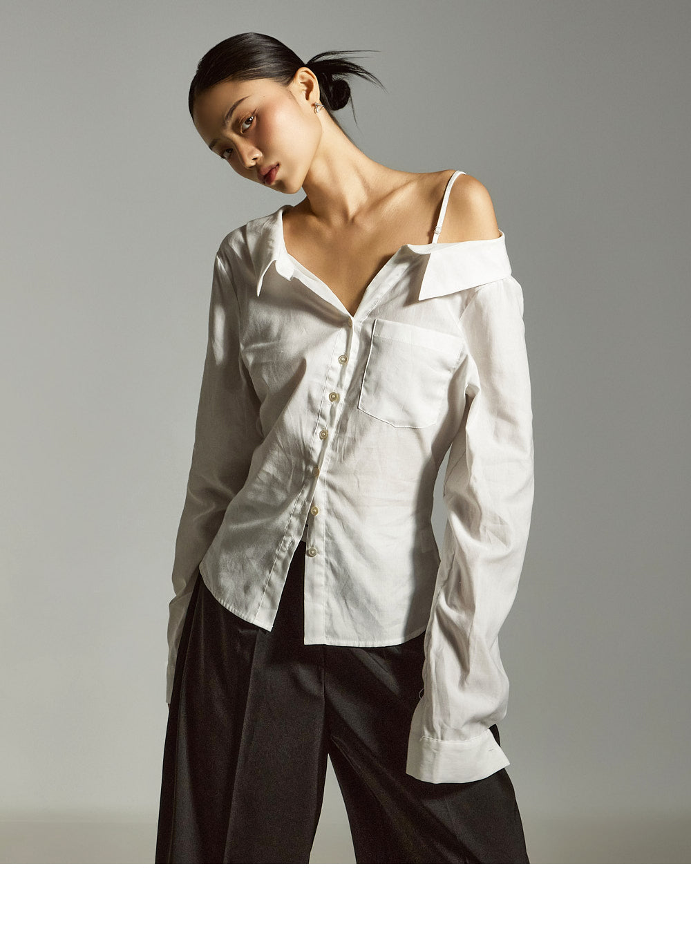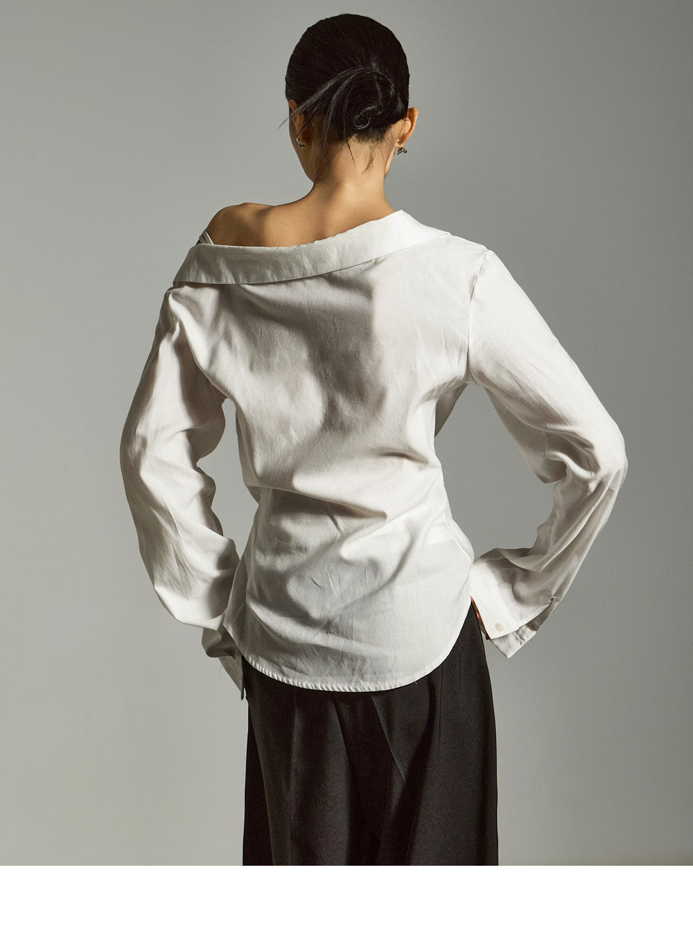不对称露肩设计为经典衬衫增添了独特的韵味,