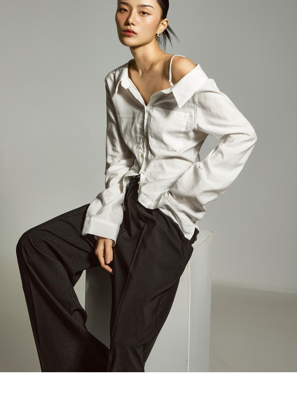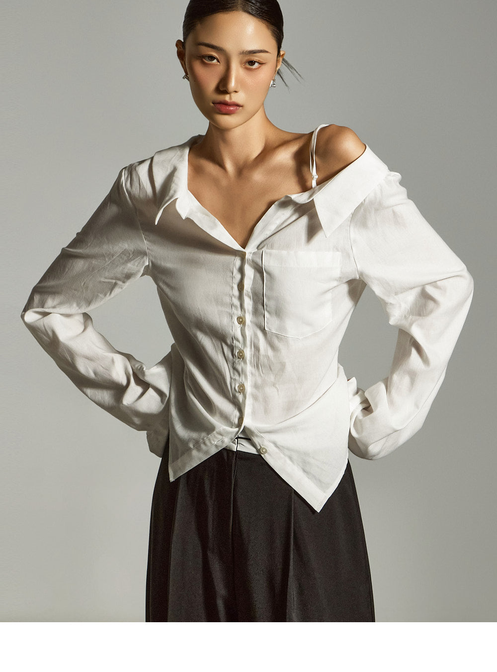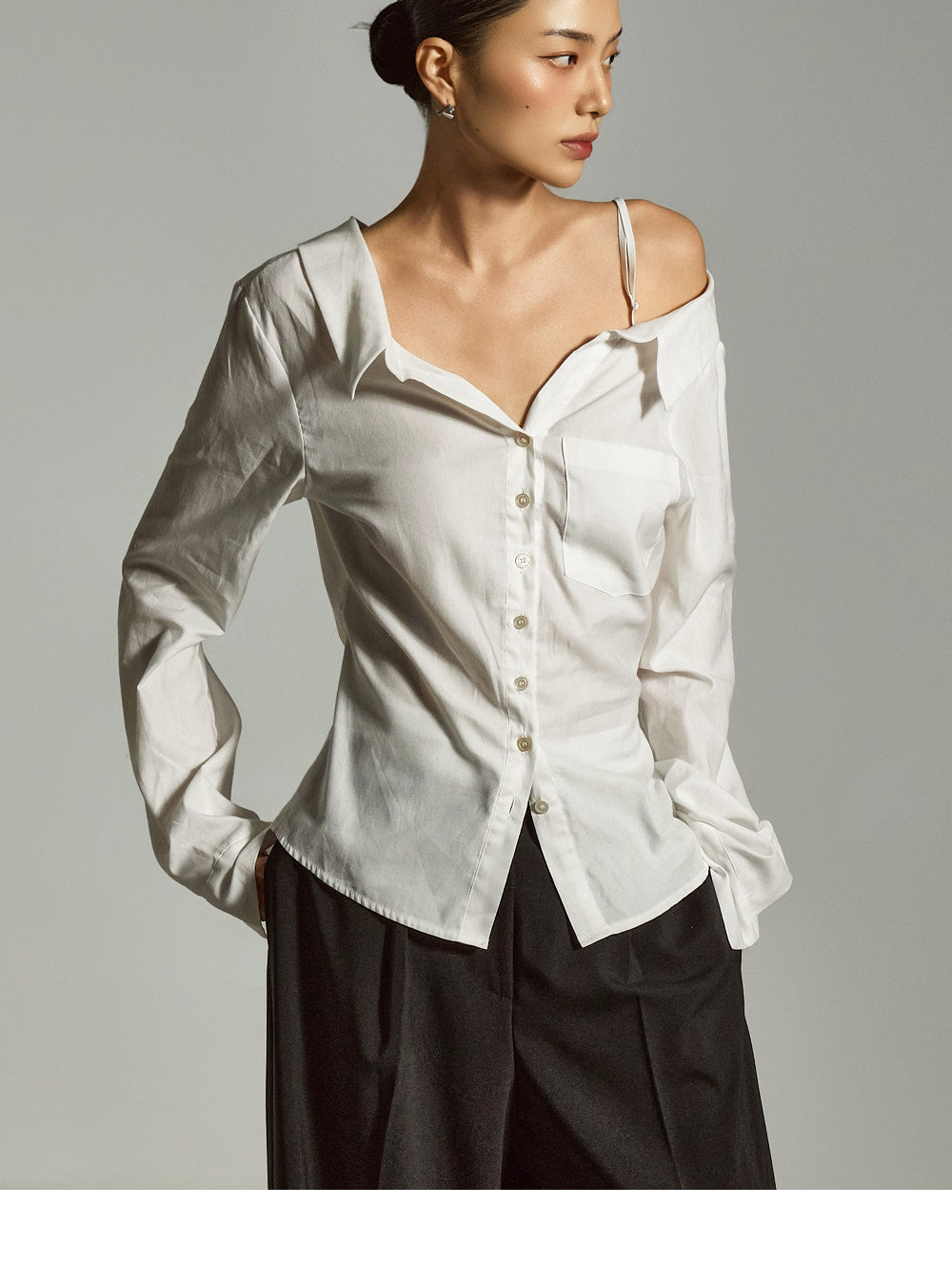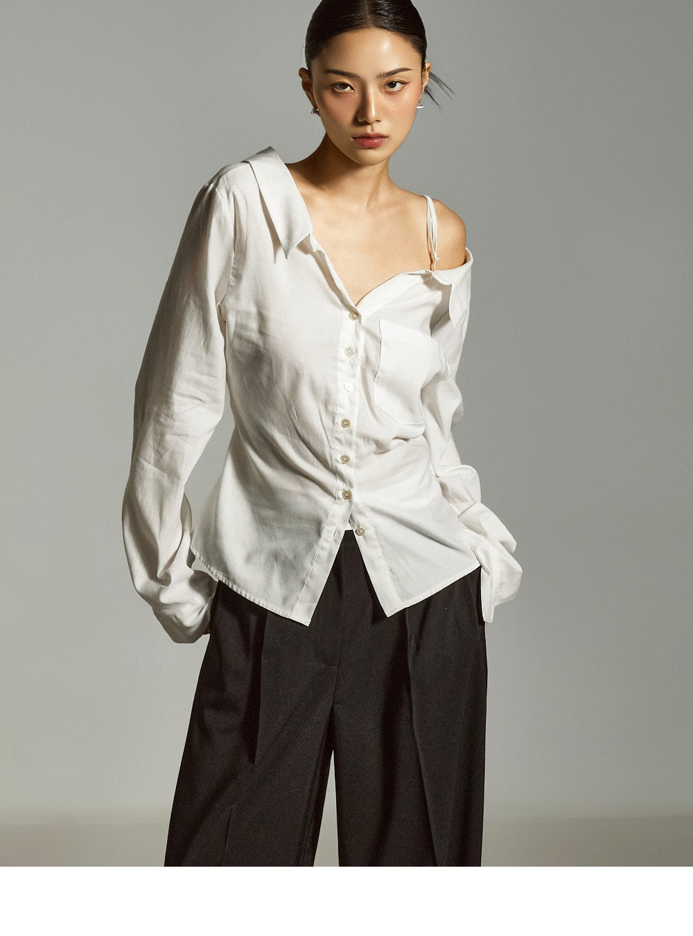 不对称露肩设计为经典衬衫增添了独特的韵味,