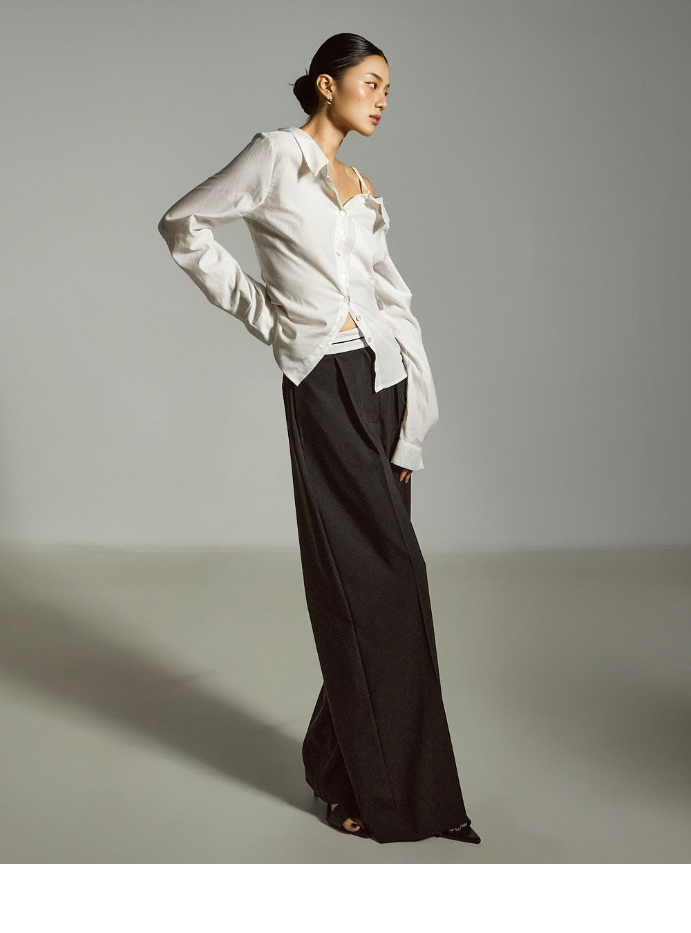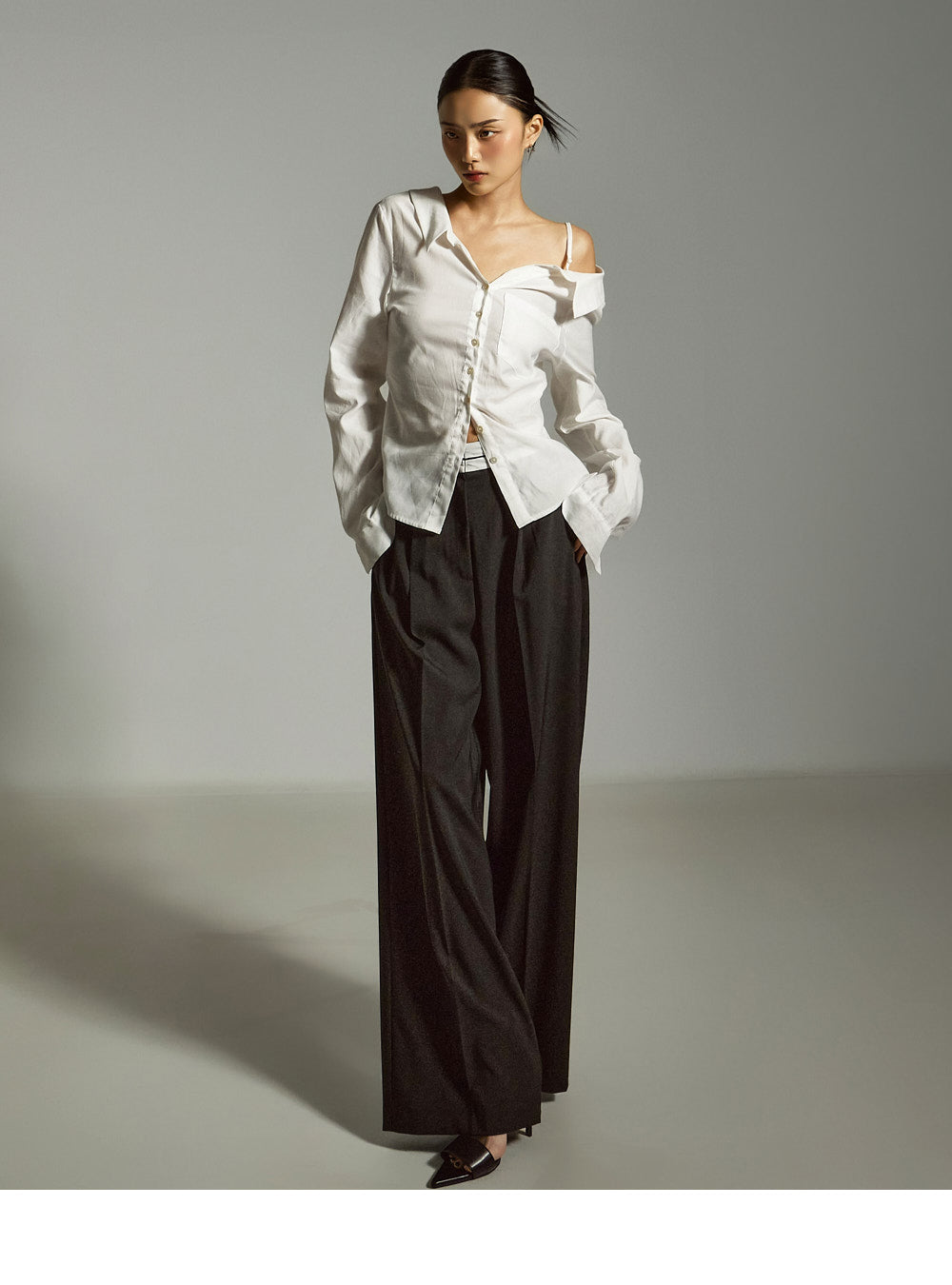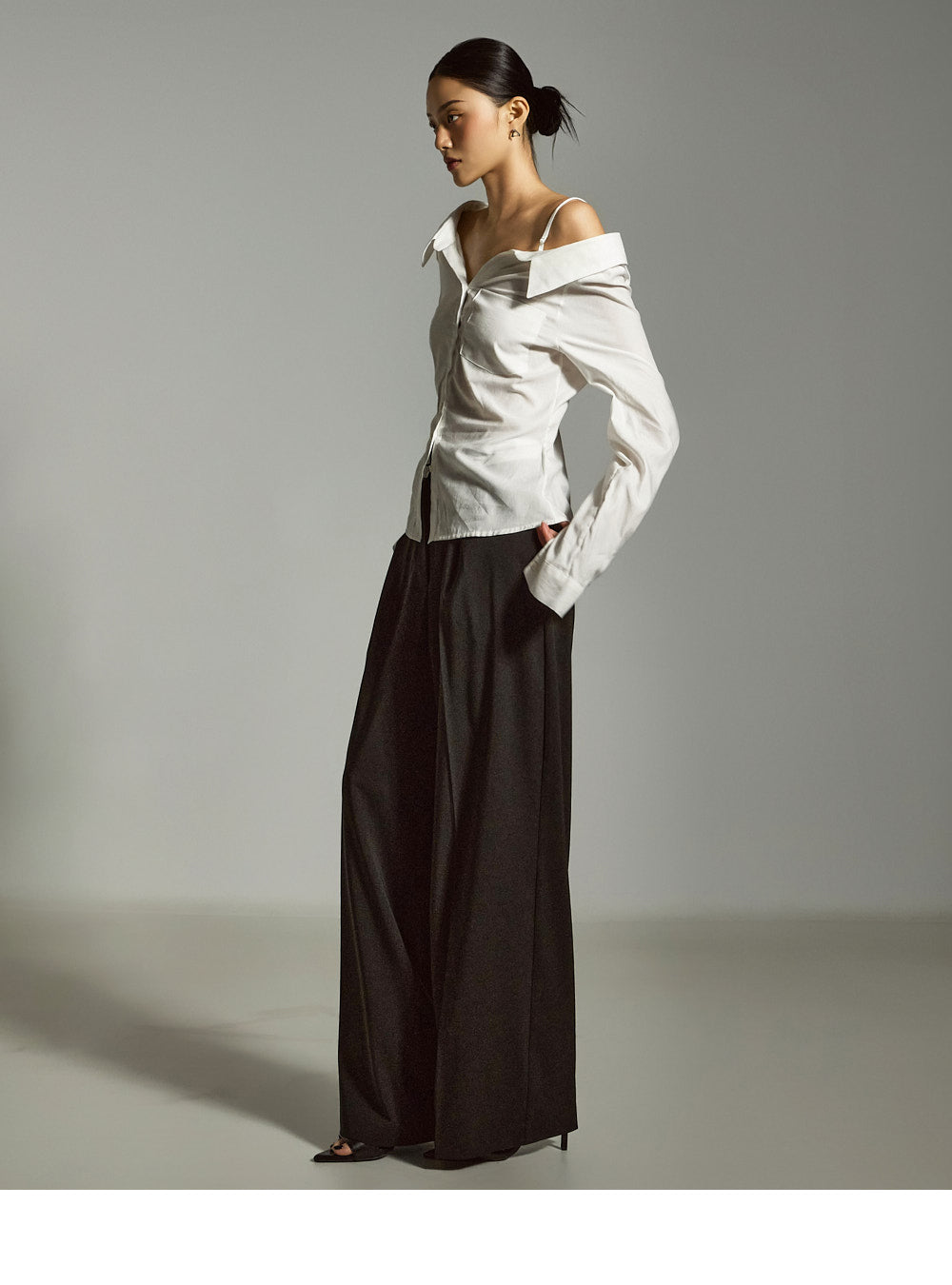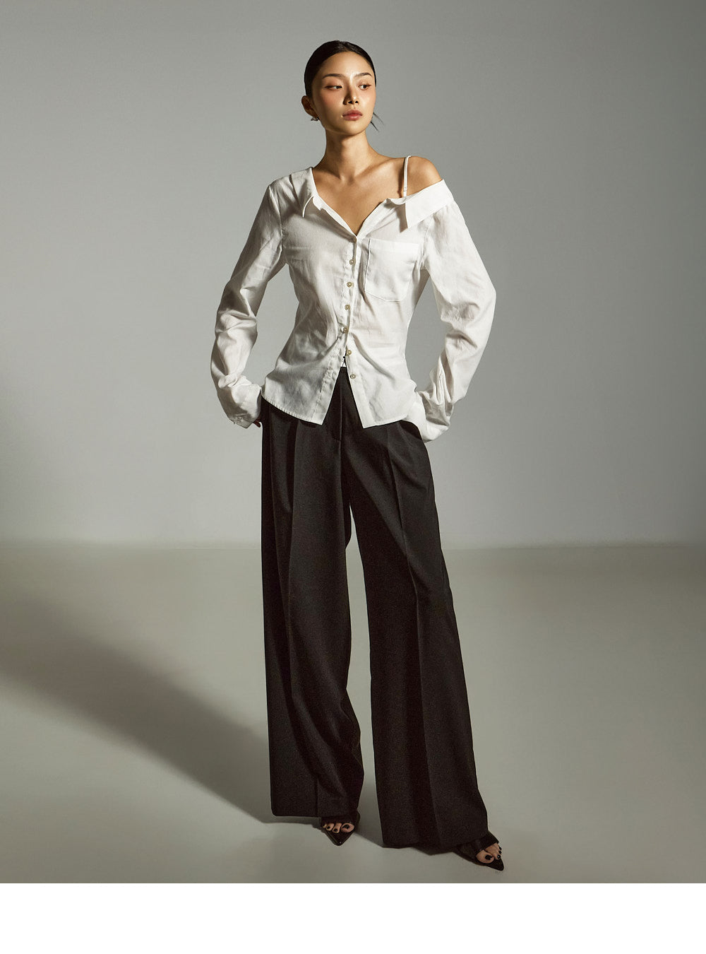 不对称露肩设计为经典衬衫增添了独特的韵味,