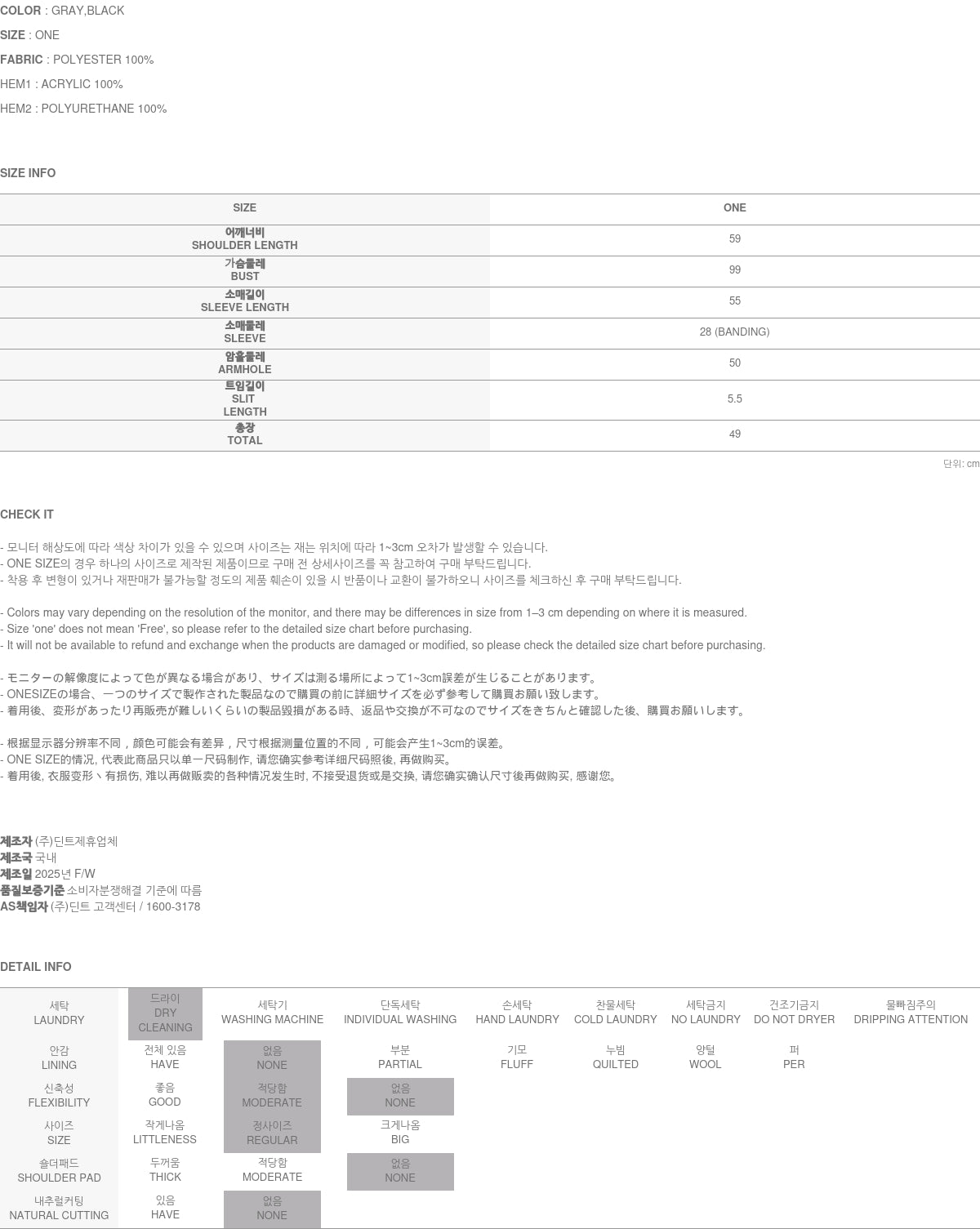 The model is 171cm tall and wears ONE size in gray.