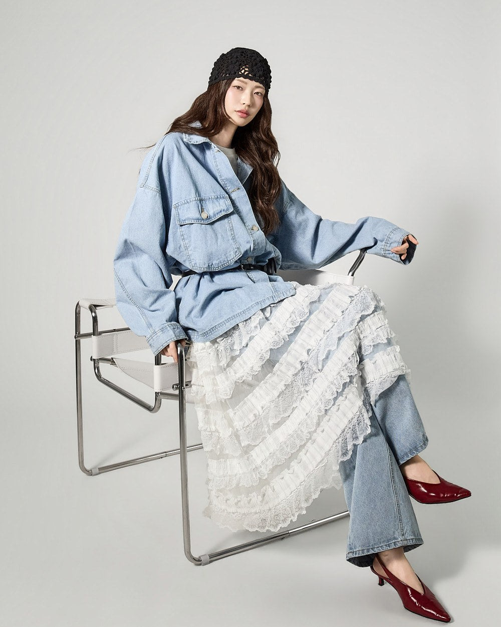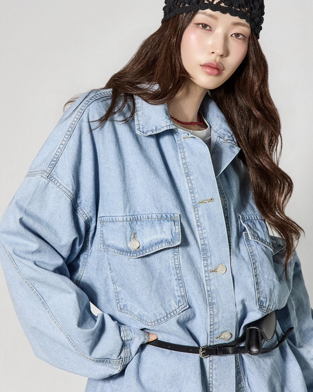 A 171cm model is wearing size ONE in LIGHT BLUE,color.