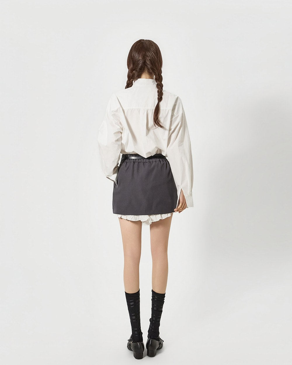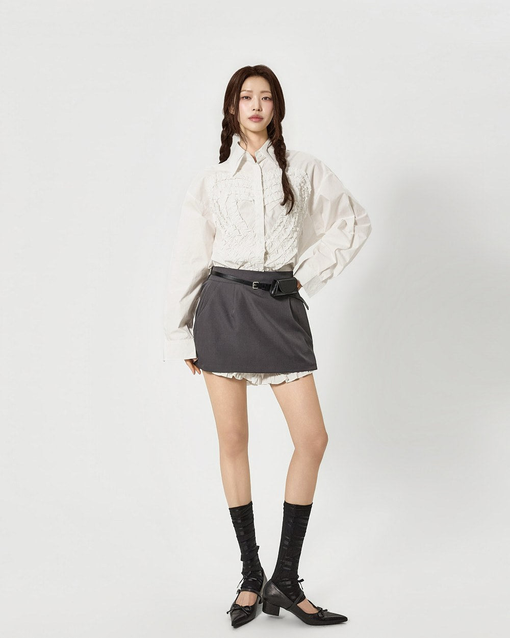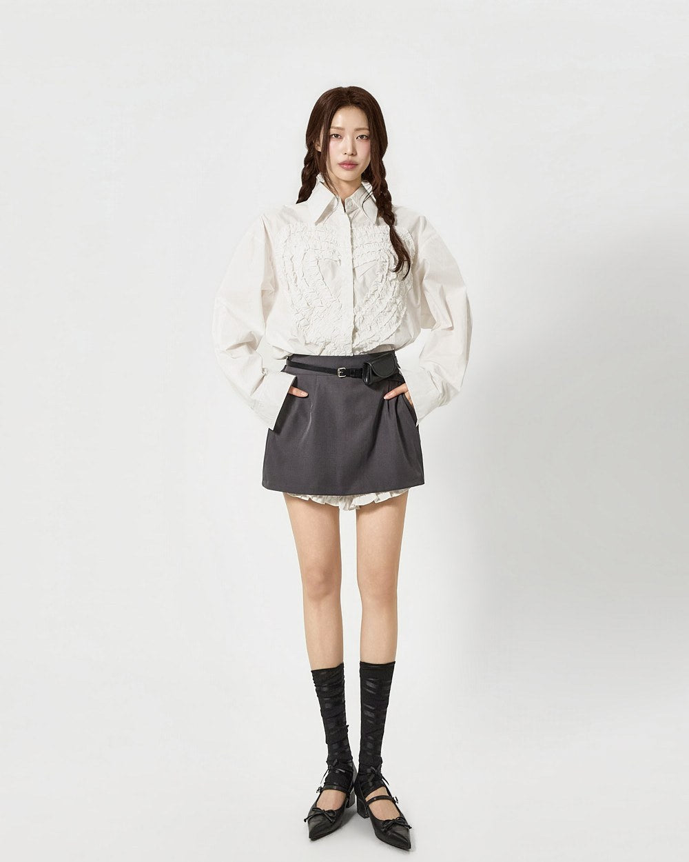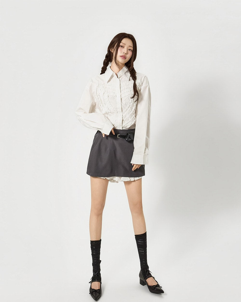 这是一款具有独特气质的荷叶边衬衫。