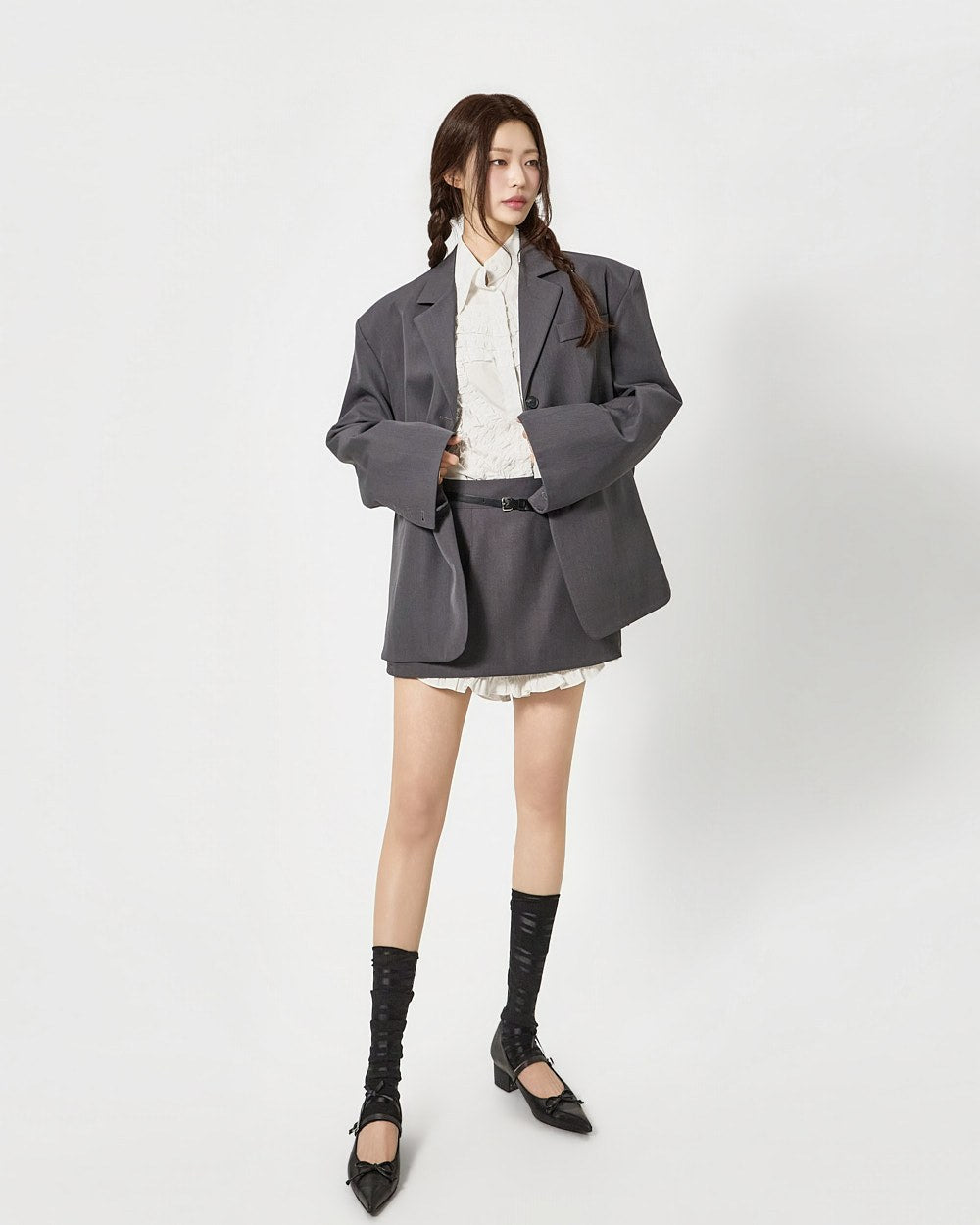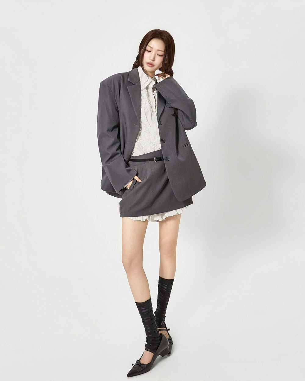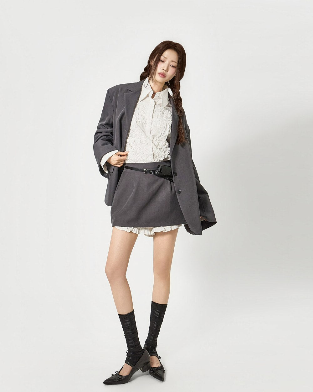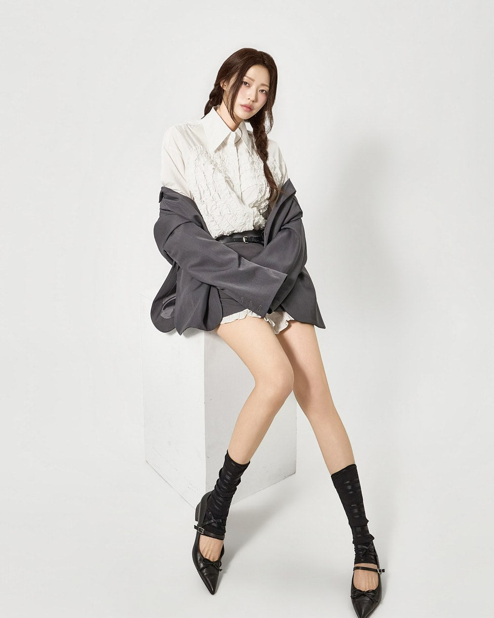 这是一款具有独特气质的荷叶边衬衫。