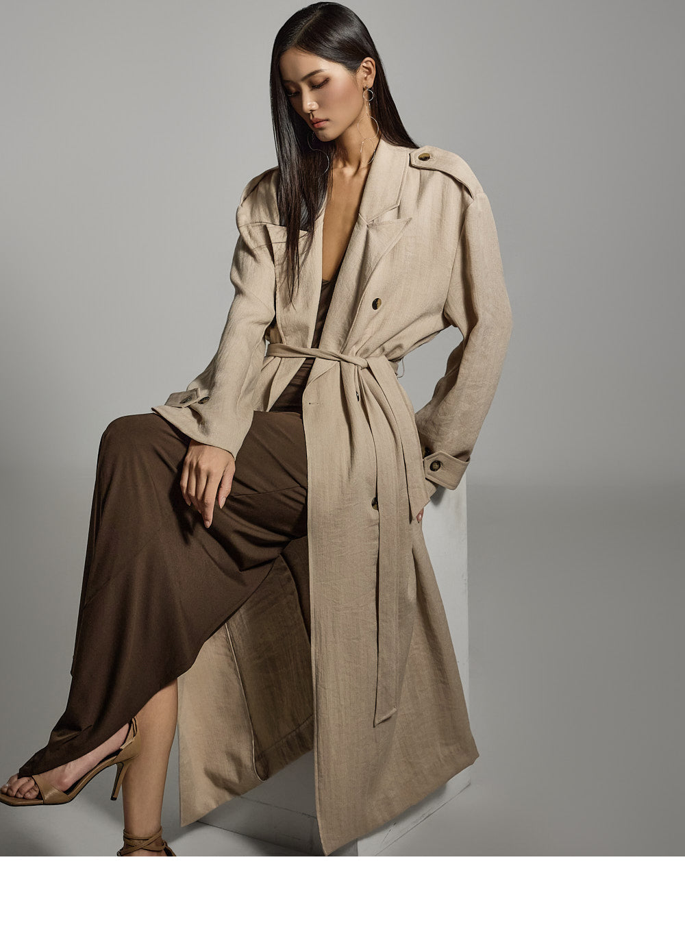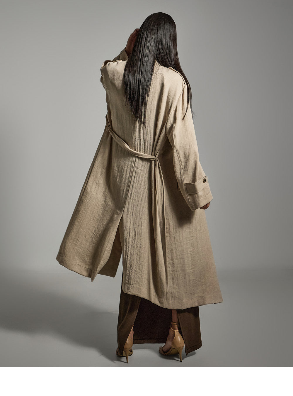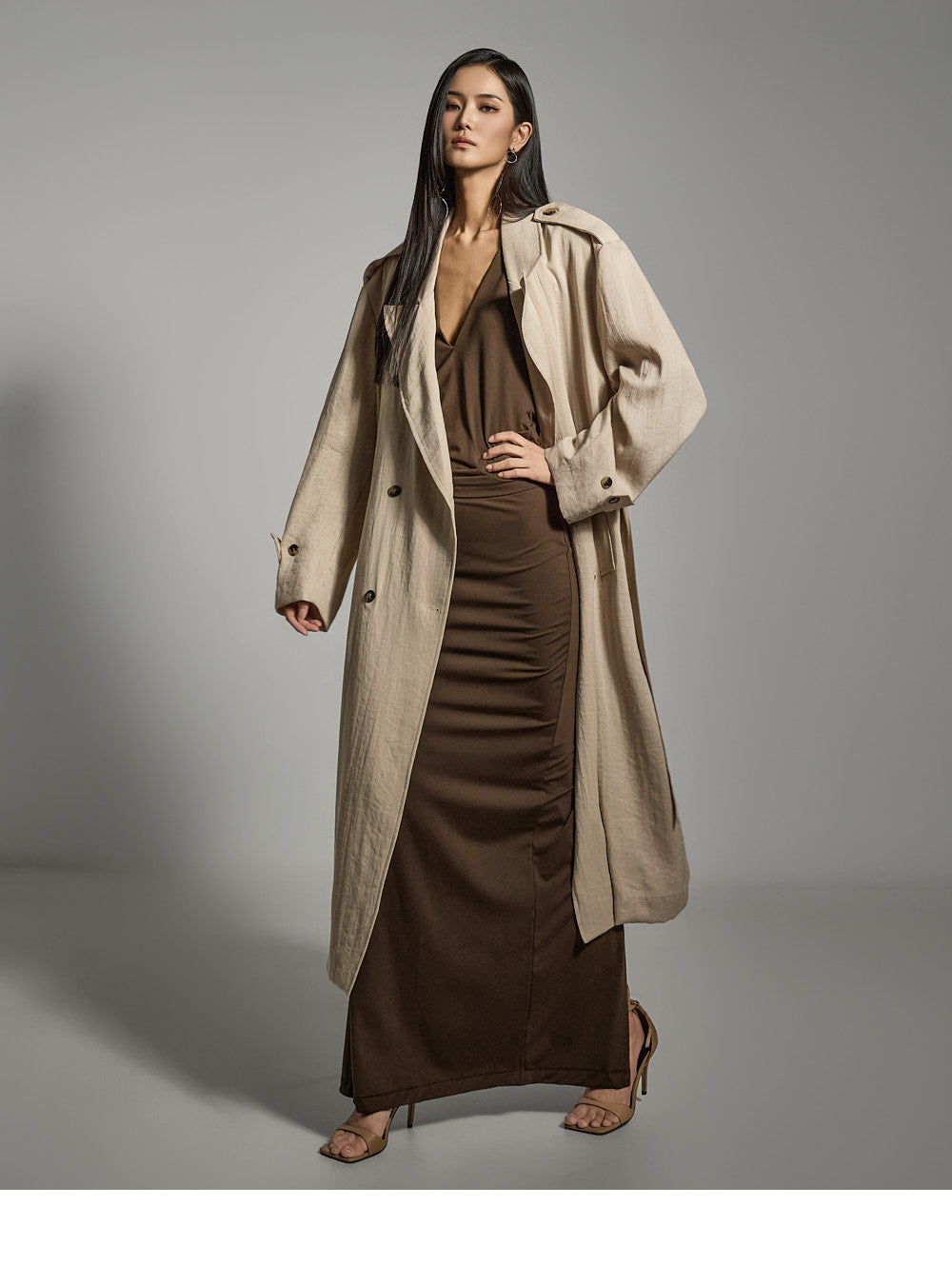 H 型廓形和长款长度营造出纤细、利落的线条,