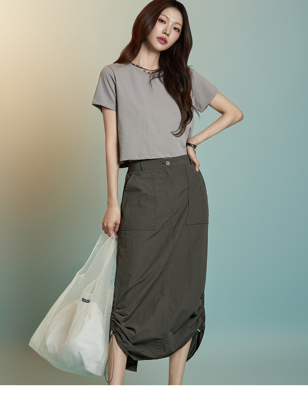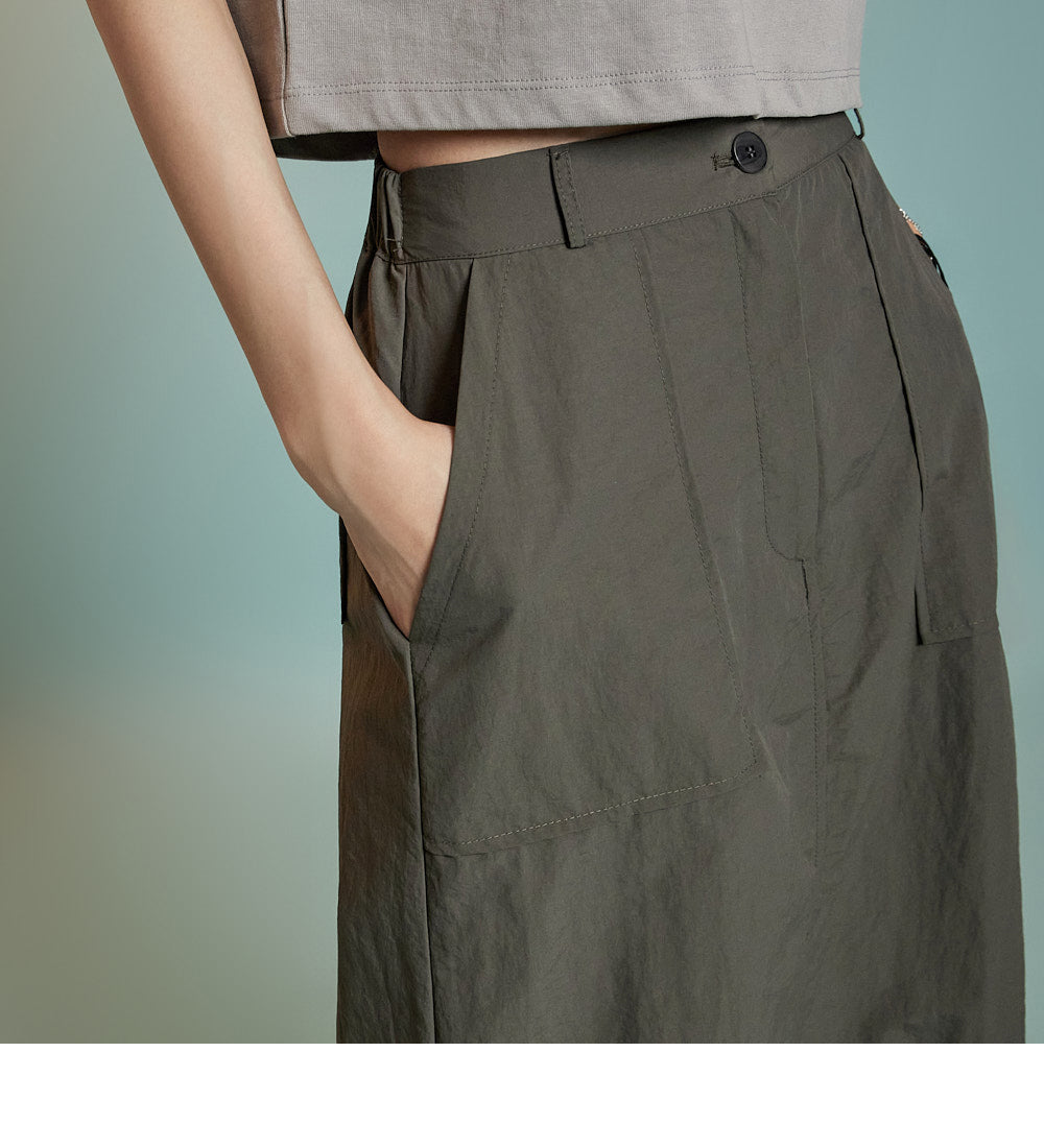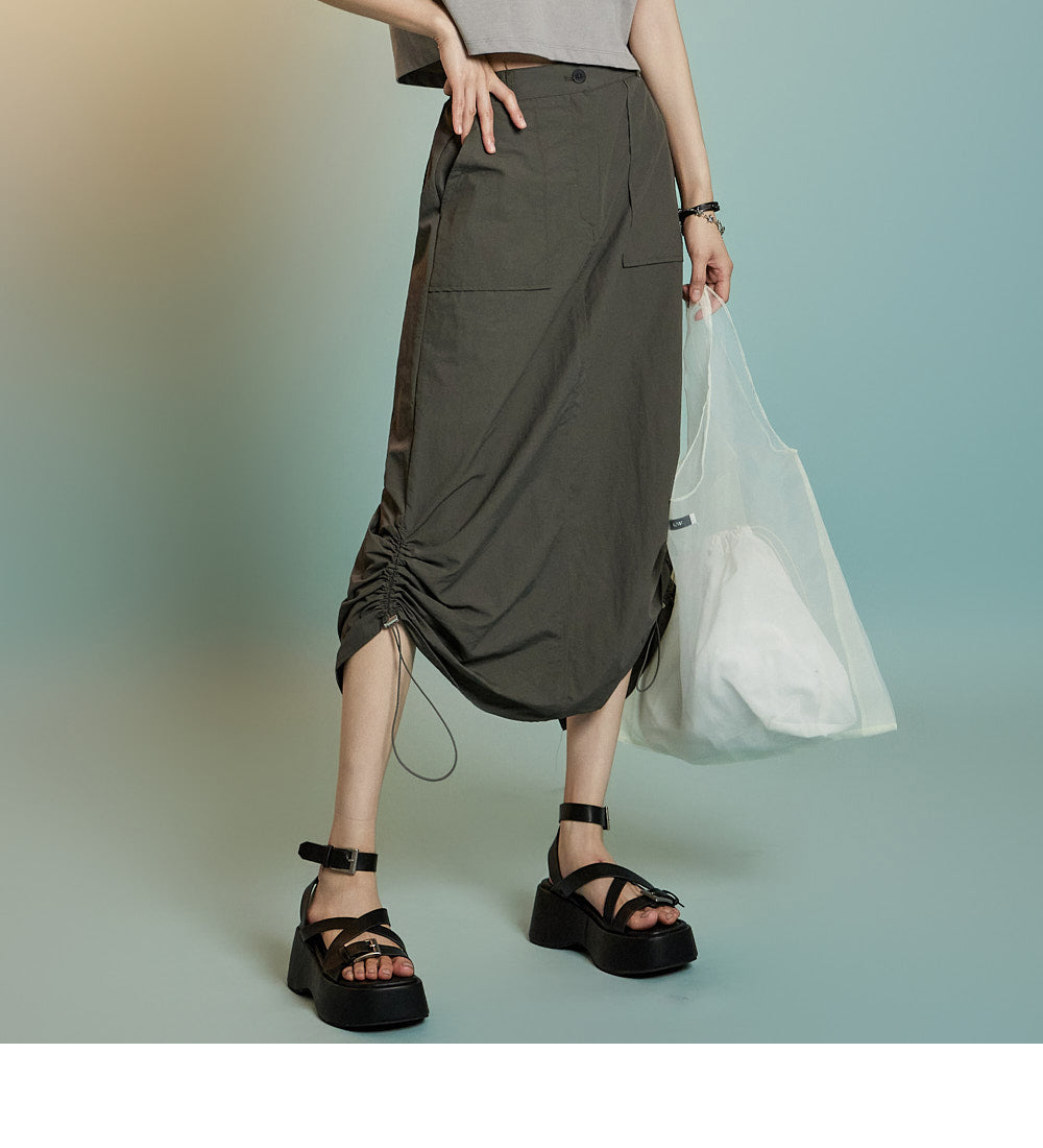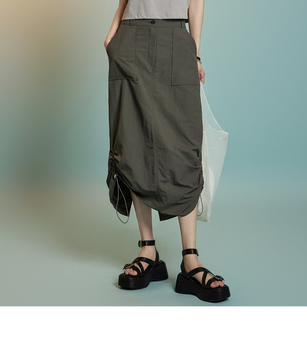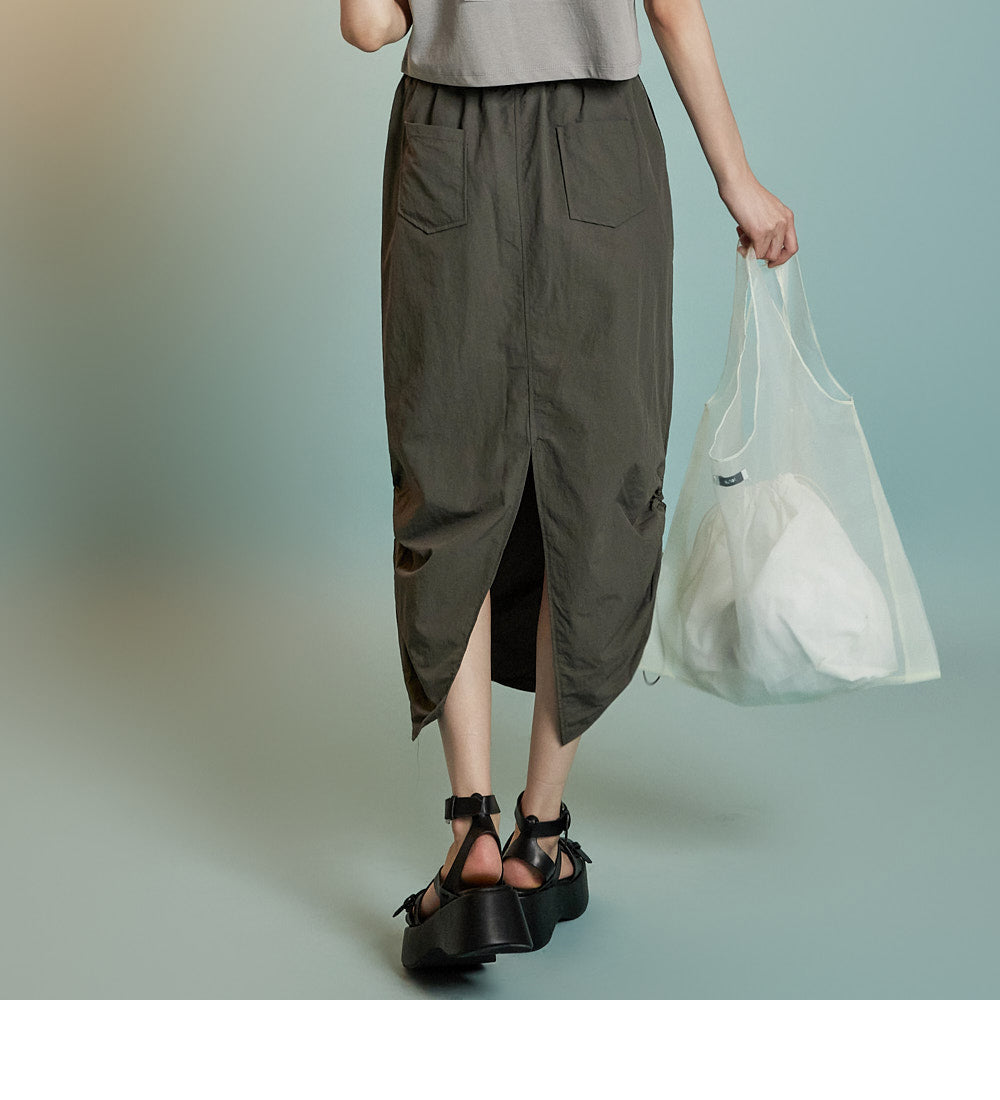 模特身高 171 厘米,穿着均码的深炭灰色衣服。