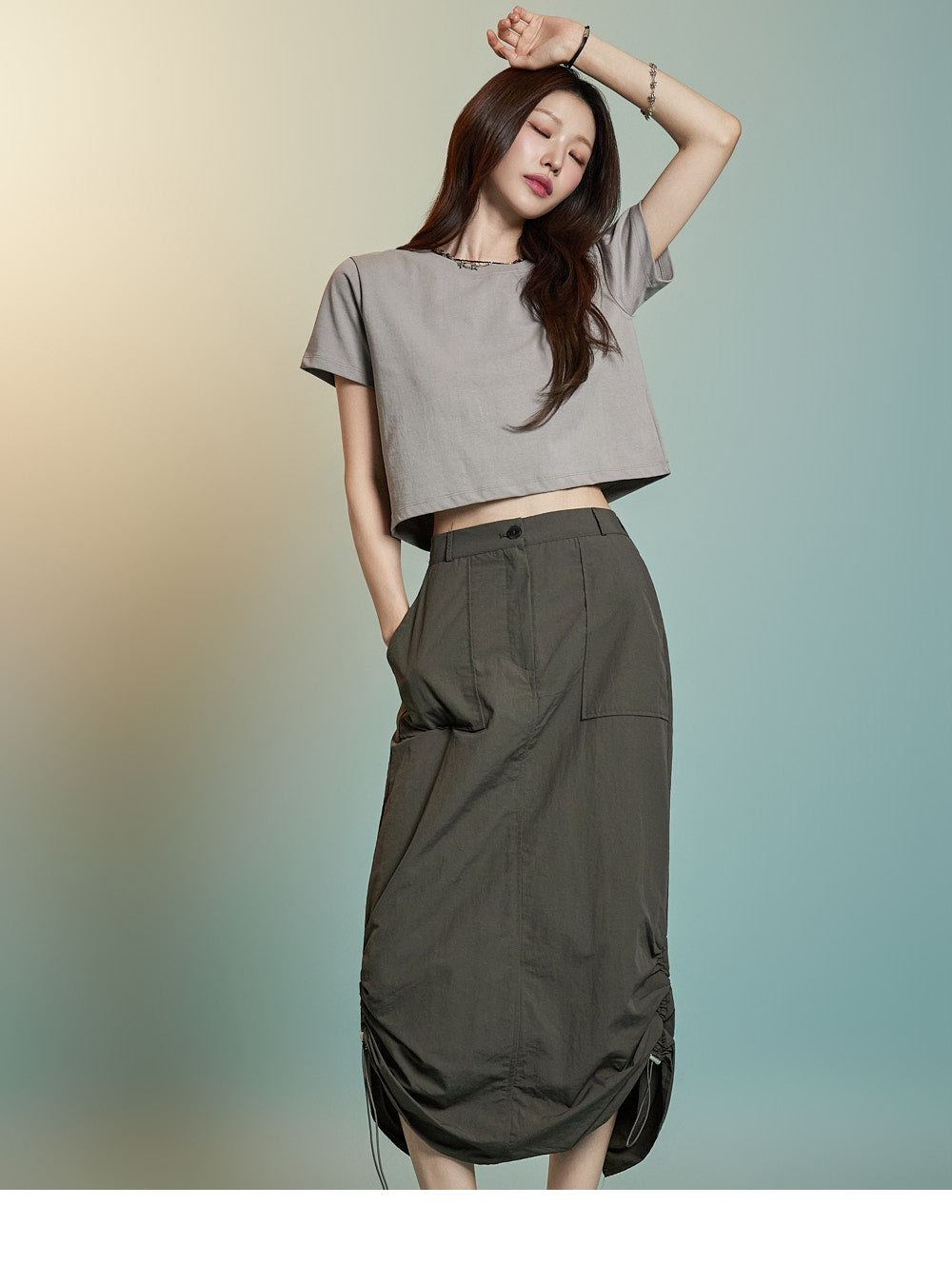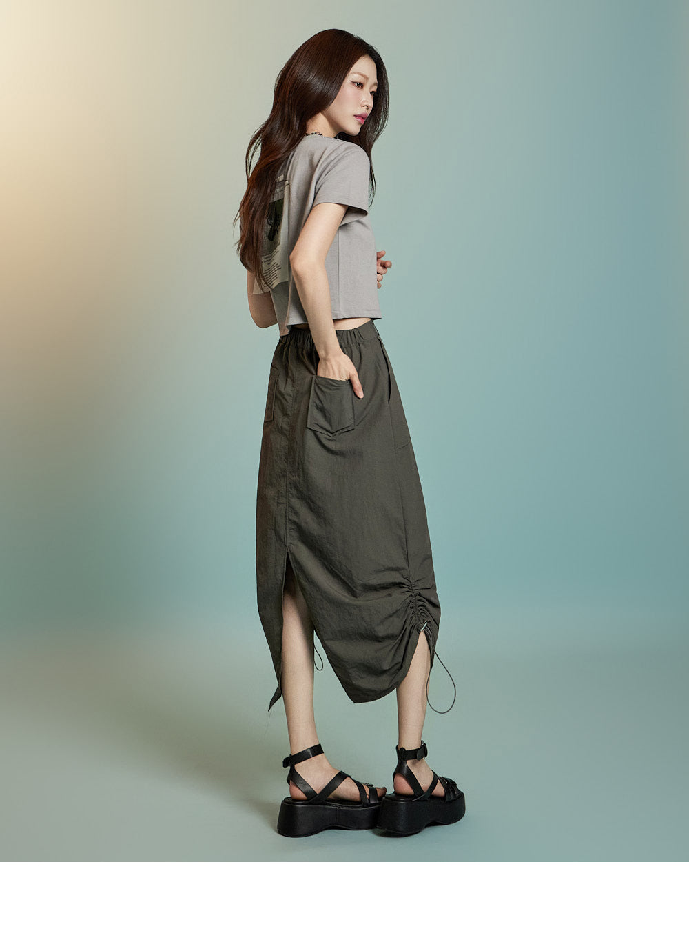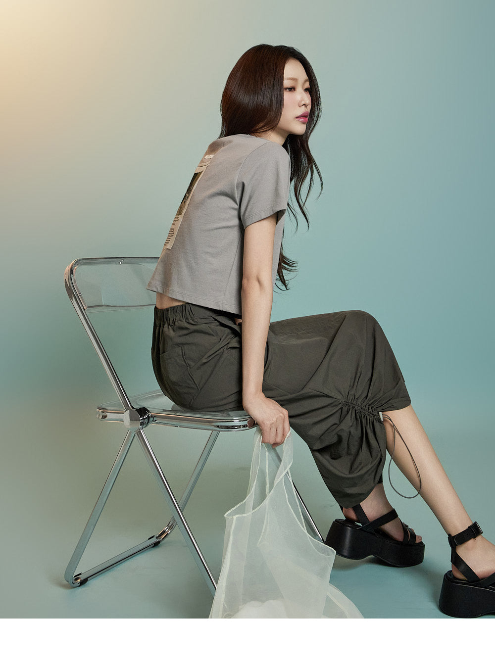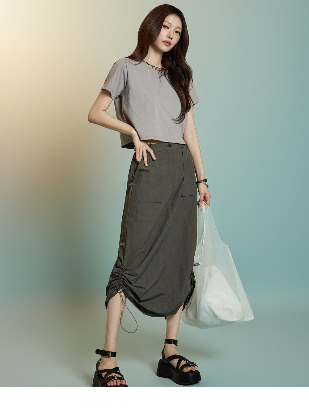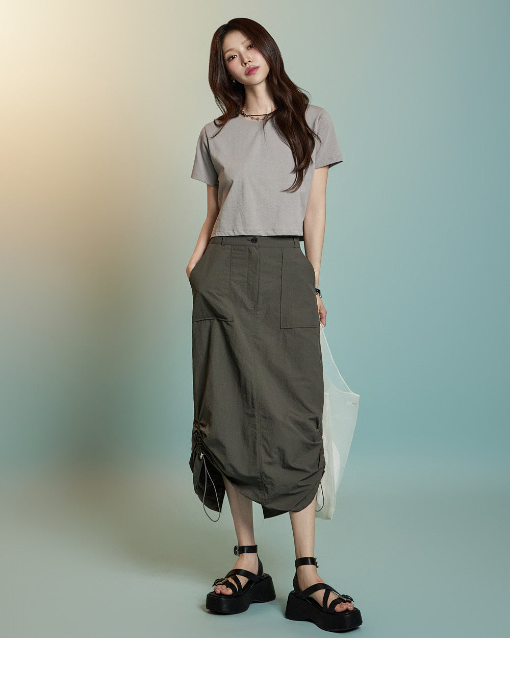 模特身高 171 厘米,穿着均码的深炭灰色衣服。