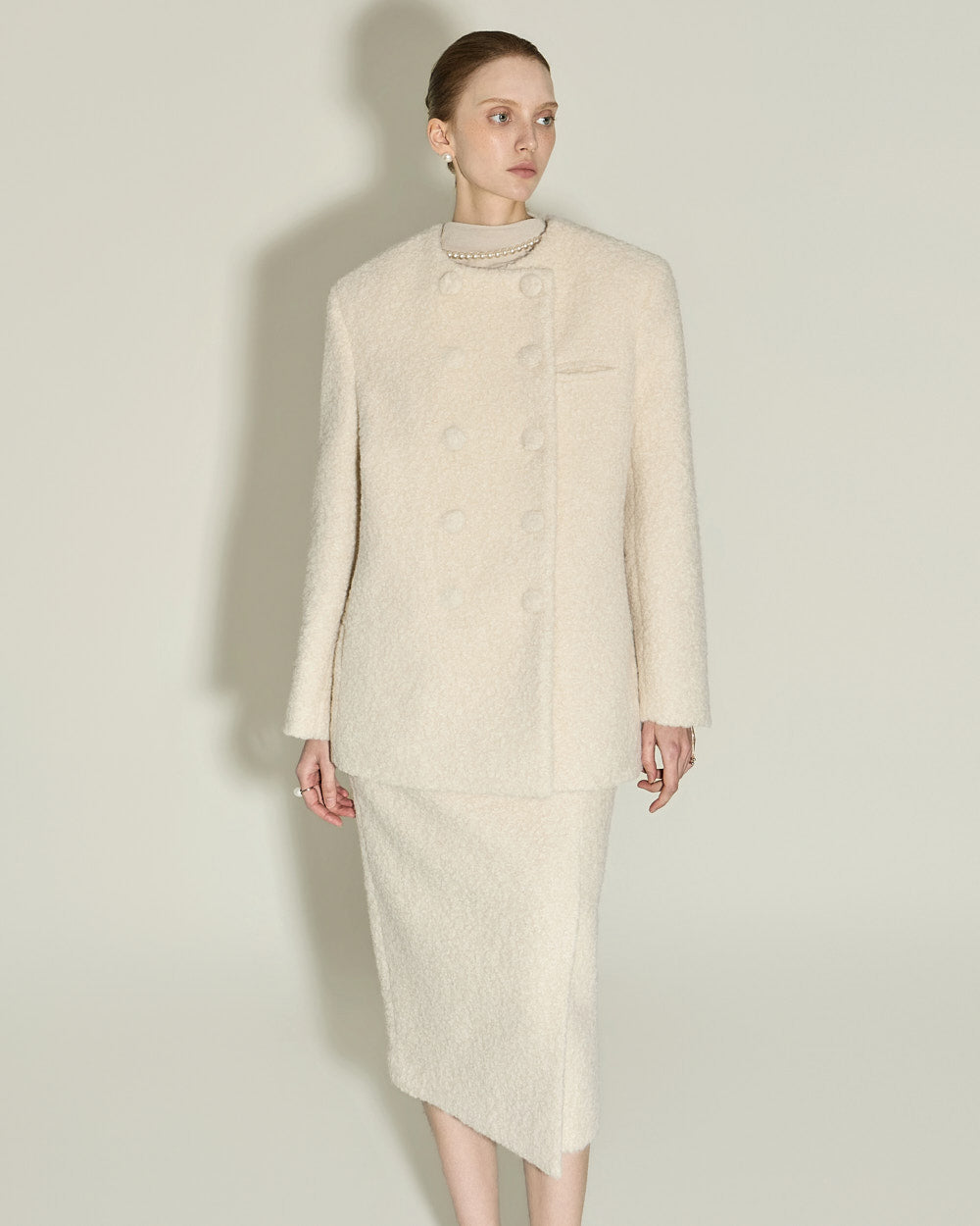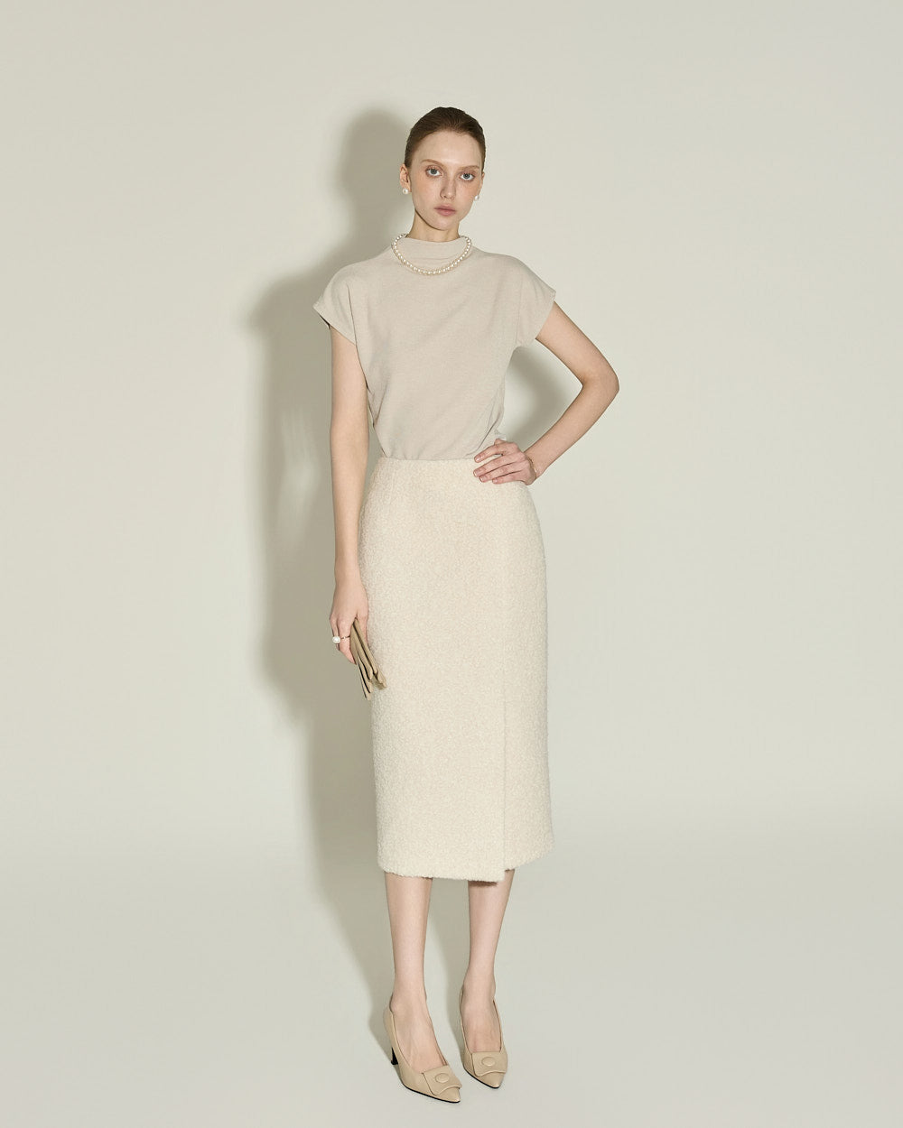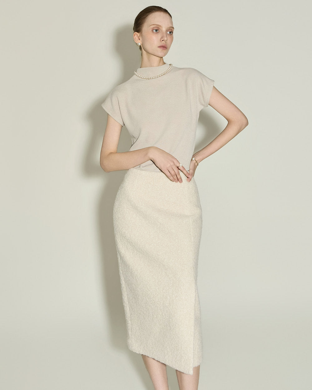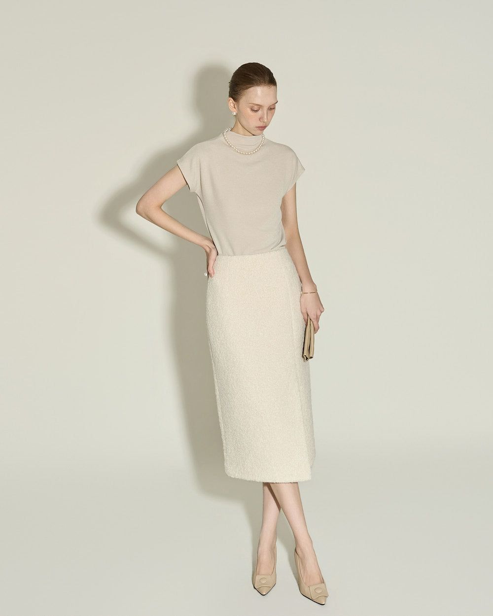 A minimalist bouclé slit skirt.