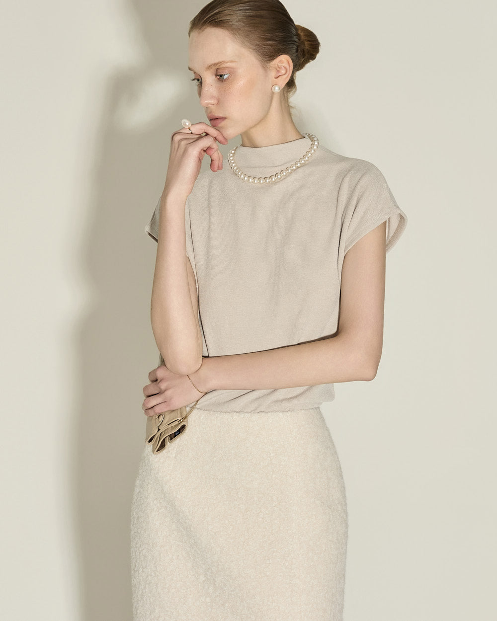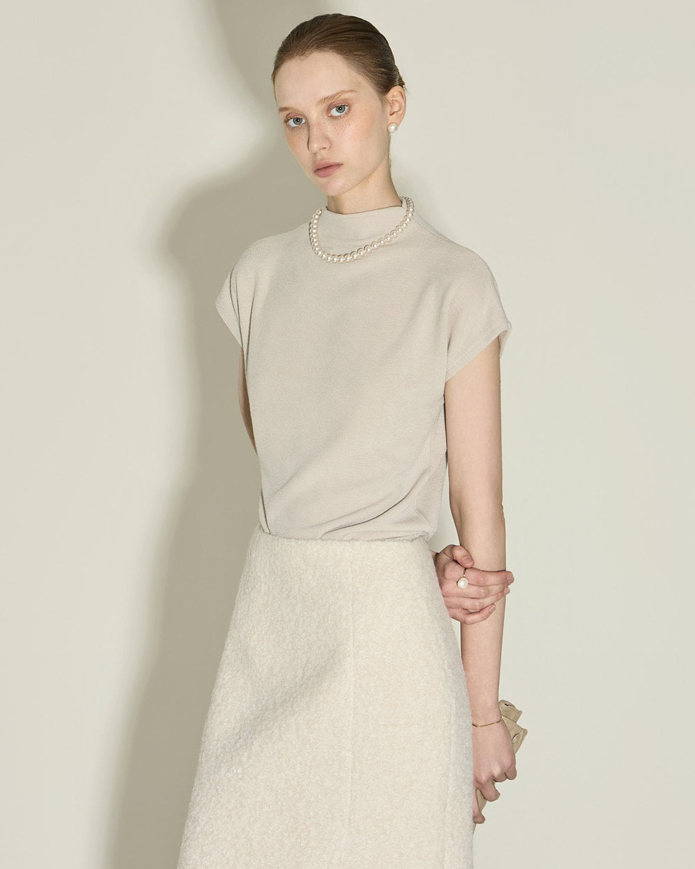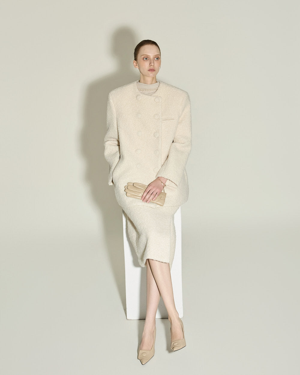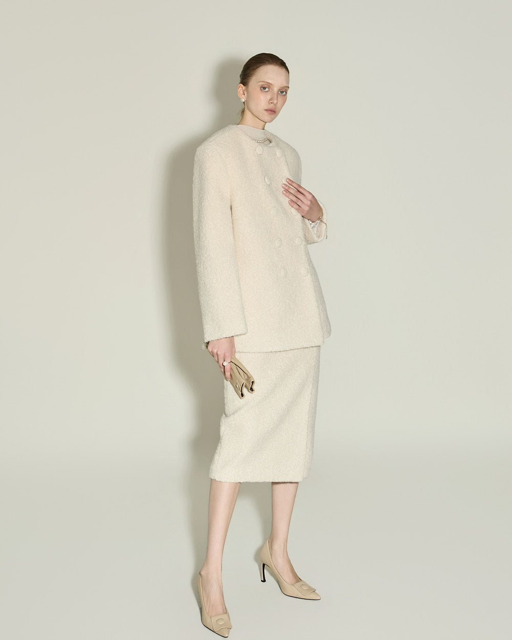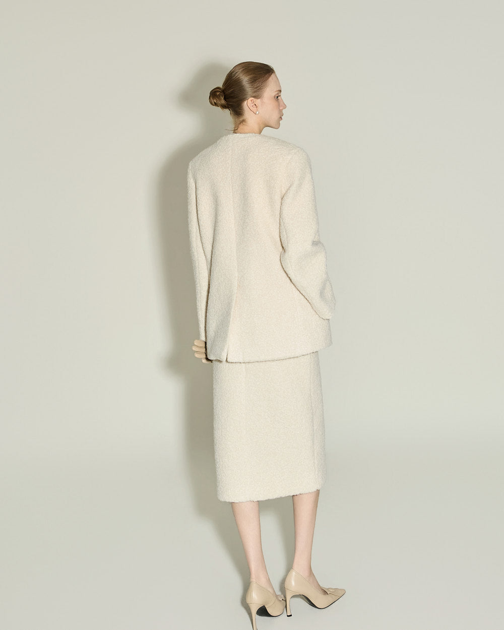 A minimalist bouclé slit skirt.