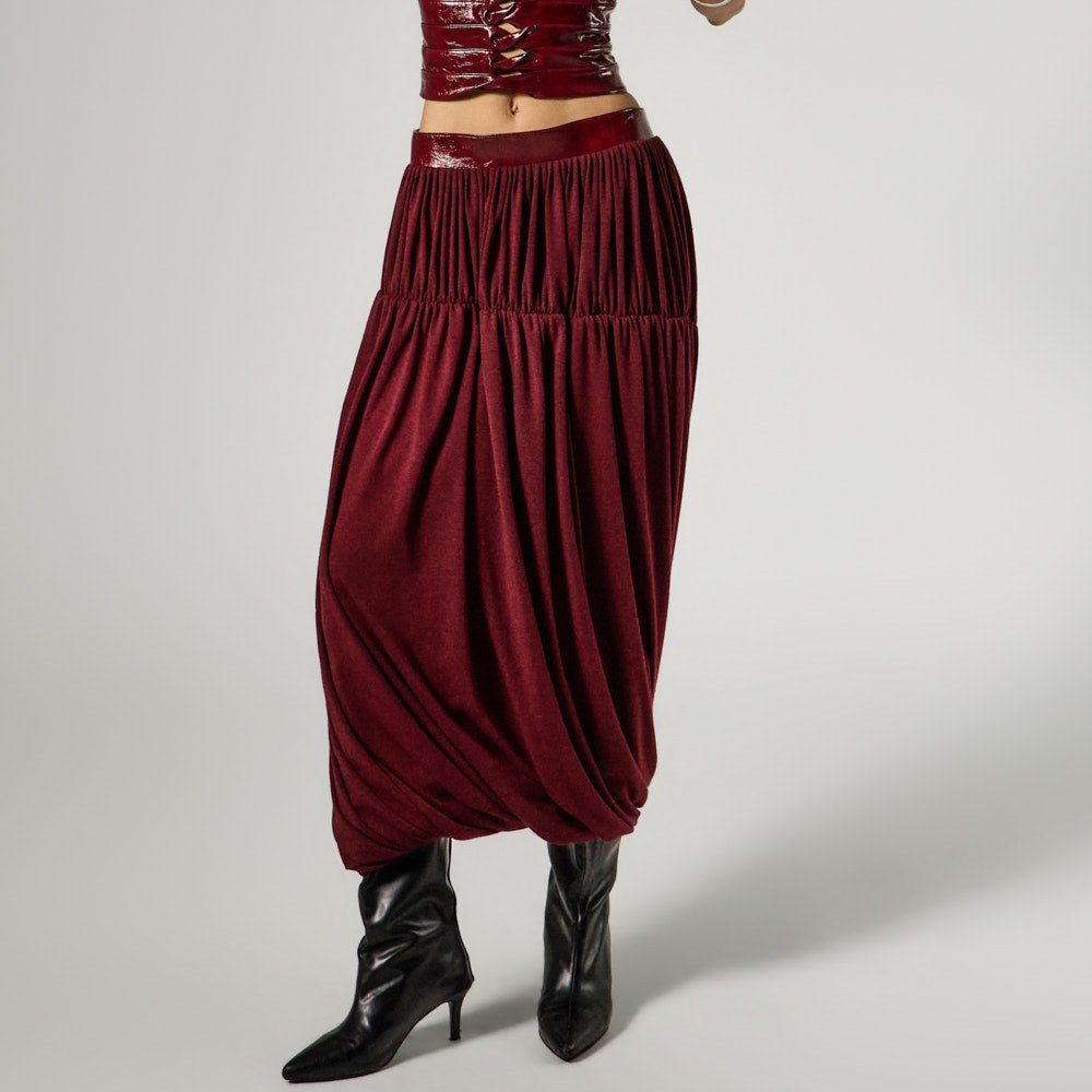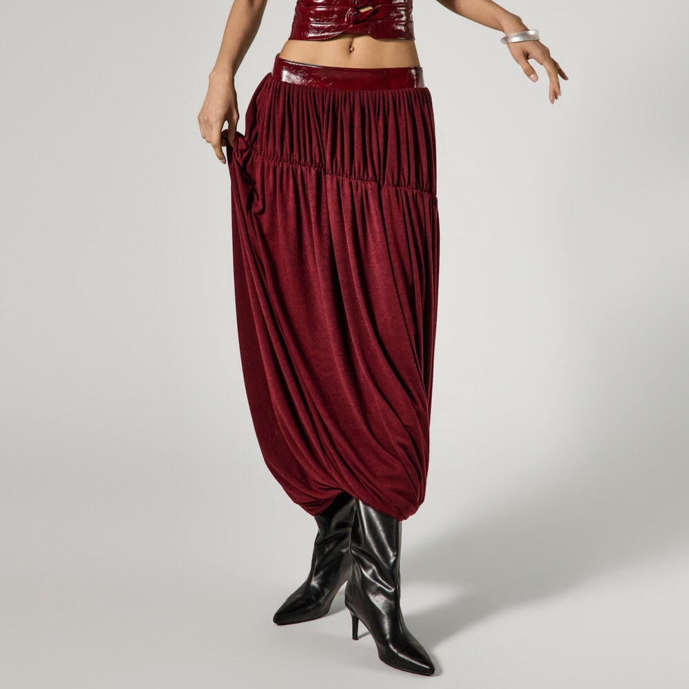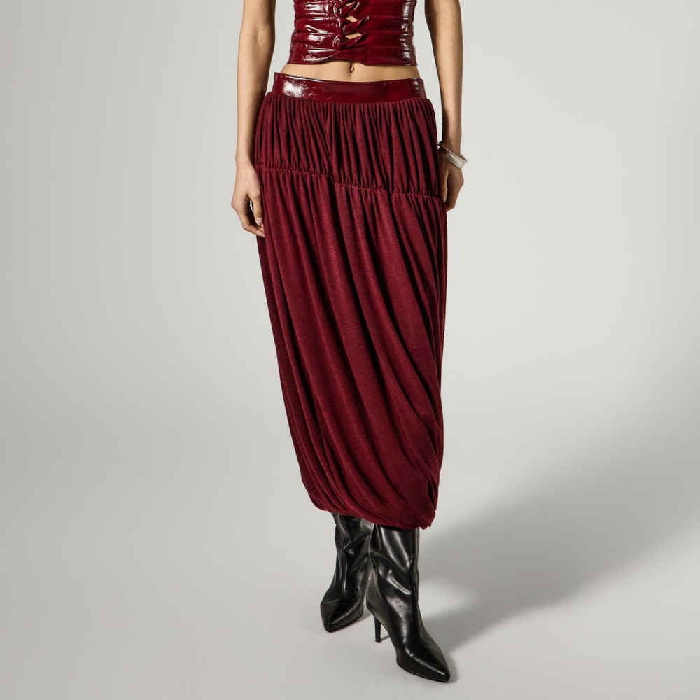 This unique rune shirring skirt is perfect for styling as a statement piece.