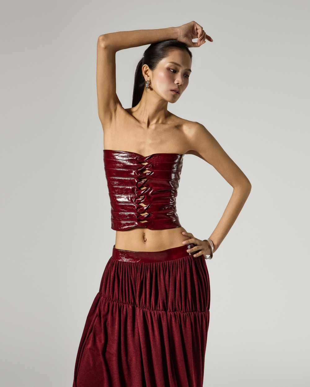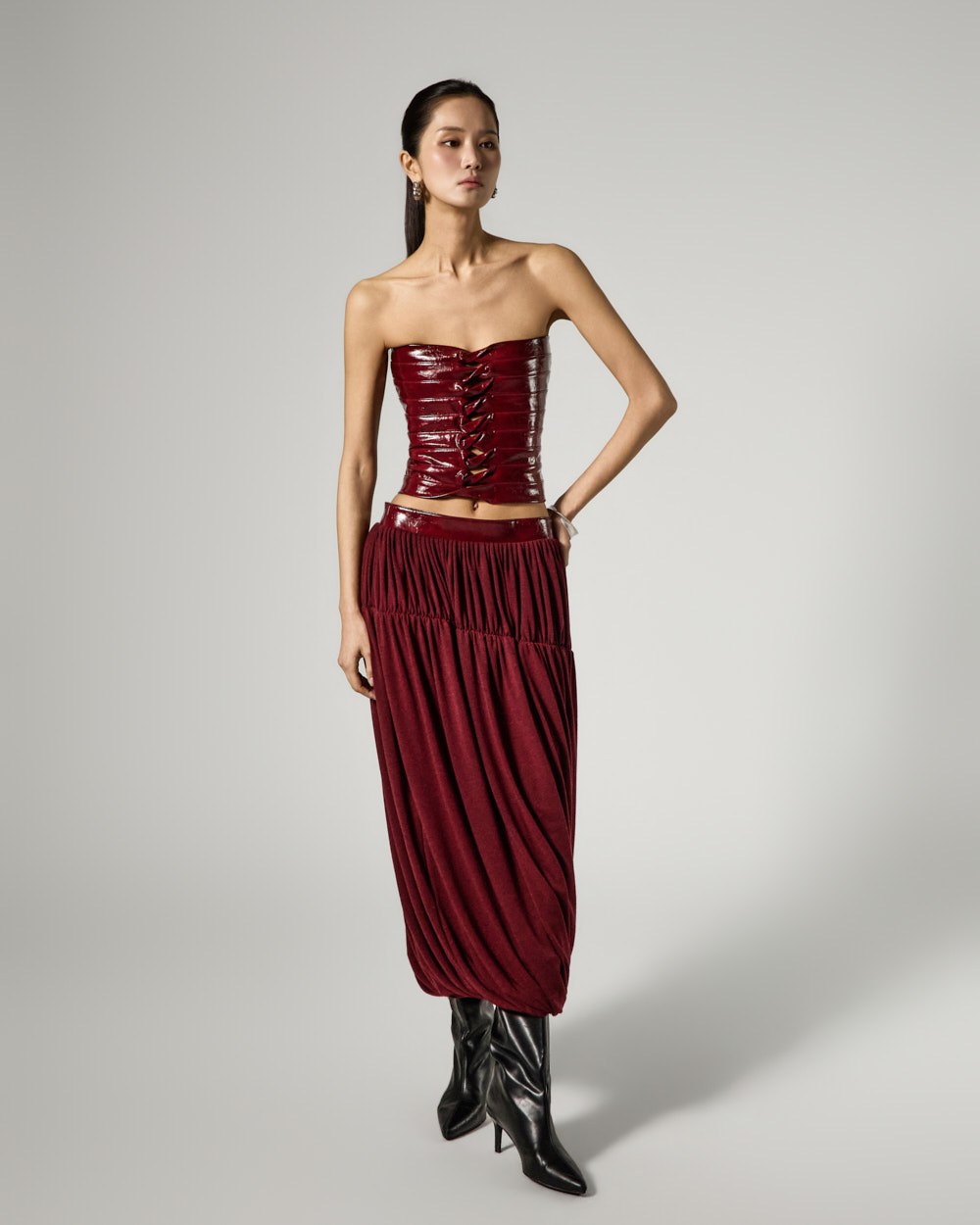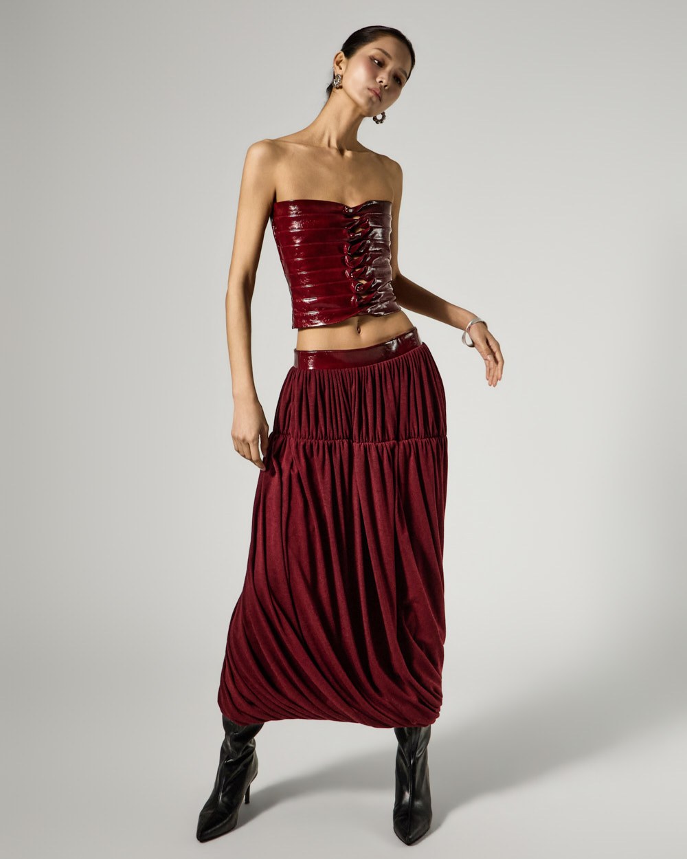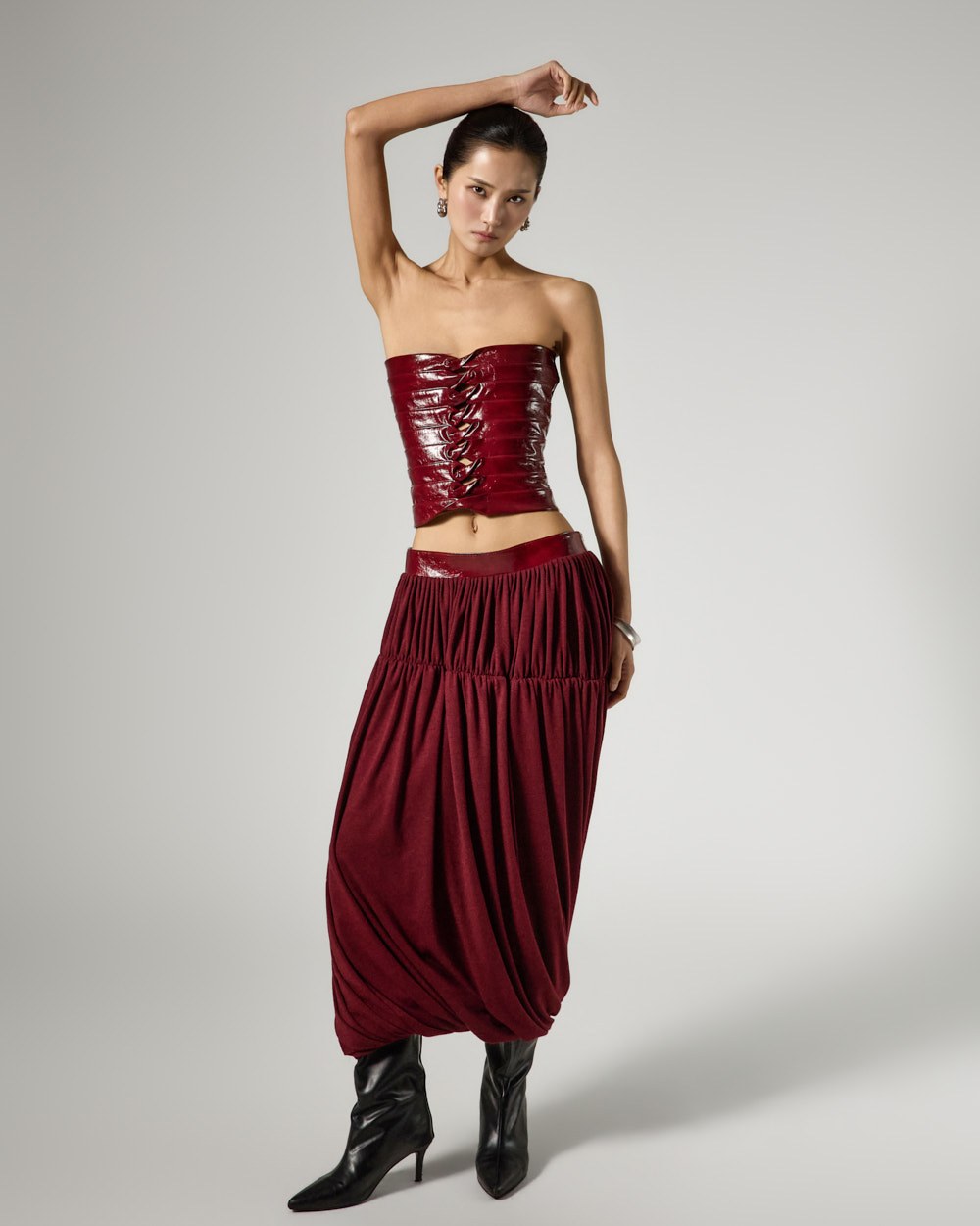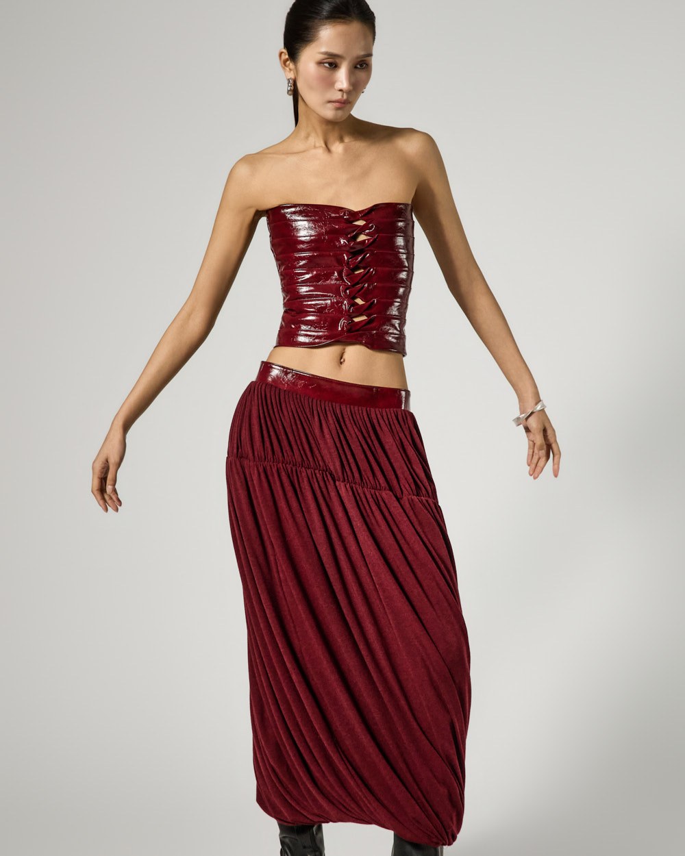 Model is 173cm tall and is wearing size S in the BURGUNDY color.