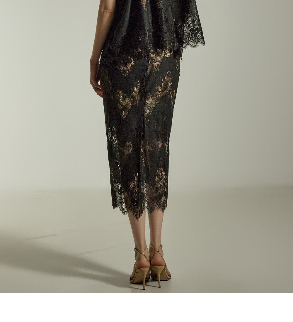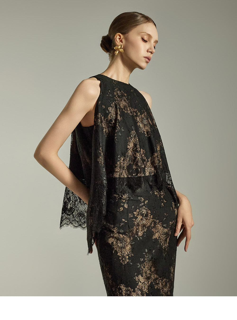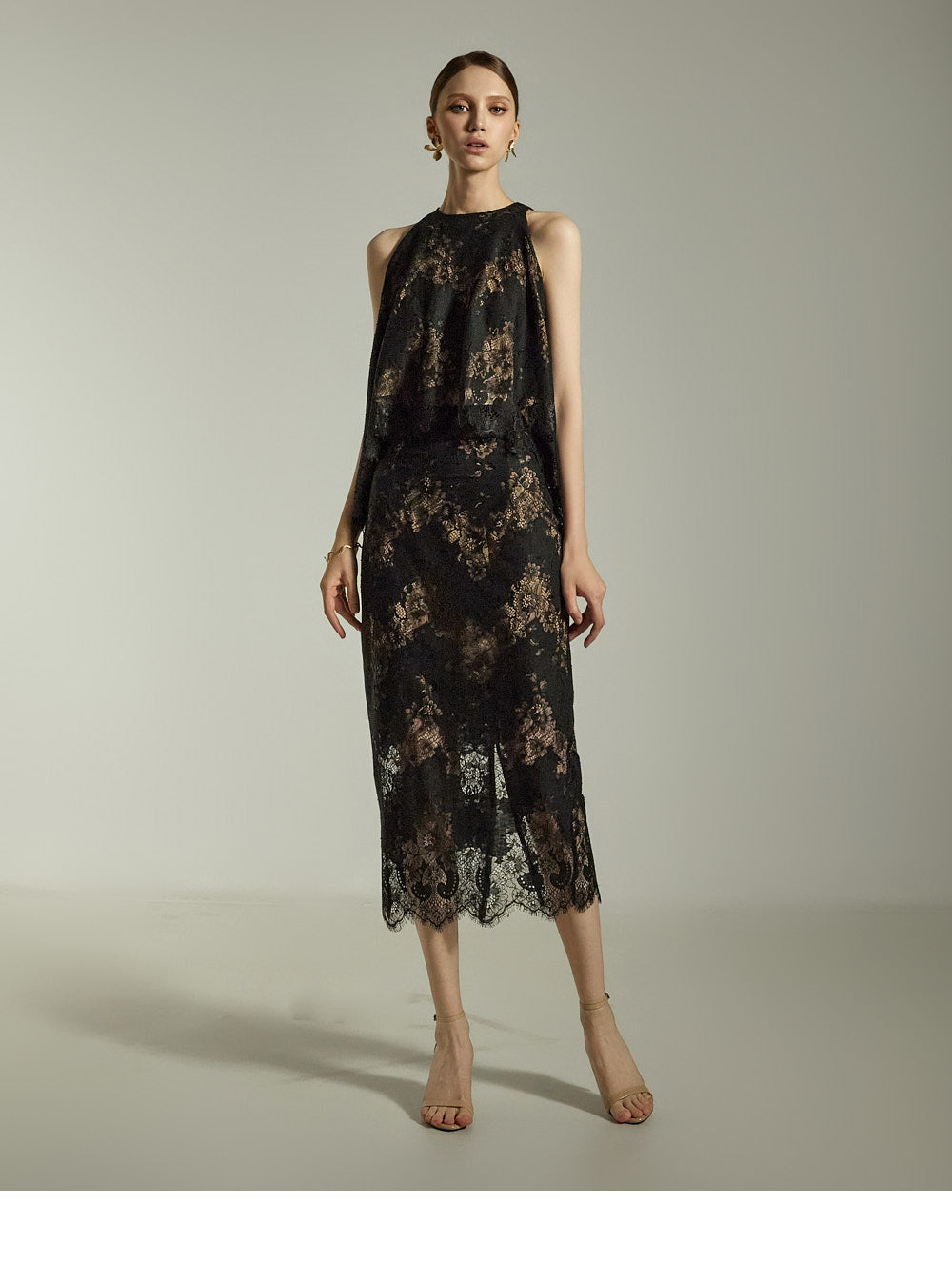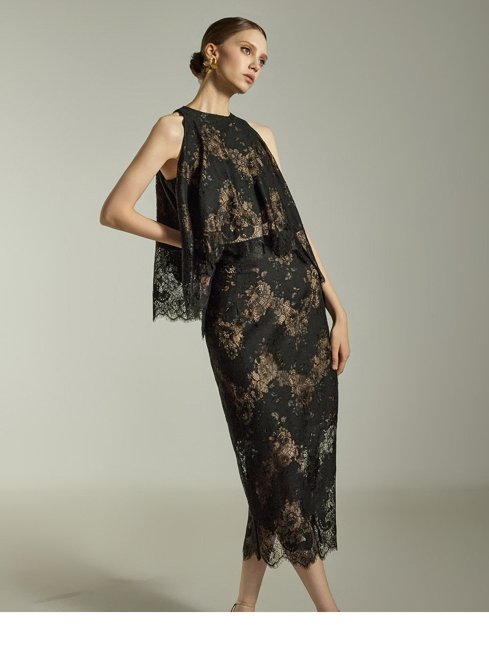 The all-over floral lace fabric features a sheer hem detail that adds a subtle touch.
