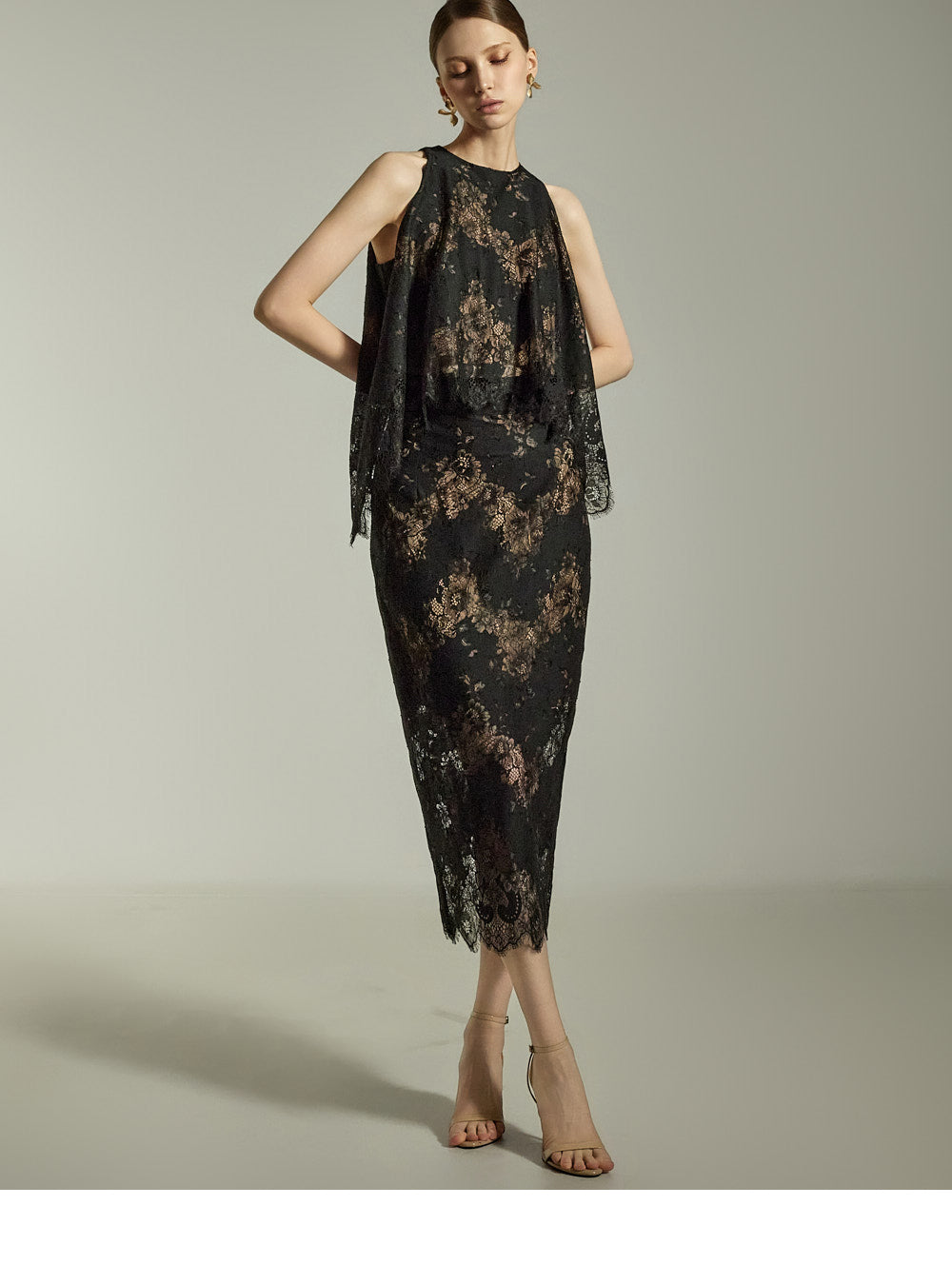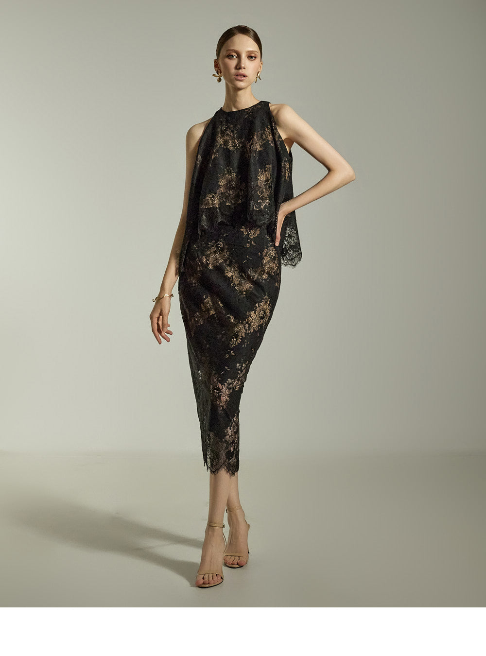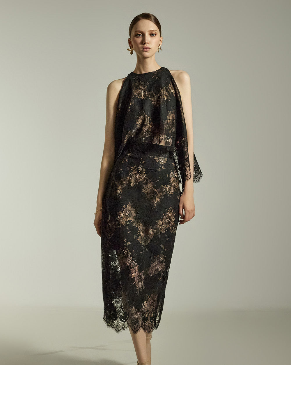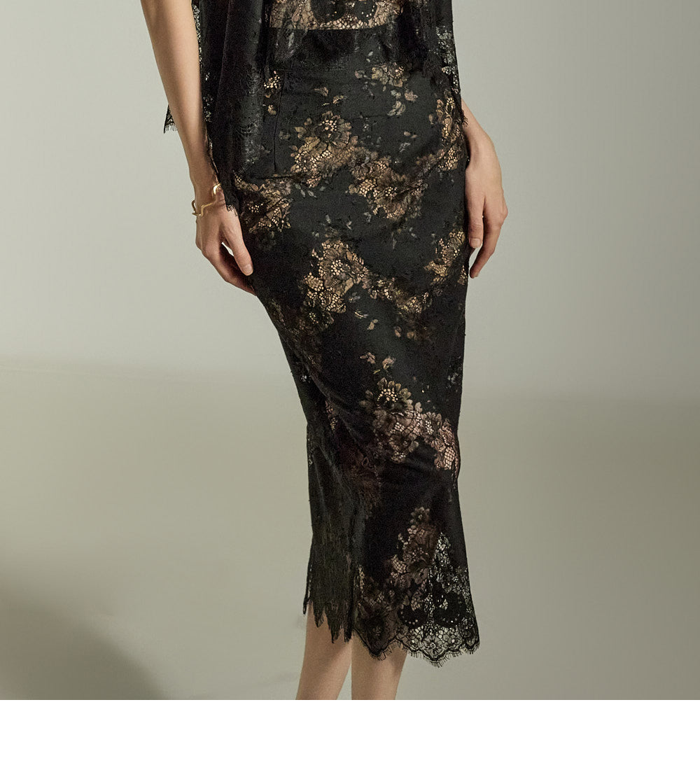 The all-over floral lace fabric features a sheer hem detail that adds a subtle touch.