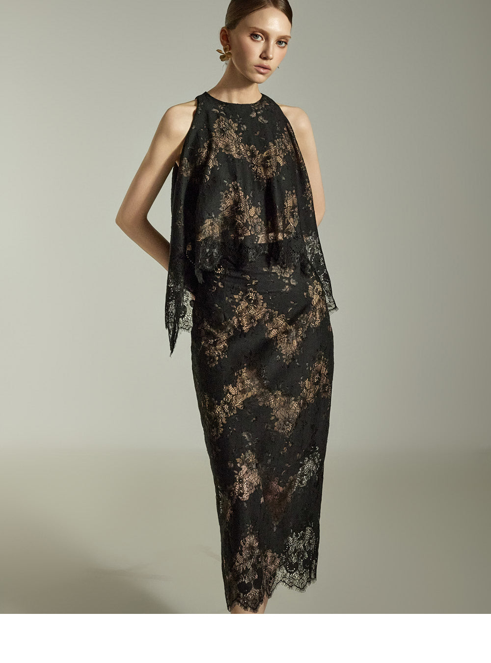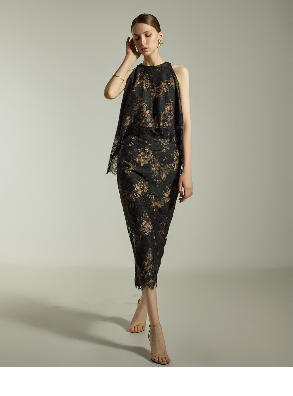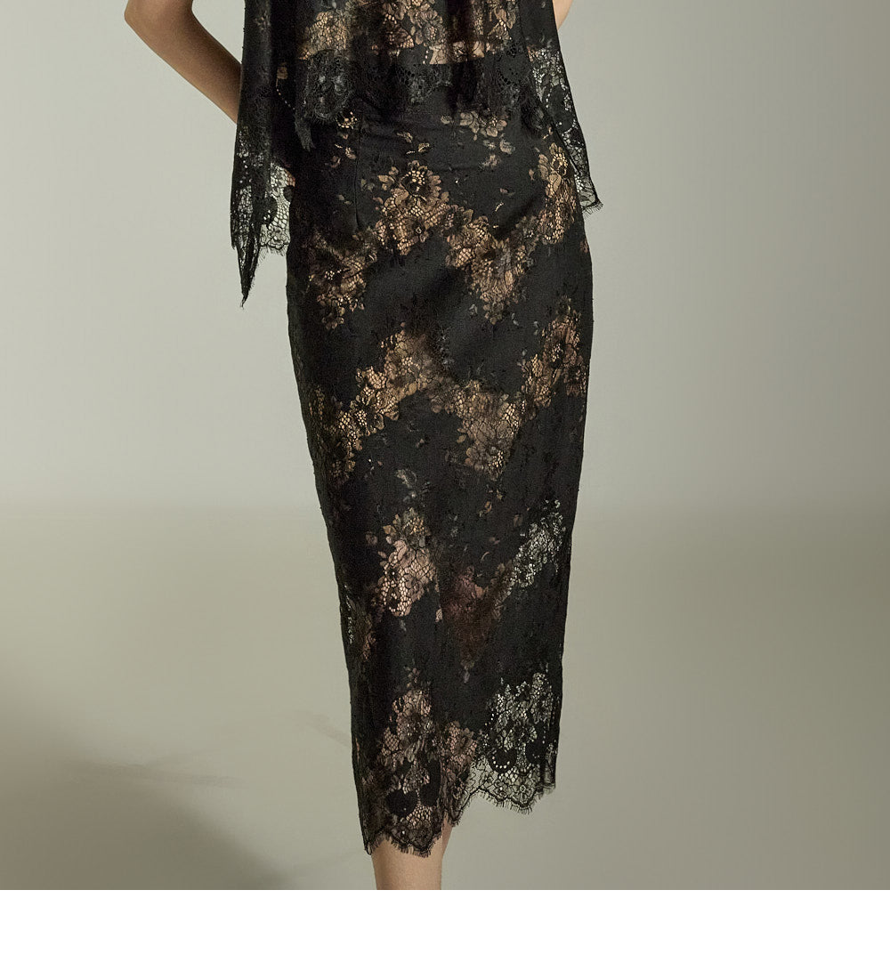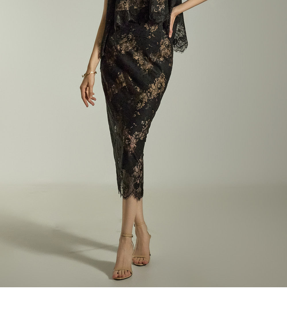 The all-over floral lace fabric features a sheer hem detail that adds a subtle touch.