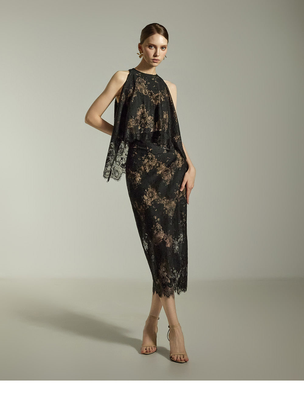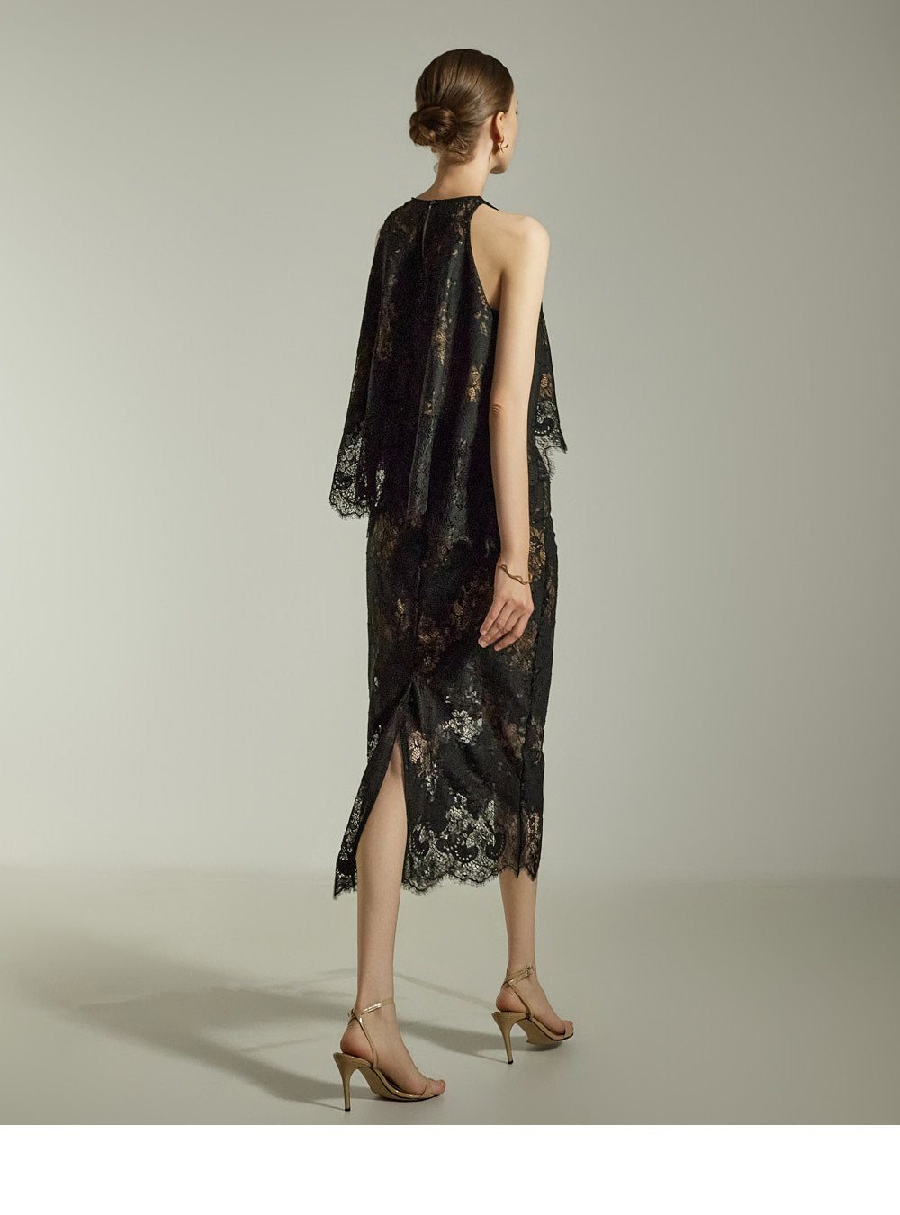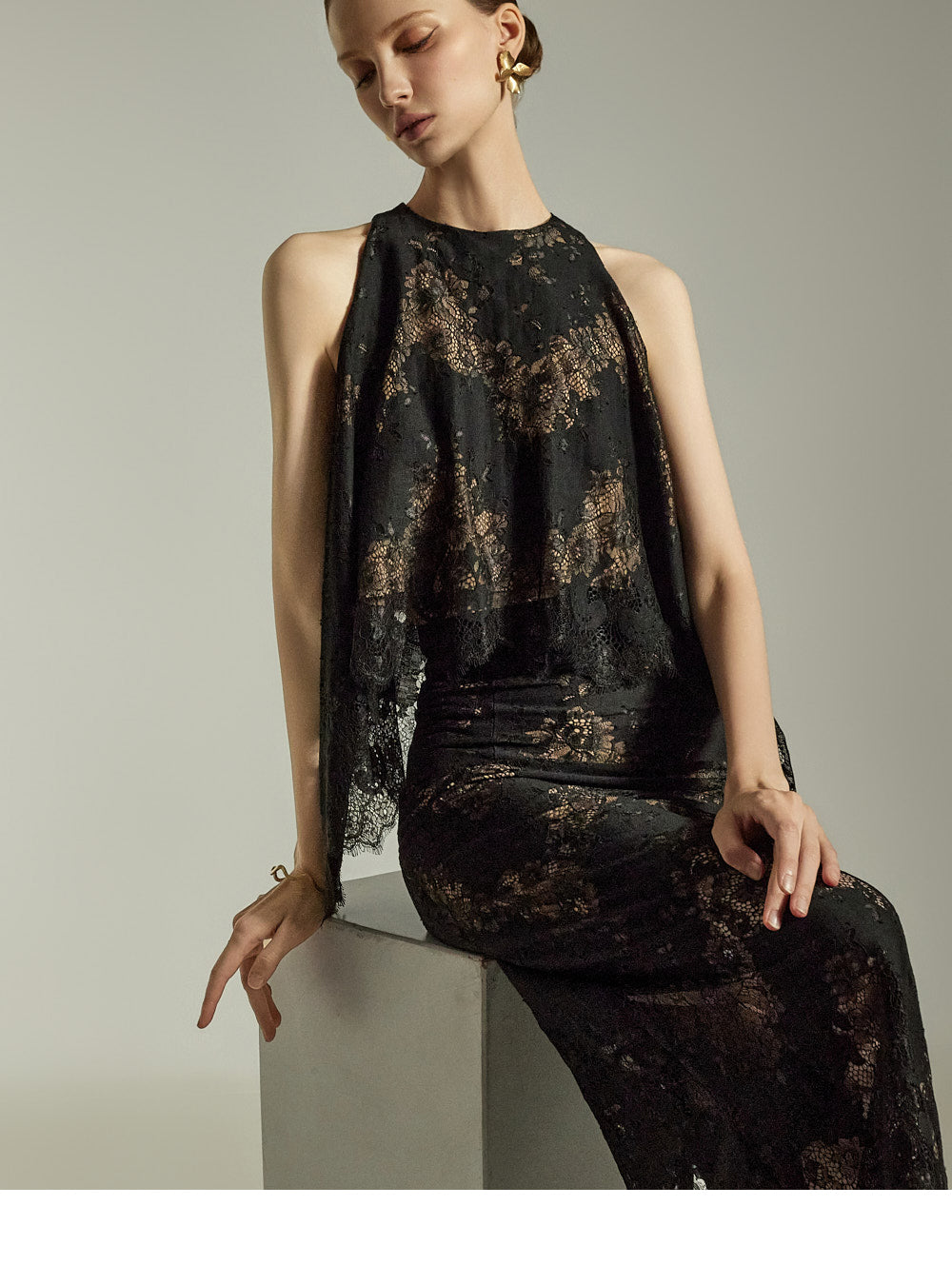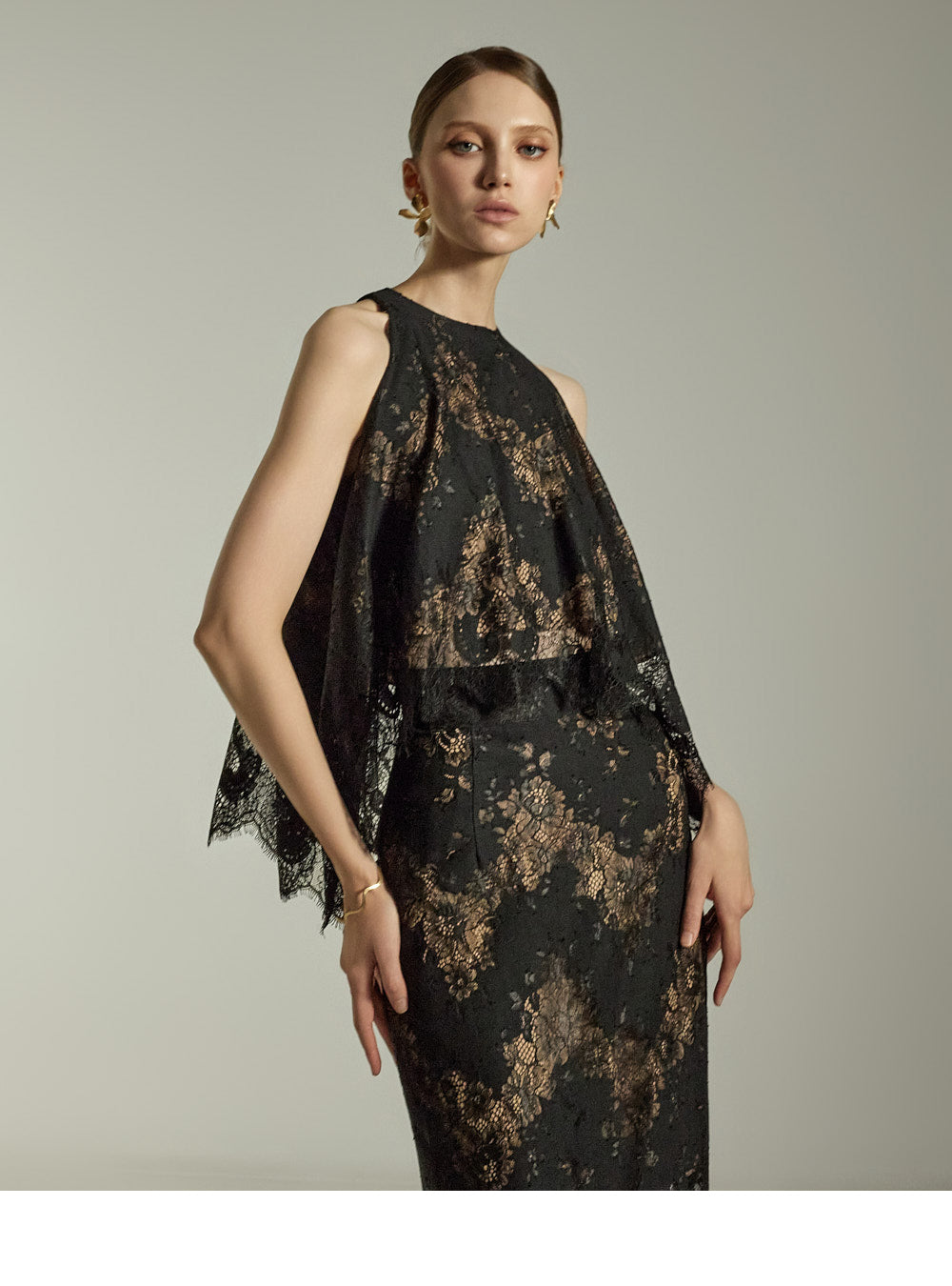 The all-over floral lace fabric features a sheer hem detail that adds a subtle touch.