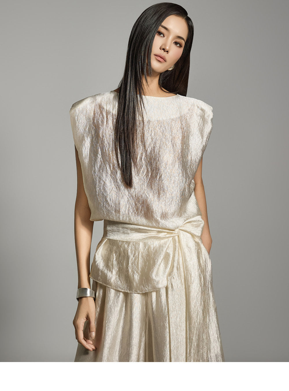 模特身高 173 厘米,上衣和下装均为单一尺码,颜色为象牙色。