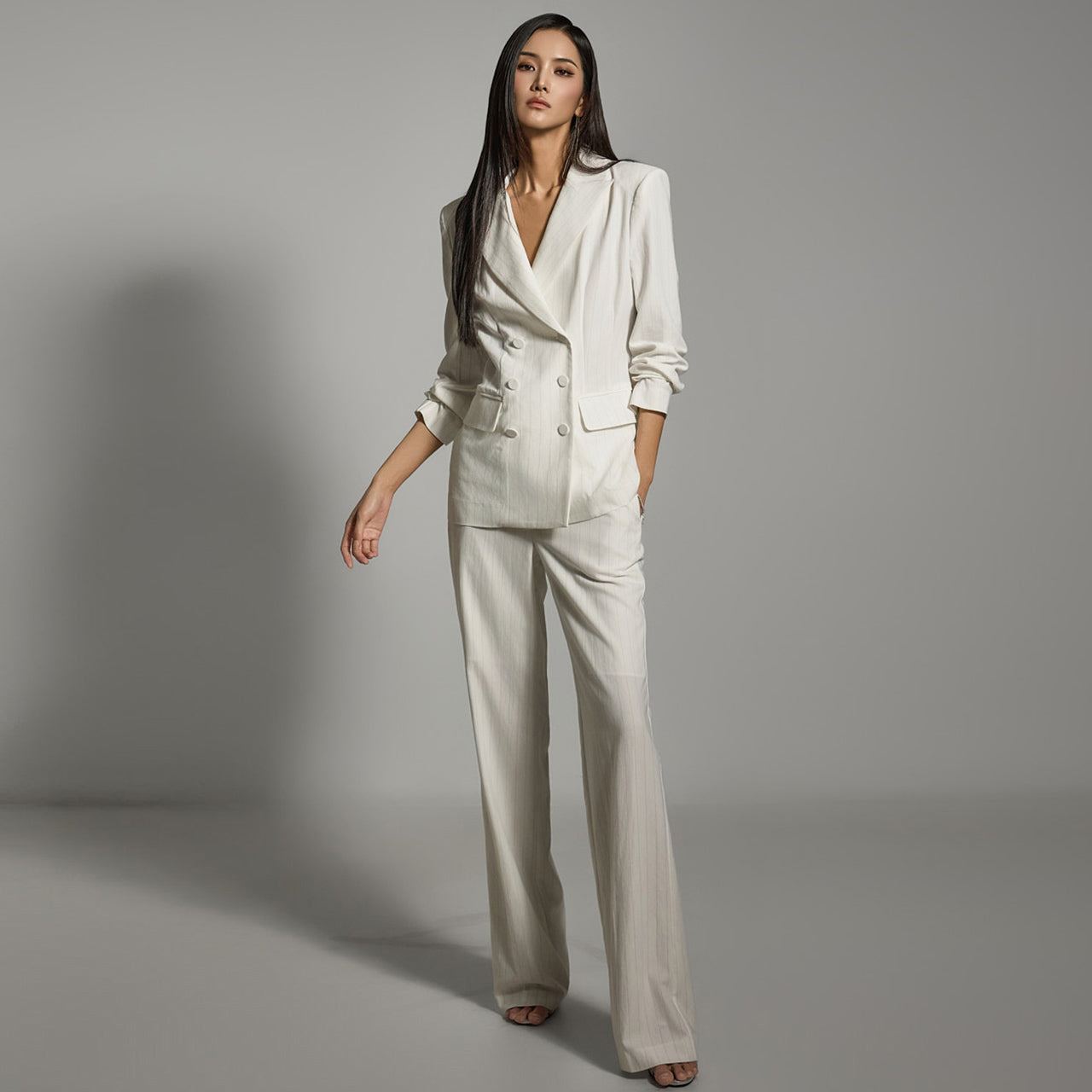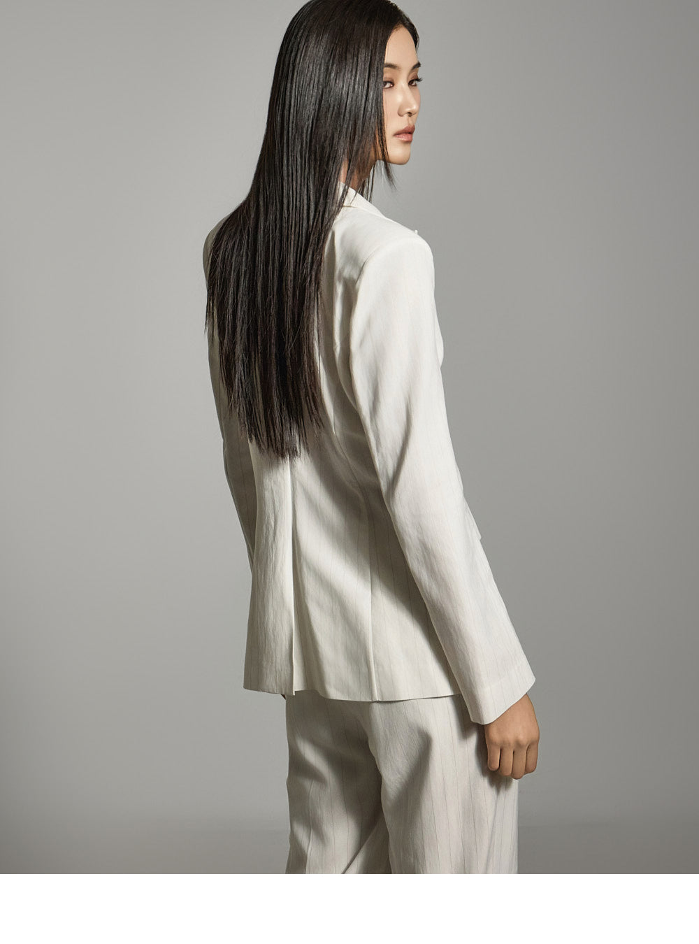 这款夹克采用修身剪裁,配有垫肩、长领、