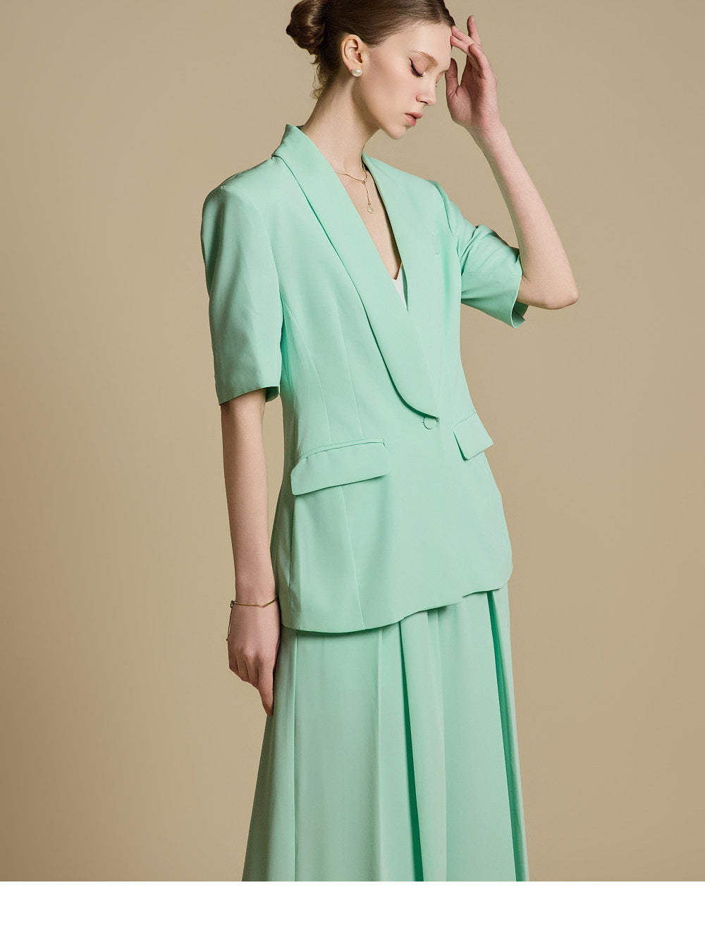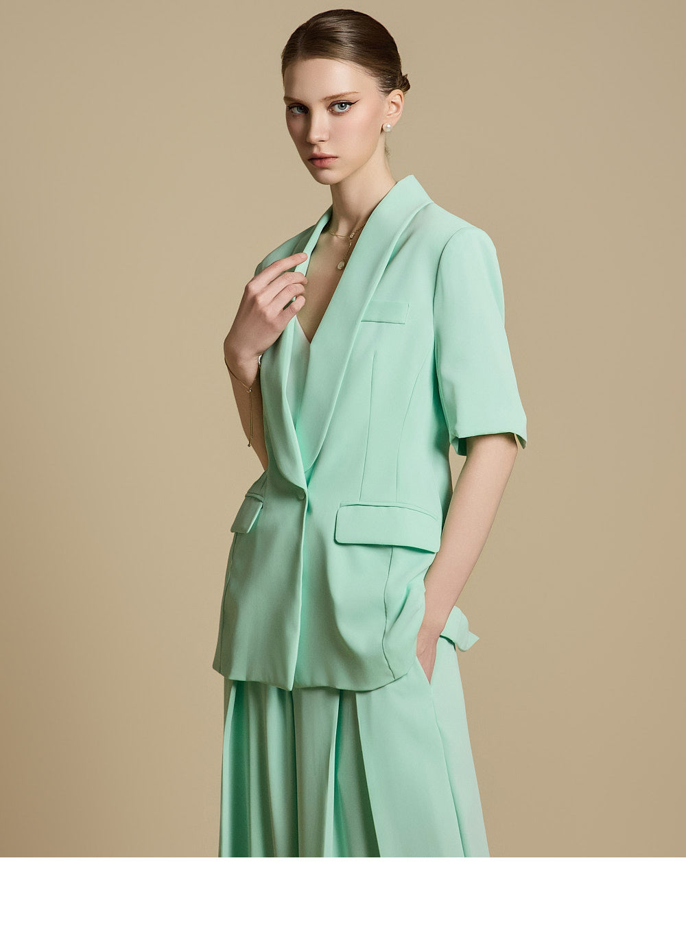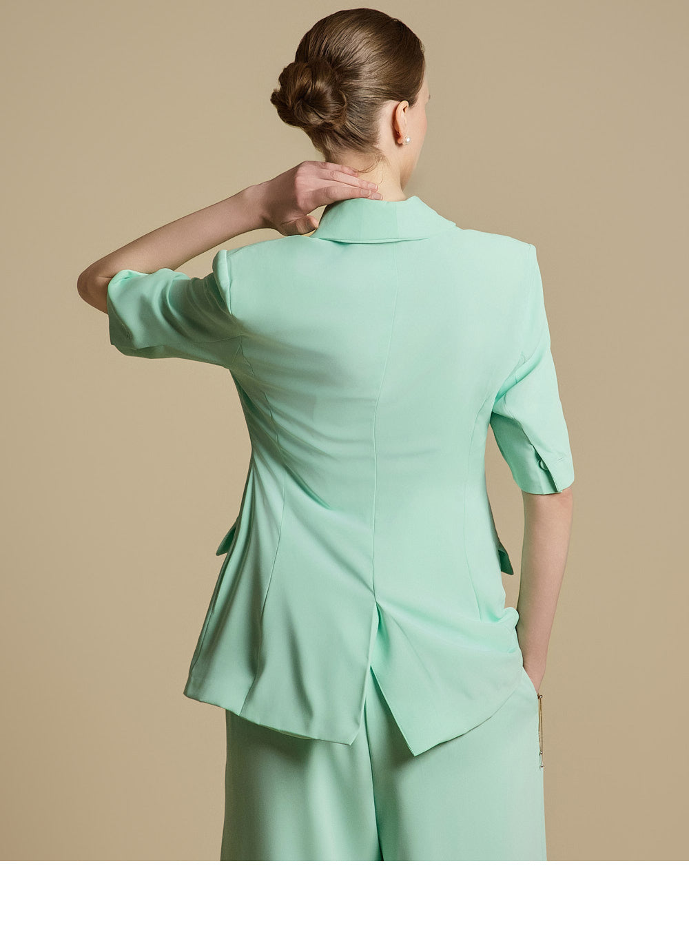 而后背的开衩和袖子的纽扣则增添了整体的美感。