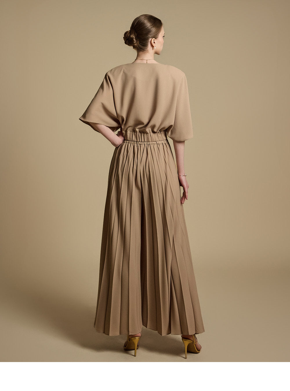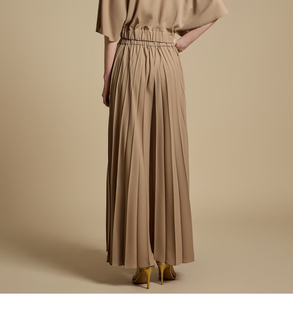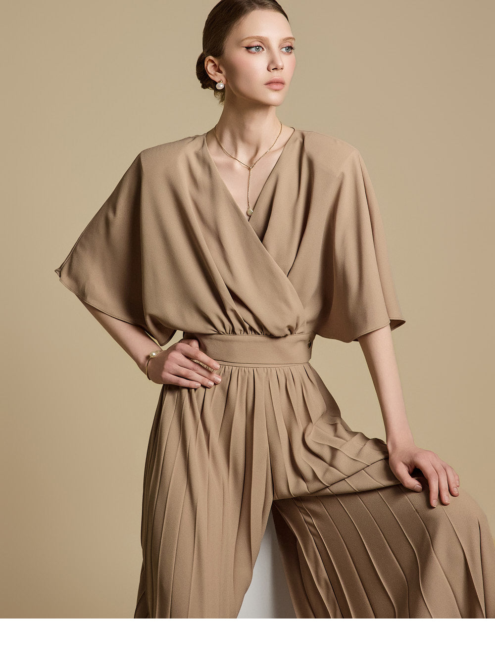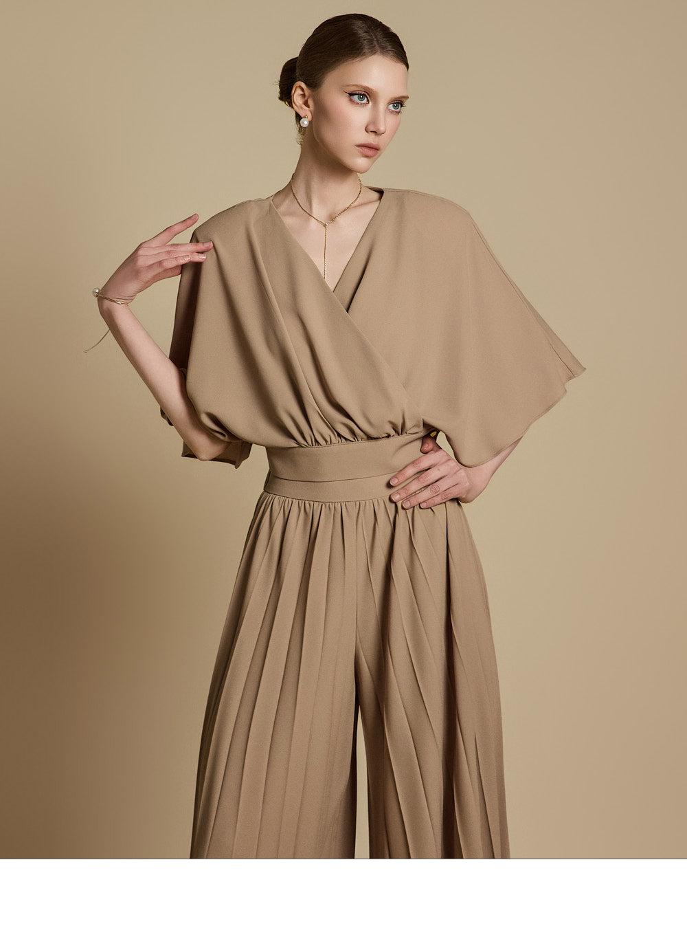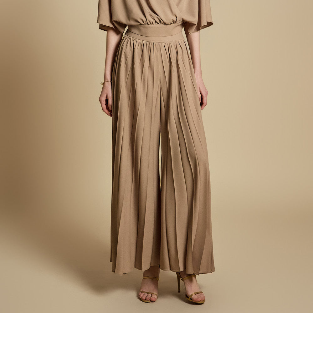 下身是带有褶饰的宽裤,