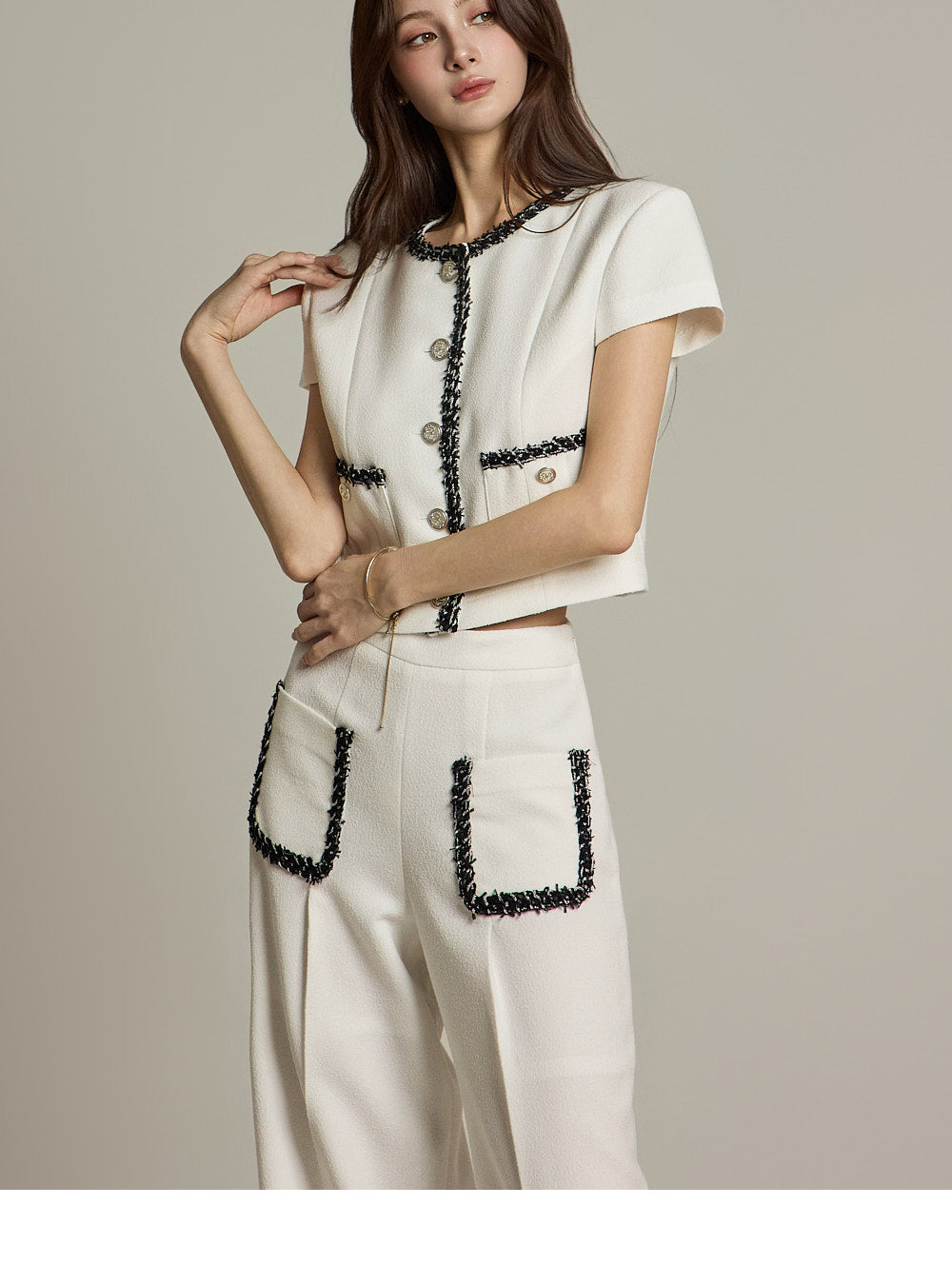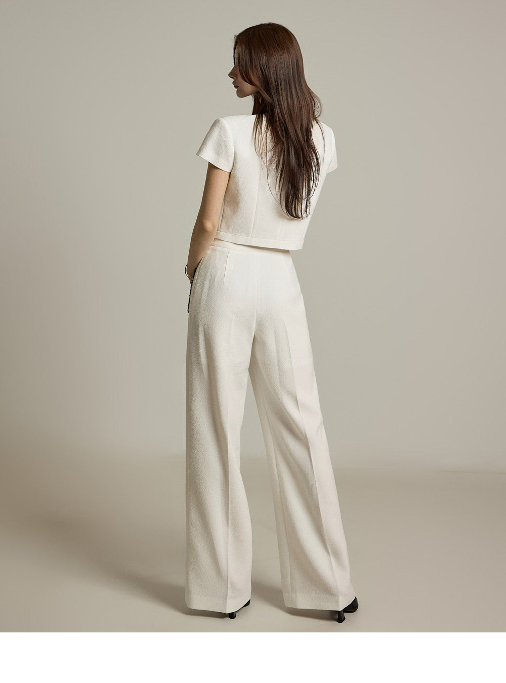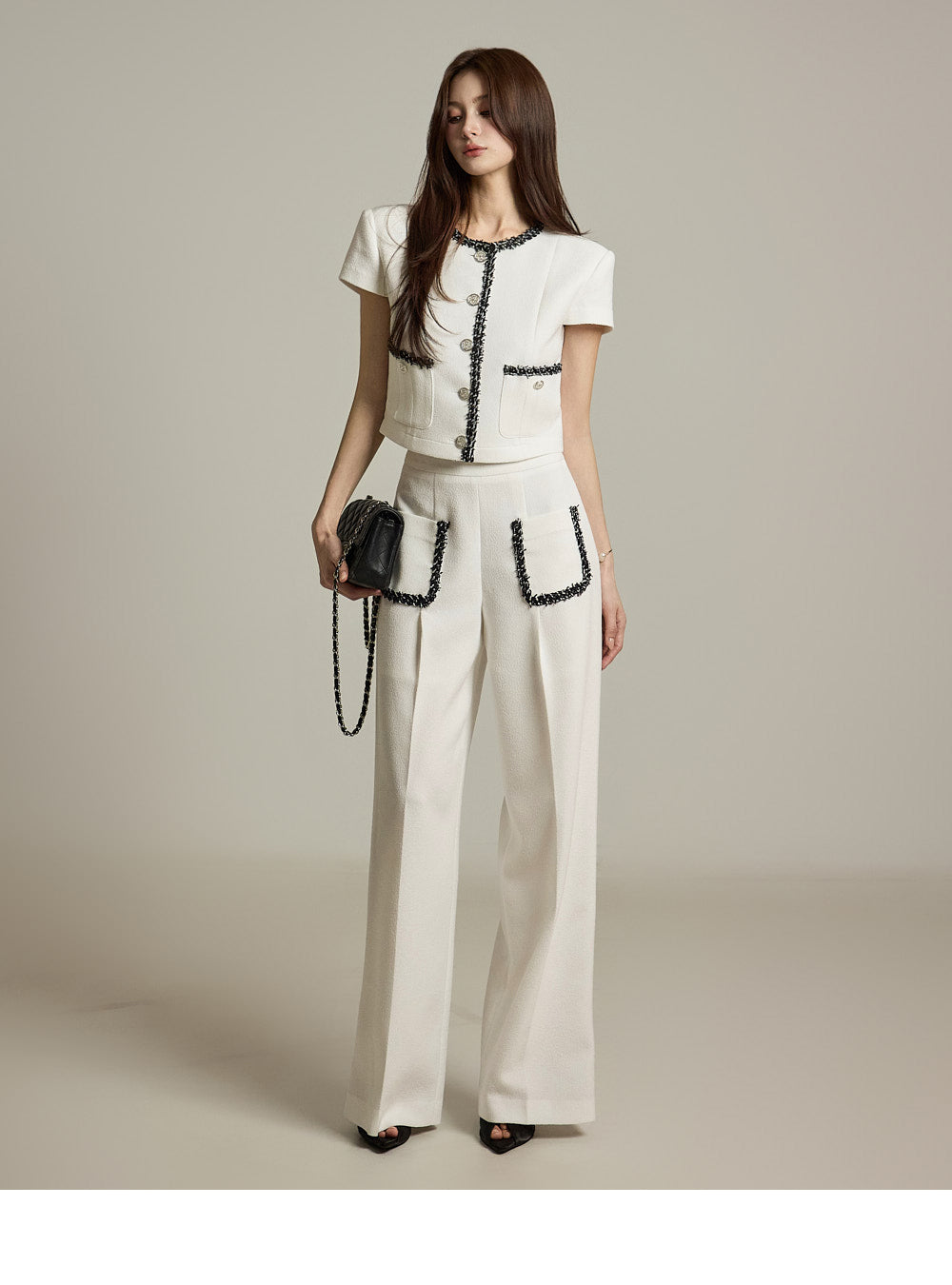 短款夹克和阔腿裤营造出一种平衡的、