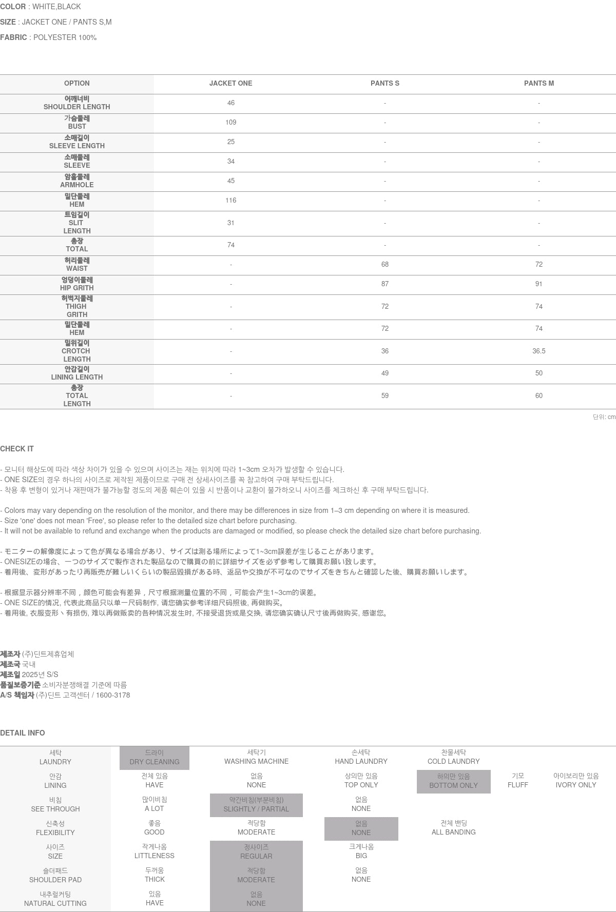 上衣为白色,下装为 S 码。