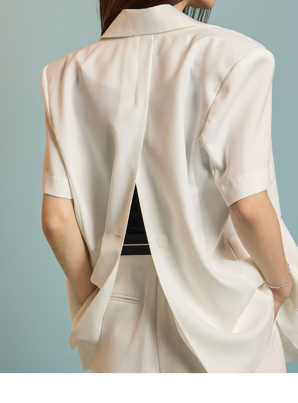 该夹克配有适度的肩垫,以形成清晰的轮廓。