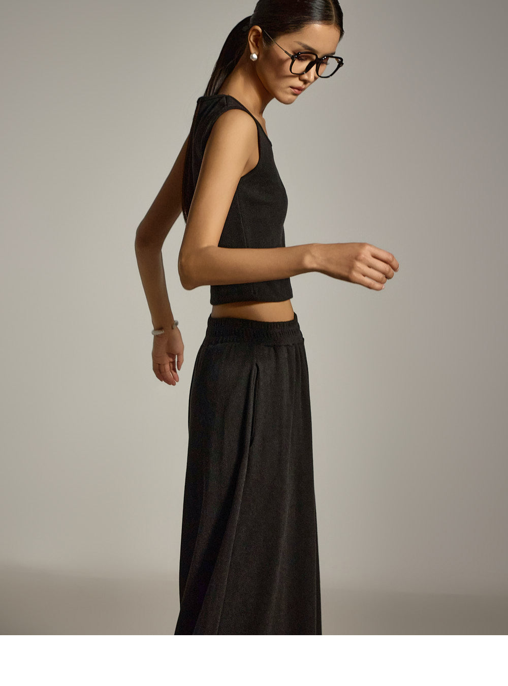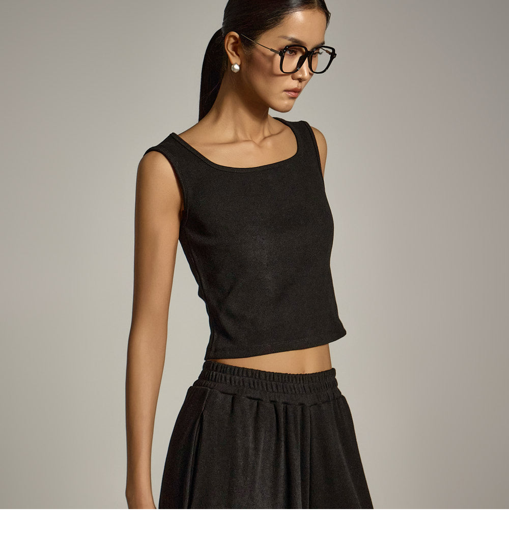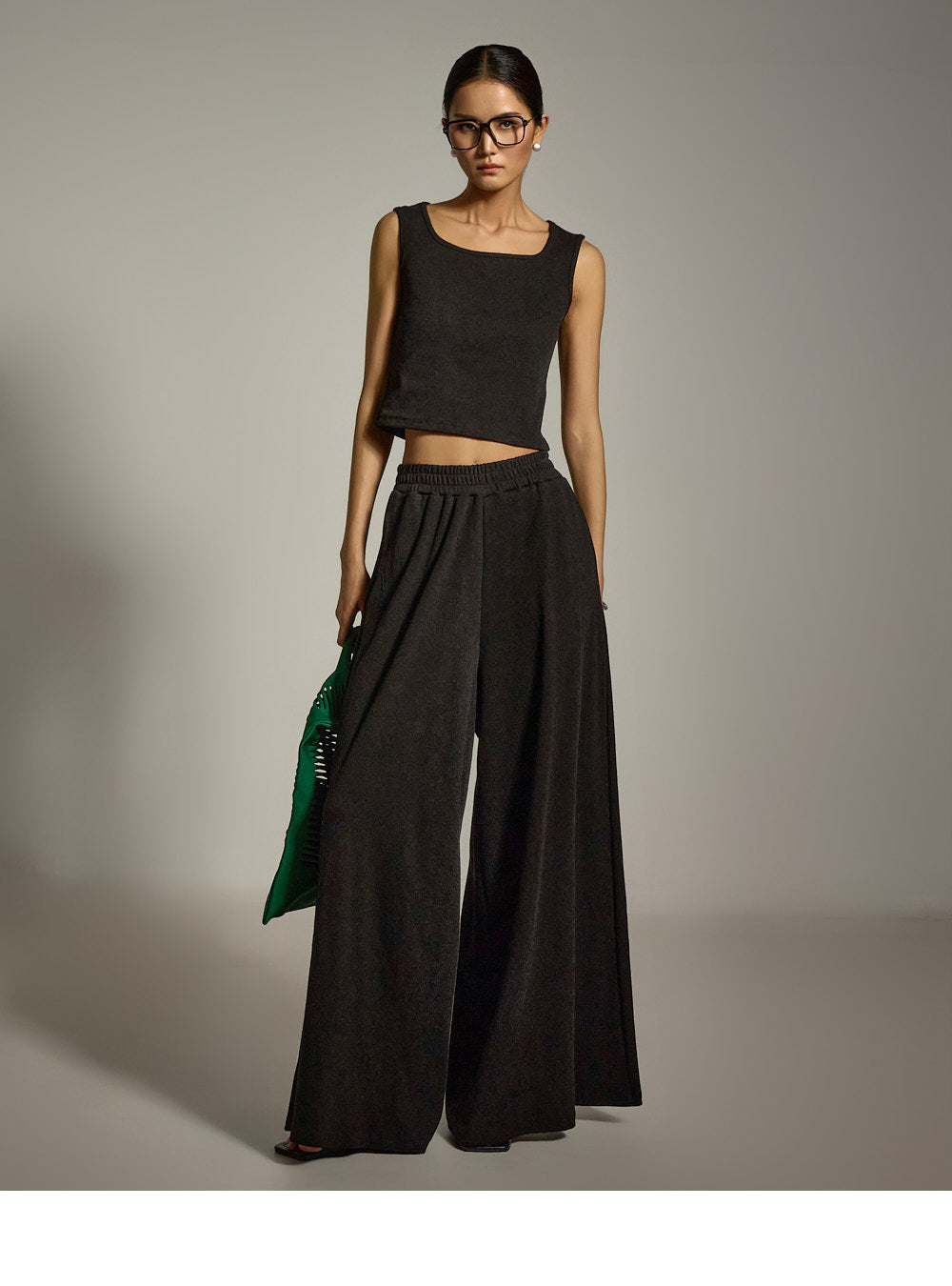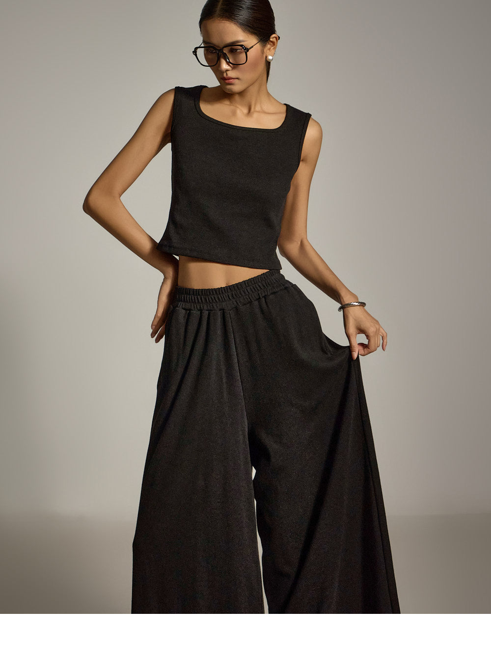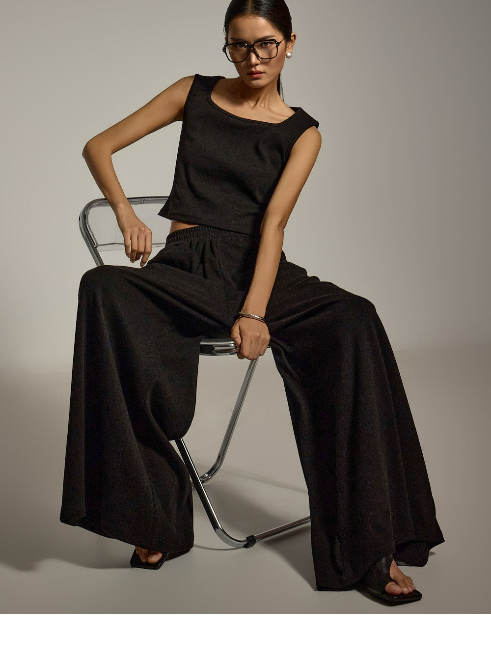 这是一套休闲套装,由方形短款上衣和宽松训练裤组成。