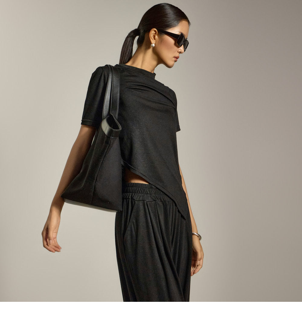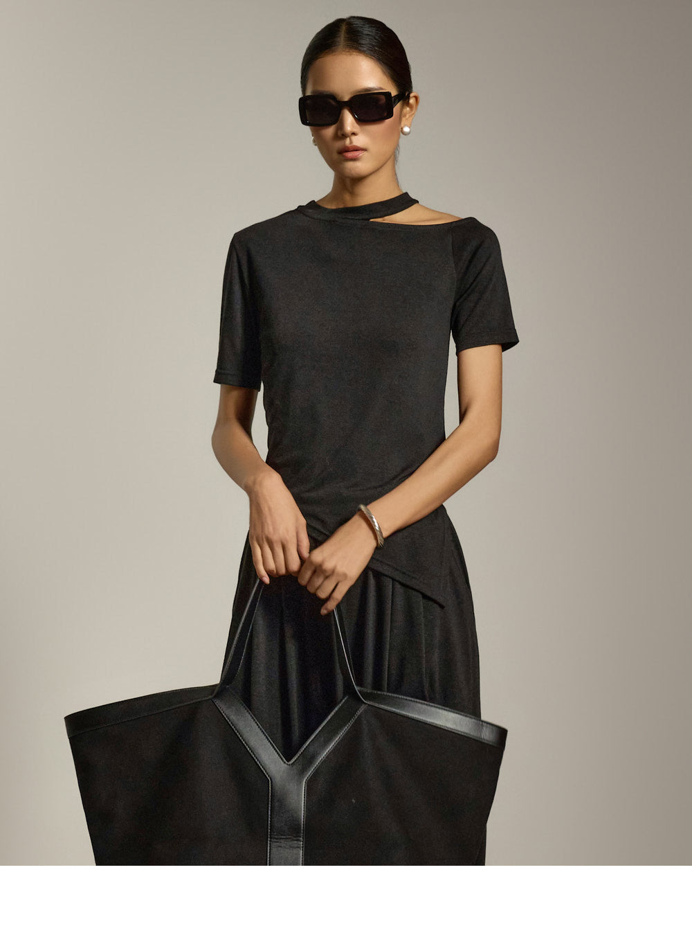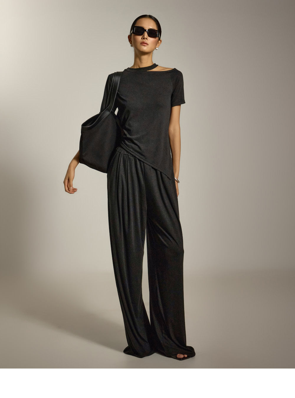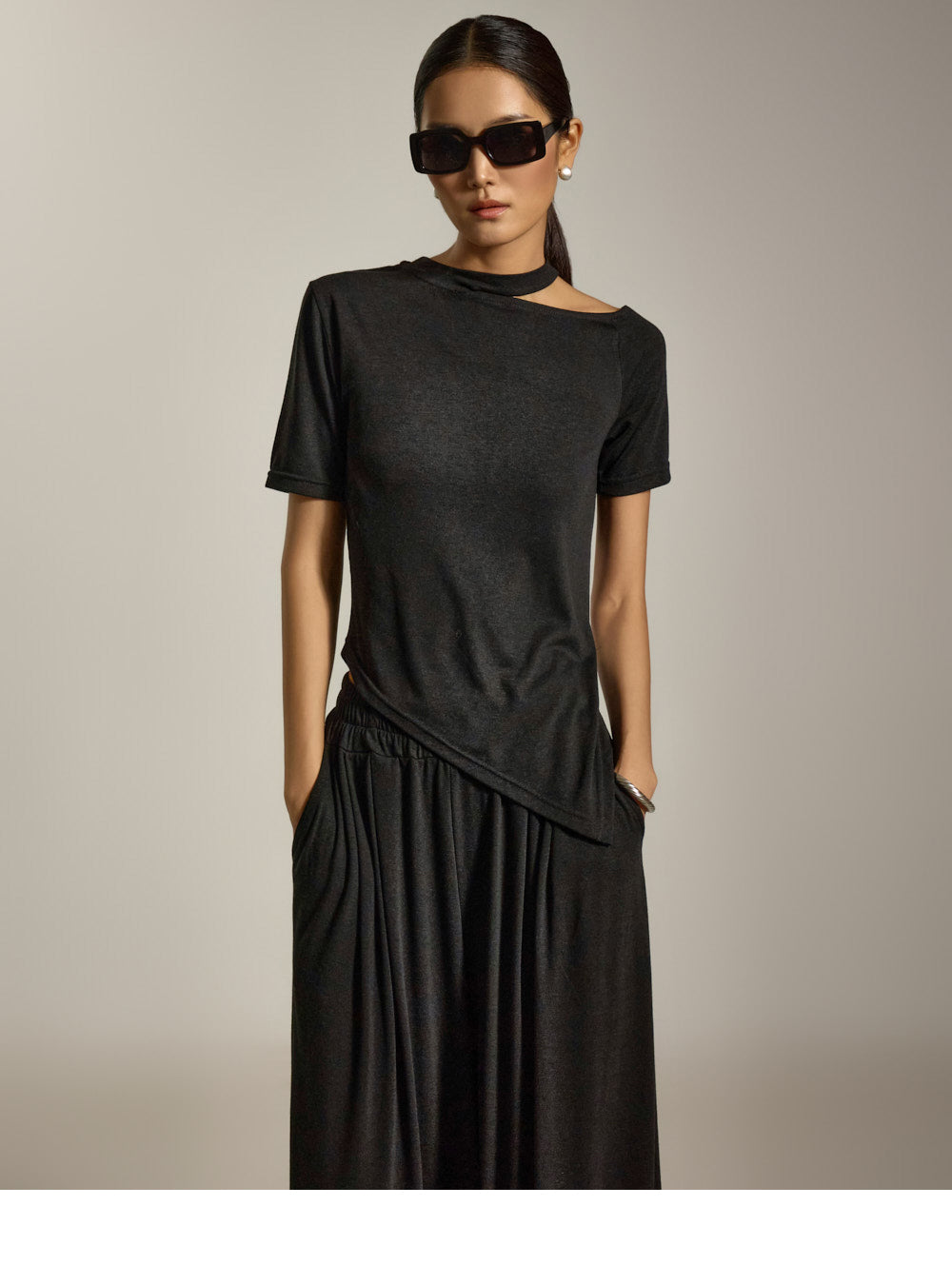 上衣采用镂空领口和不对称下摆设计,