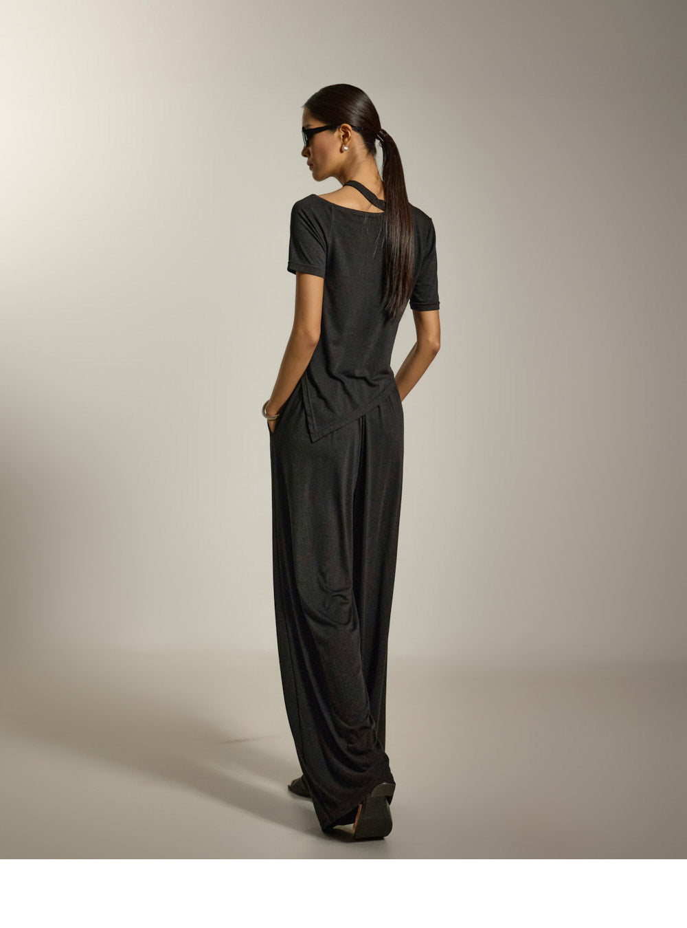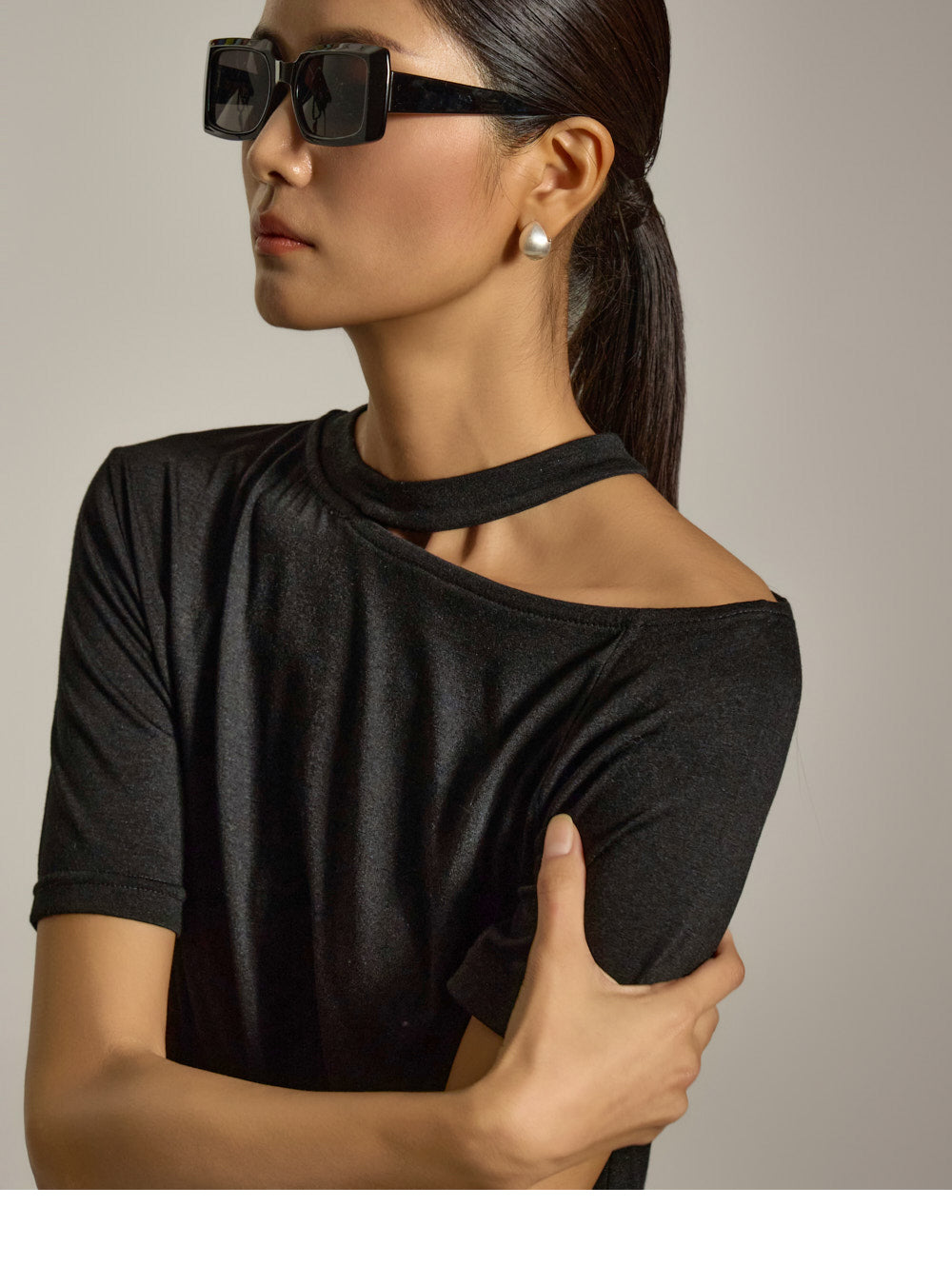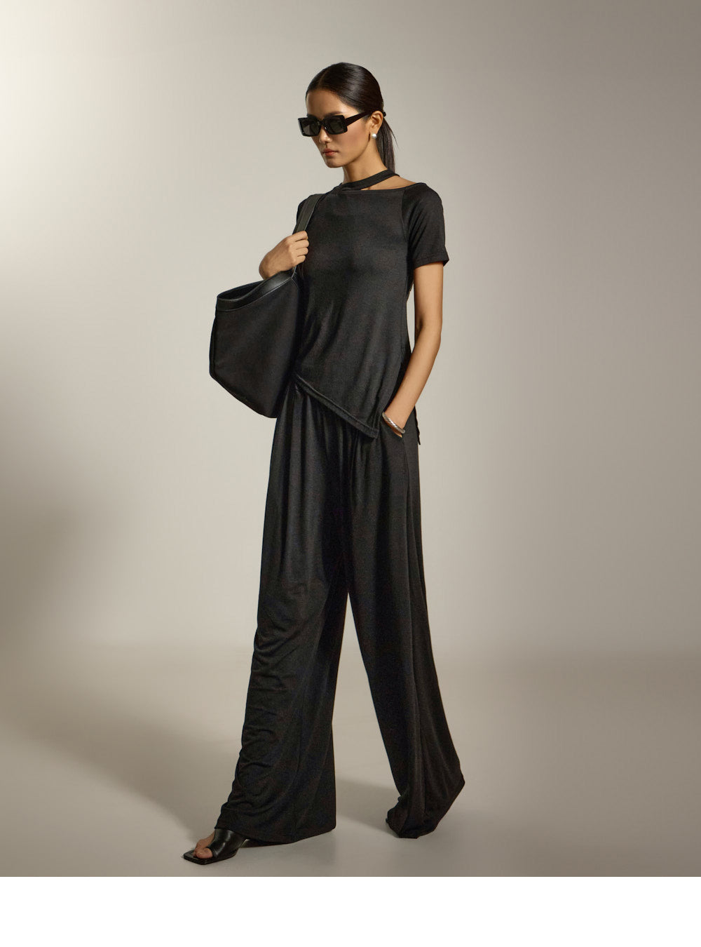 上衣采用镂空领口和不对称下摆设计,