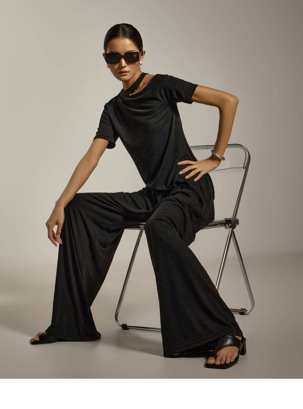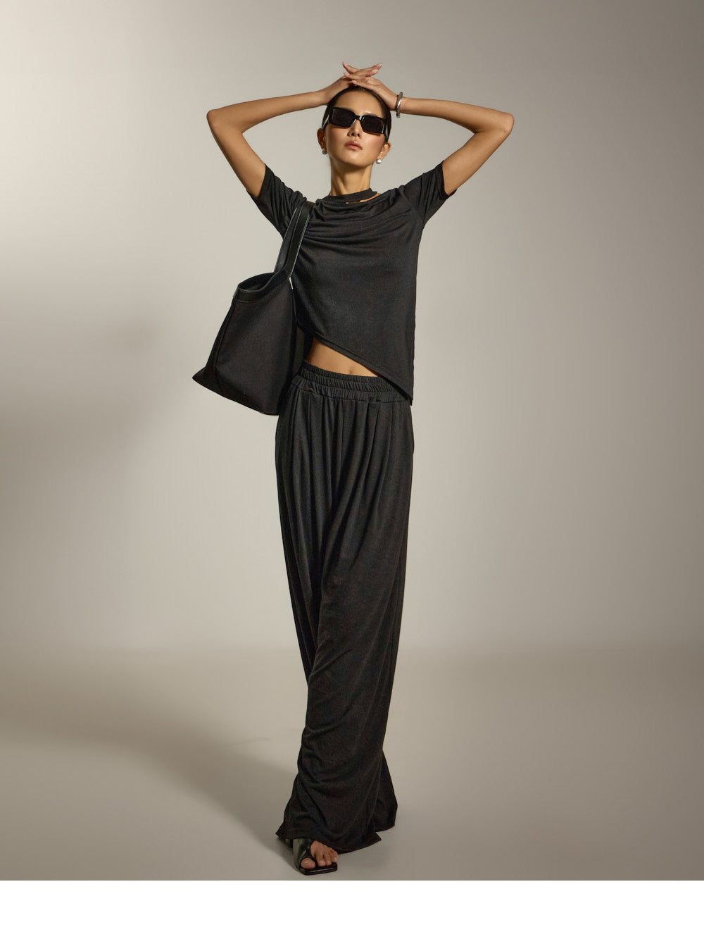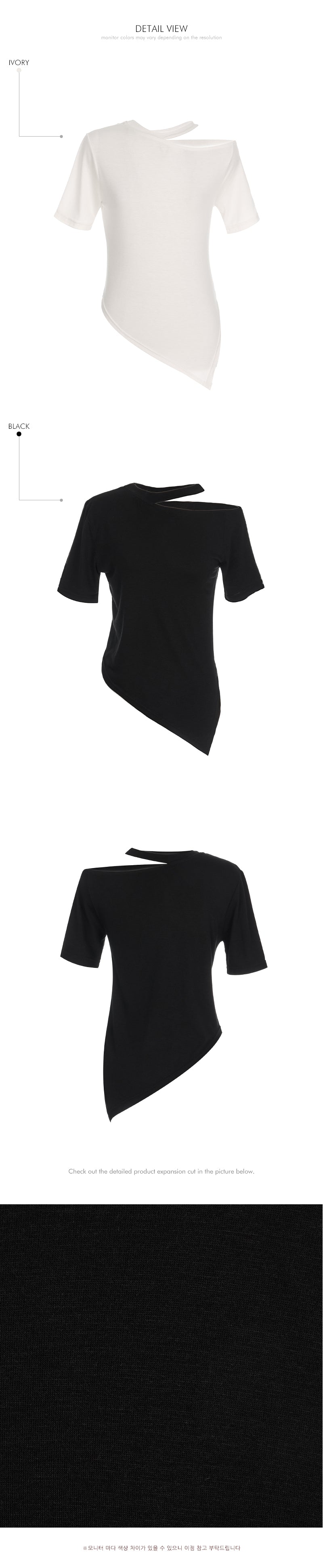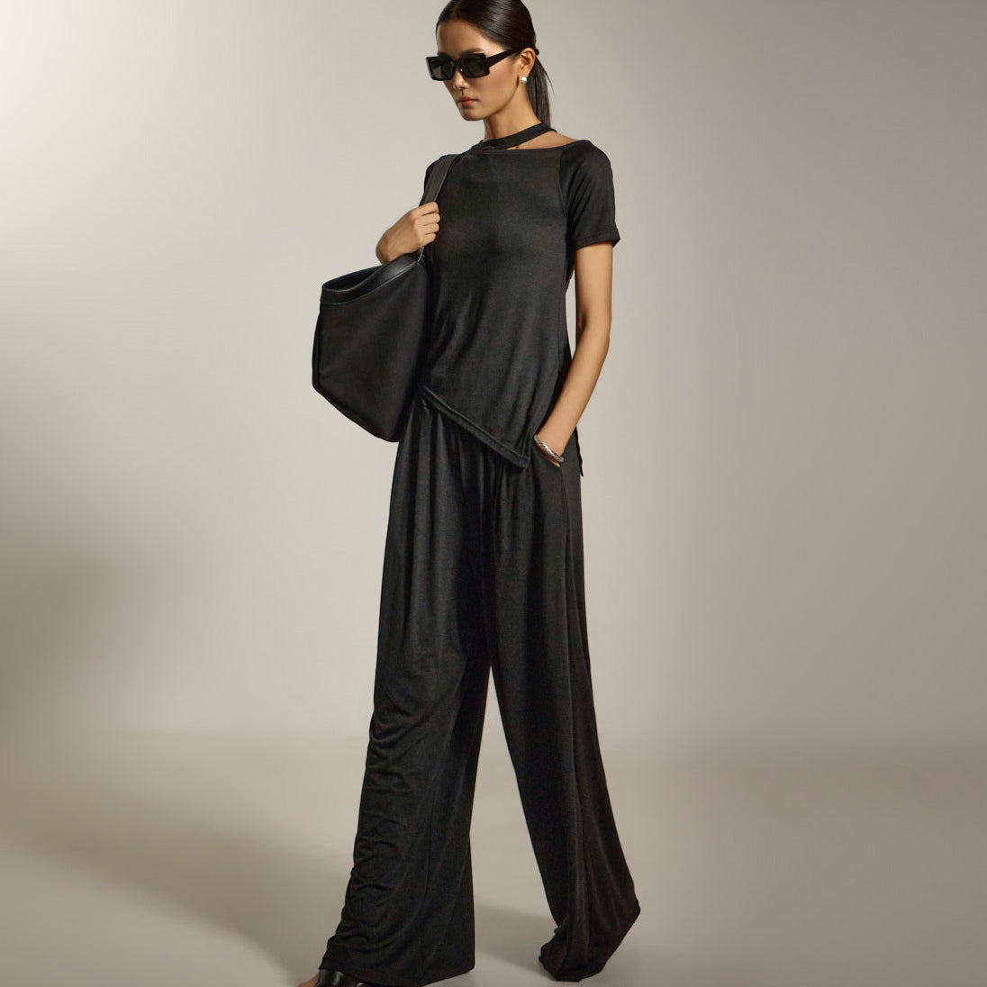 上衣采用镂空领口和不对称下摆设计,