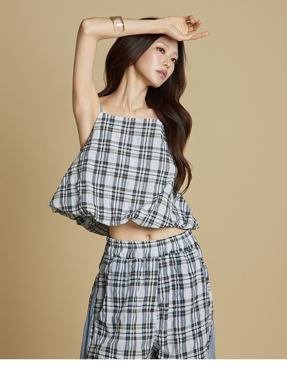 这款无袖上衣采用短款长度和灯笼式剪裁,