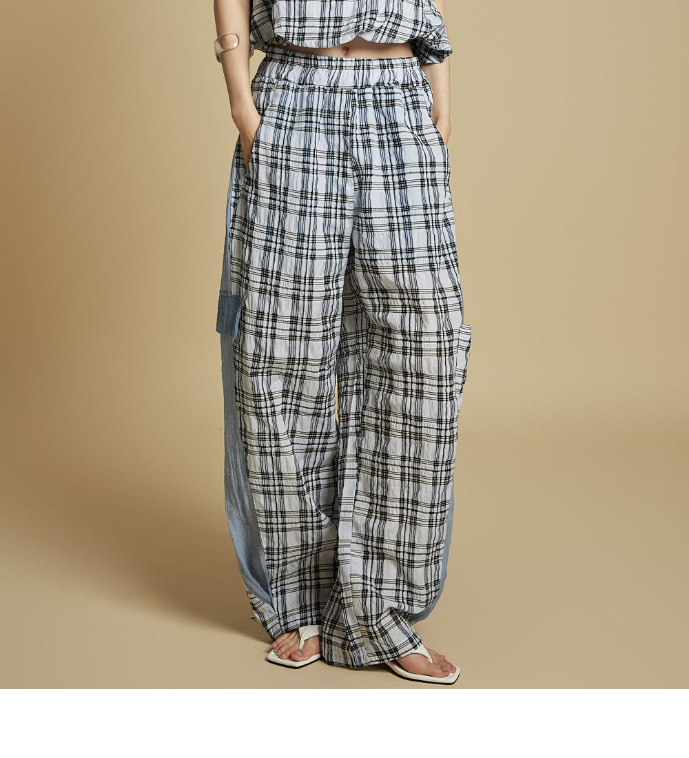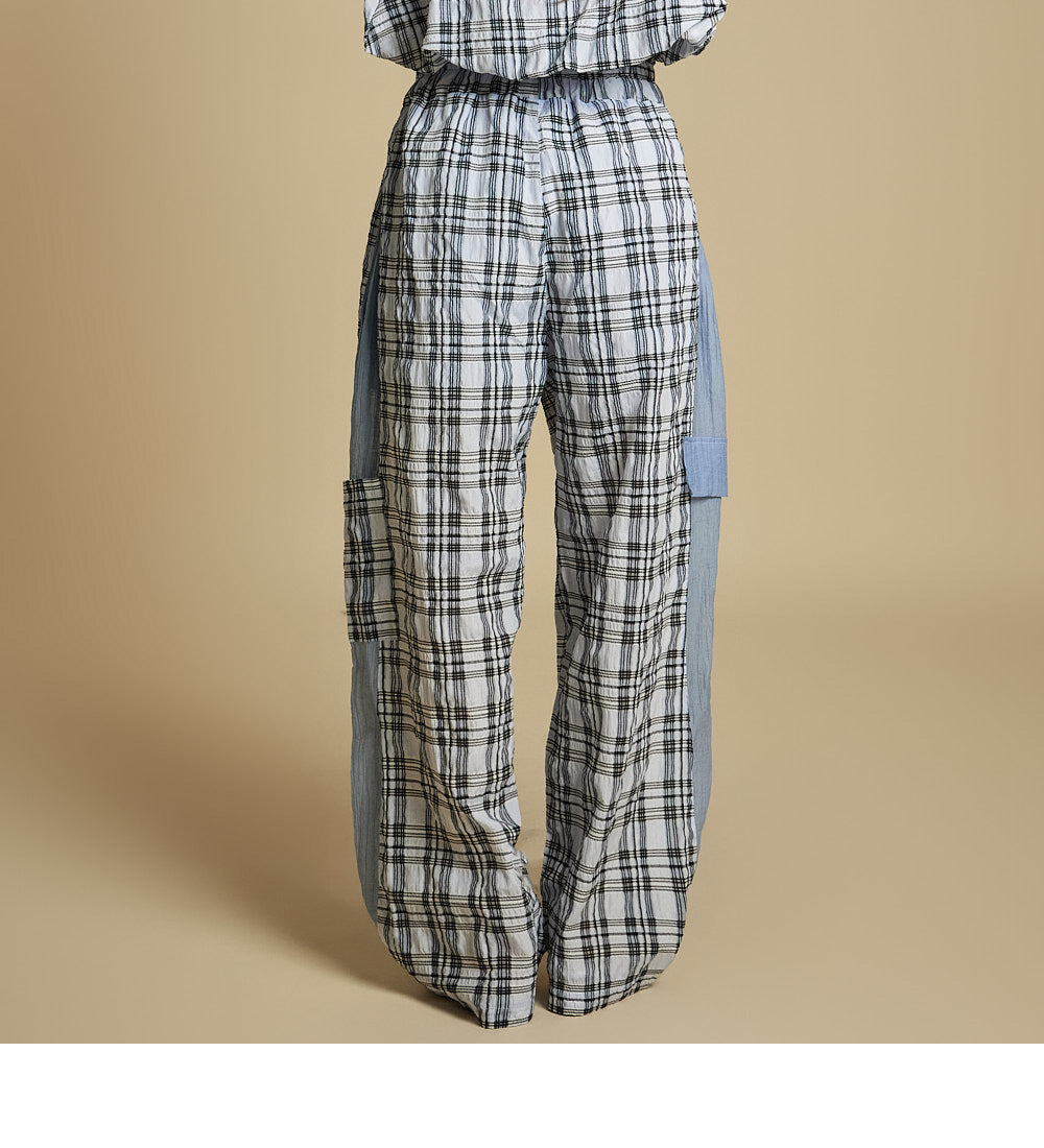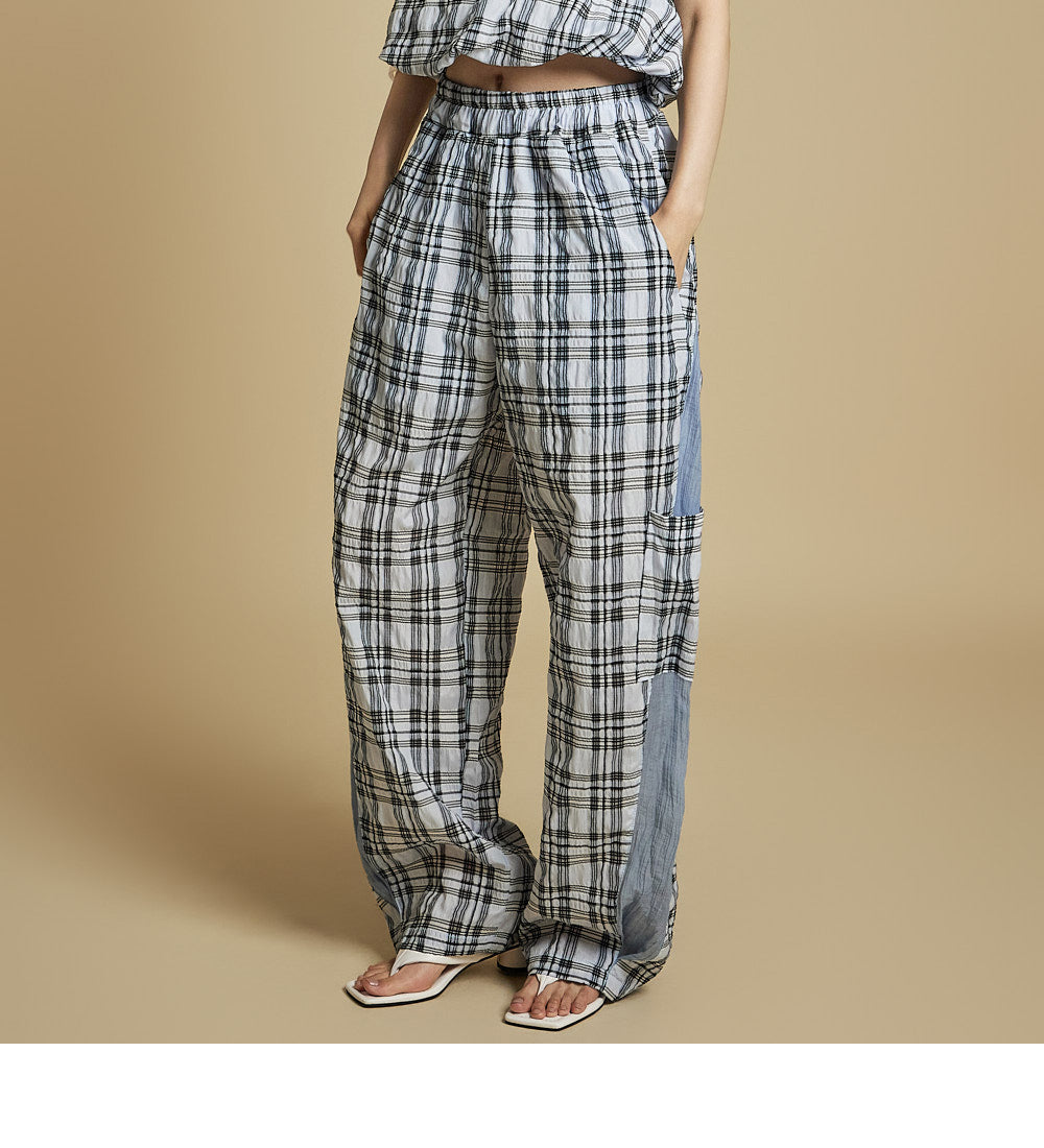裤子宽松,自然贴合身材,松紧腰带配有抽绳,穿着舒适。