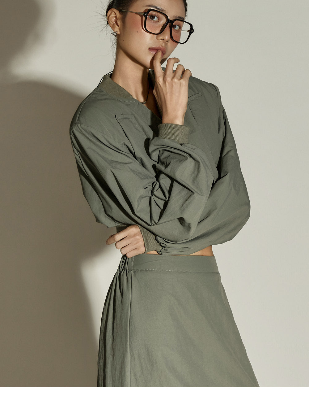 This set features a casual short blouson jumper and draped skirt.