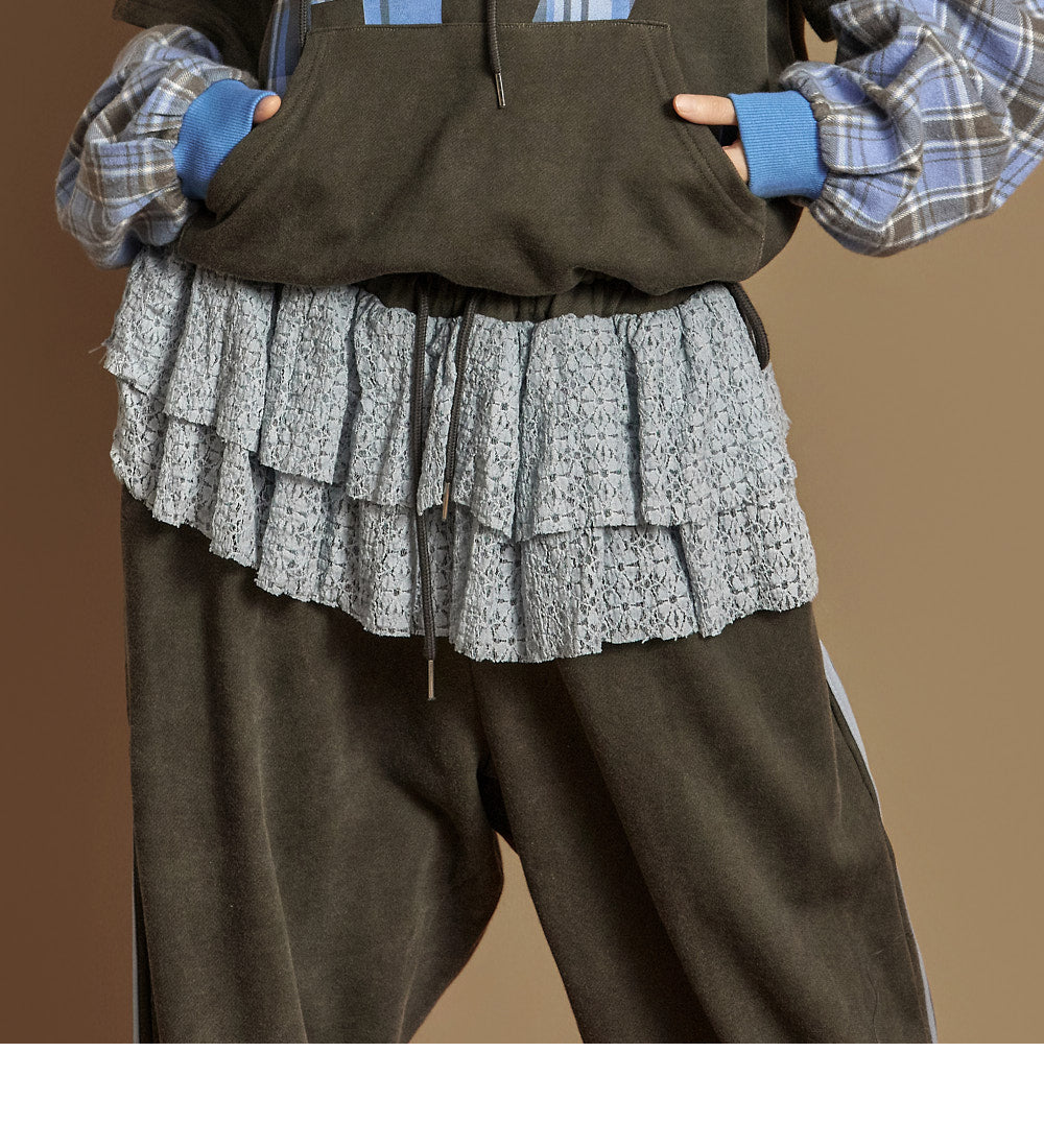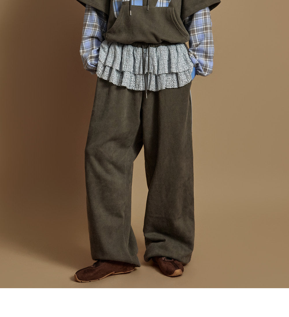 The pants have a wide silhouette, with a comfortable waistband and drawstring,