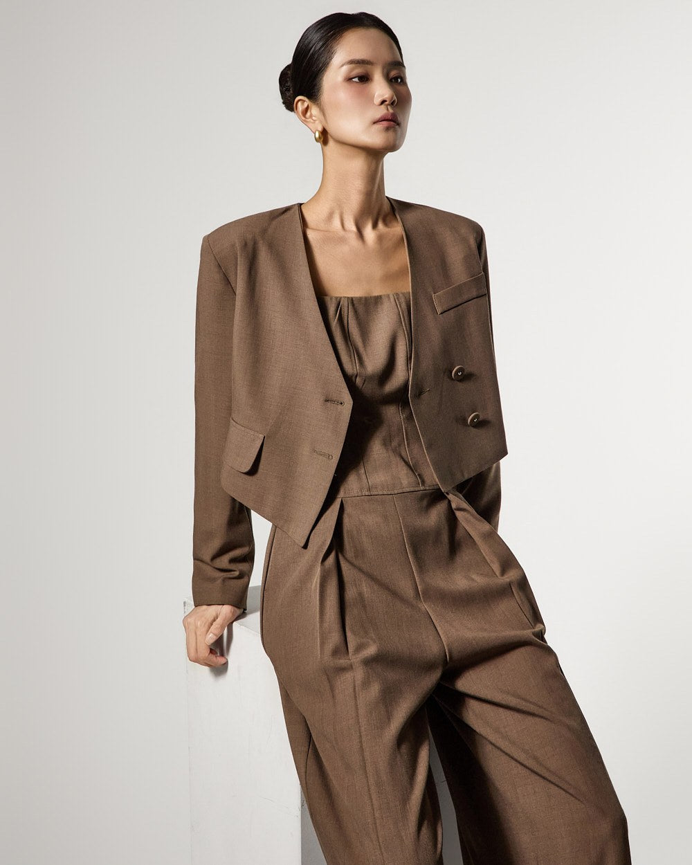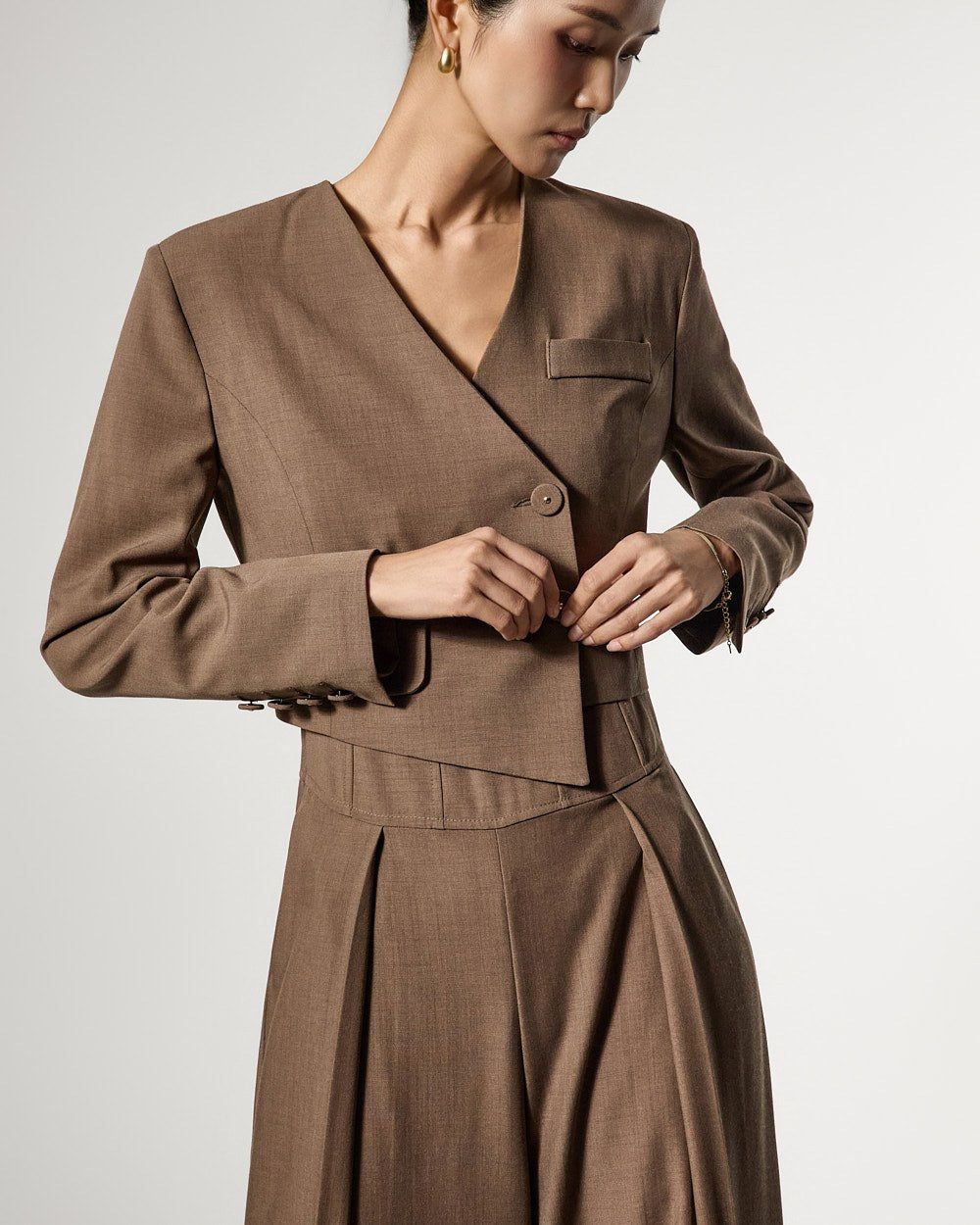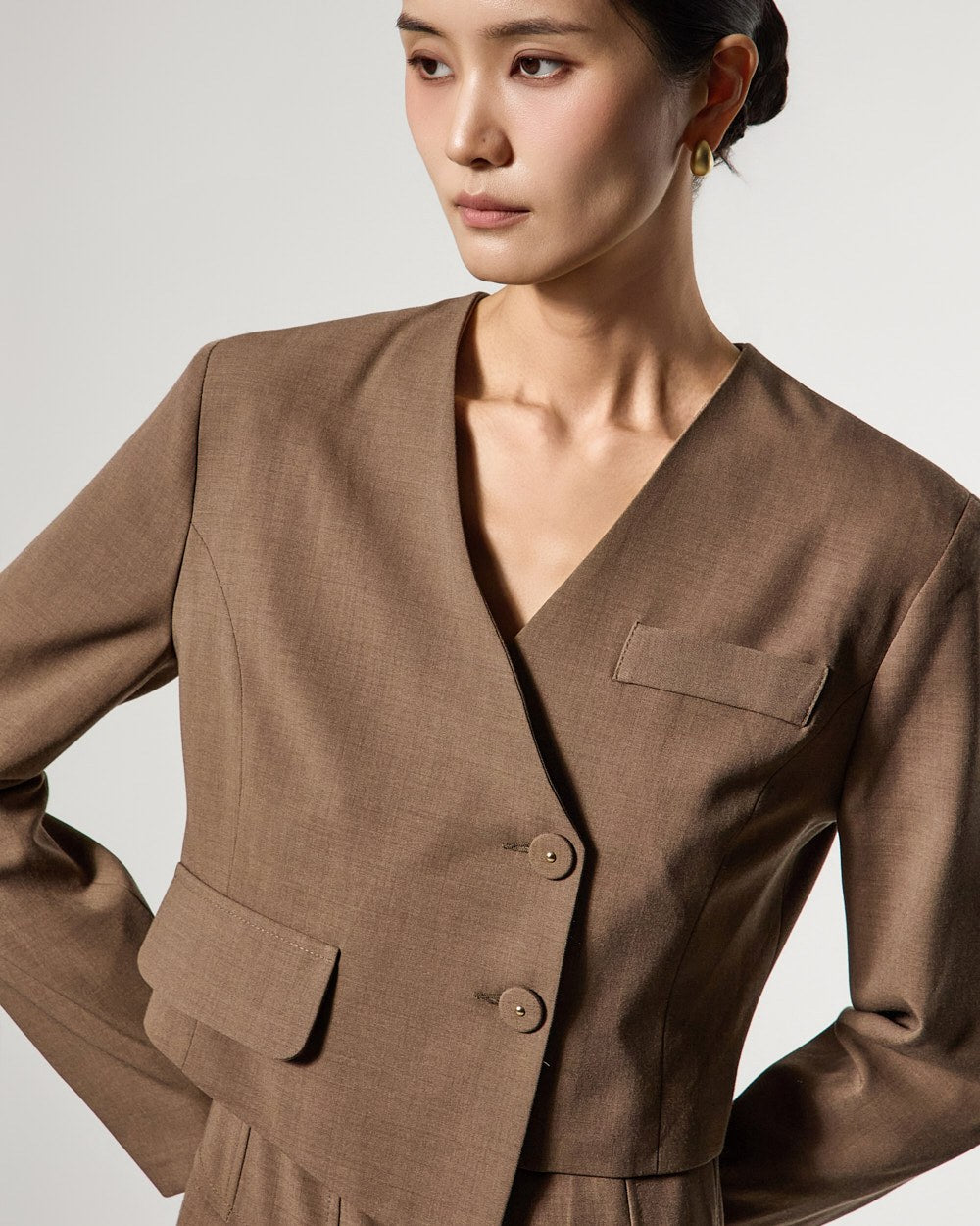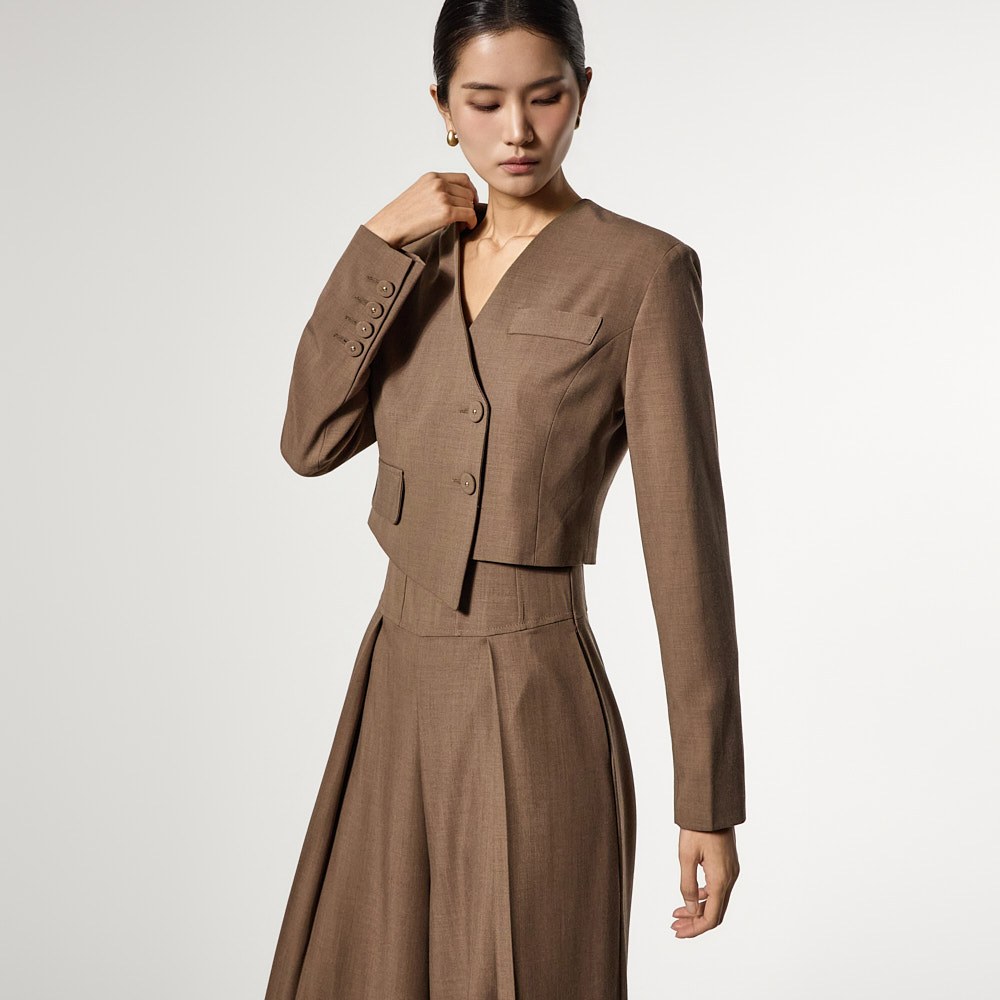 而无领廓形和前纽扣开合则打造出简洁利落的造型。