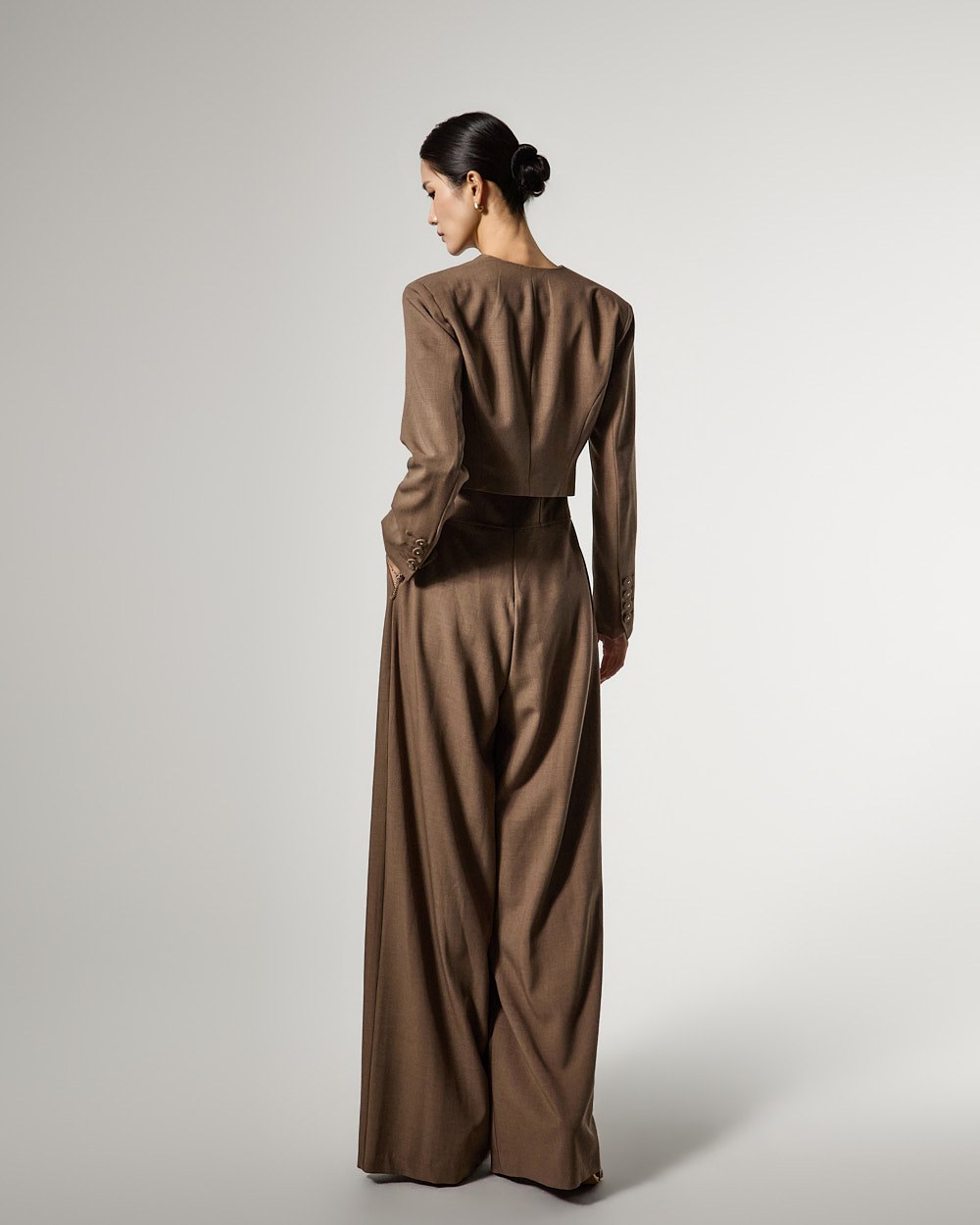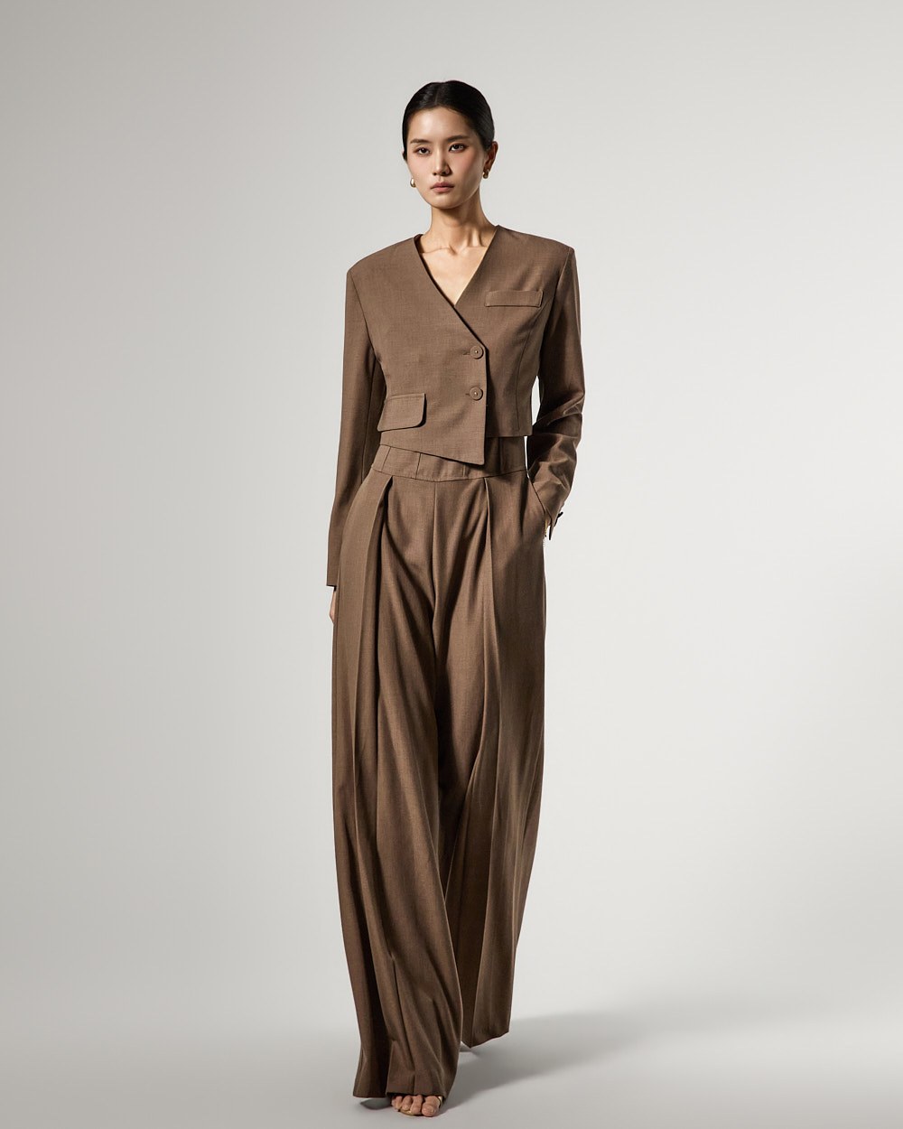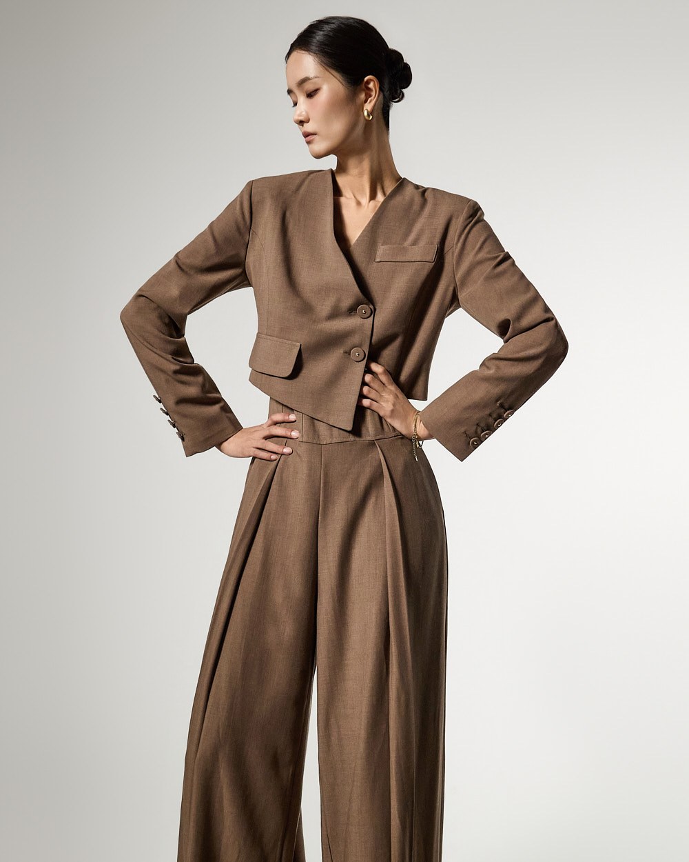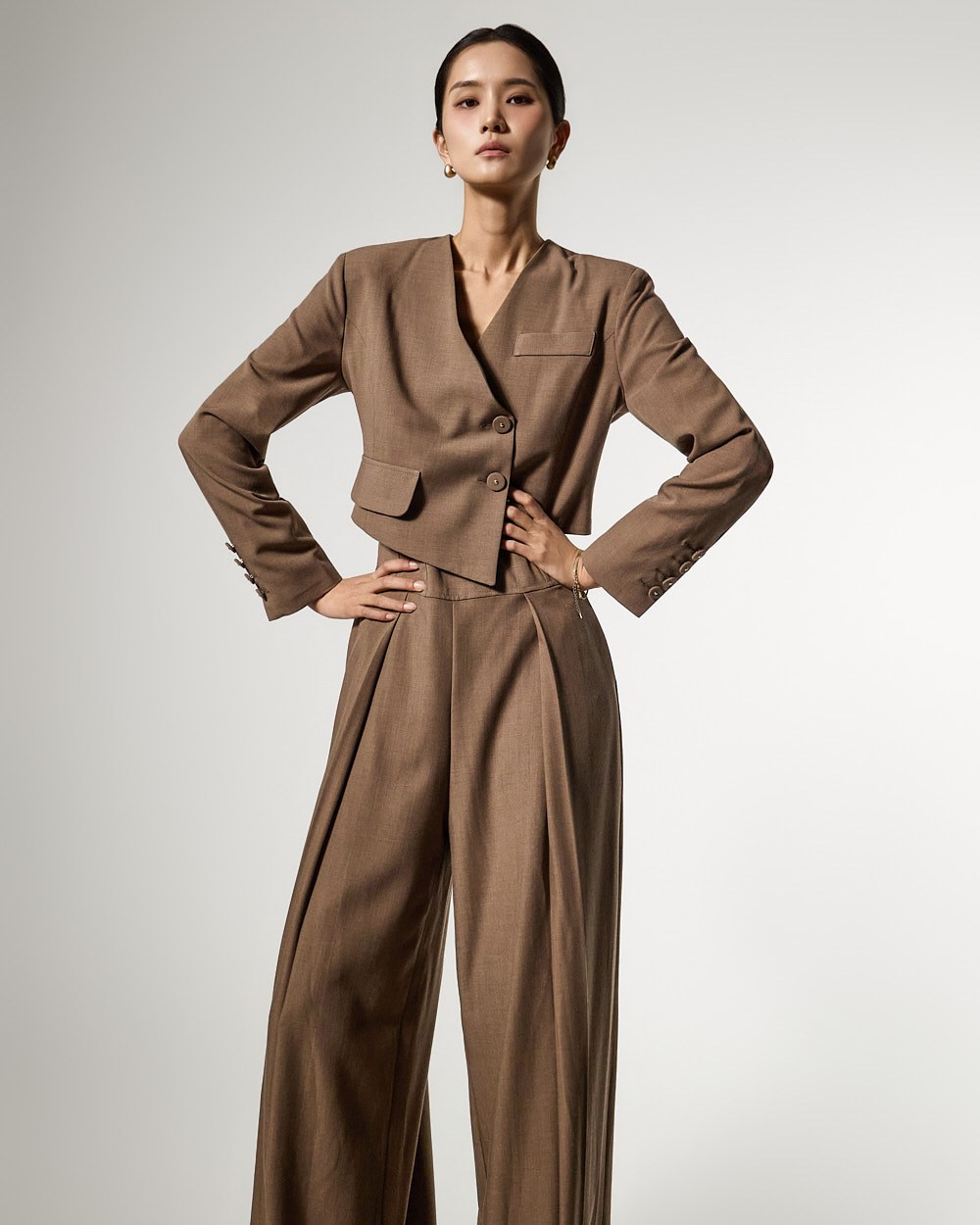 而无领廓形和前纽扣开合则打造出简洁利落的造型。