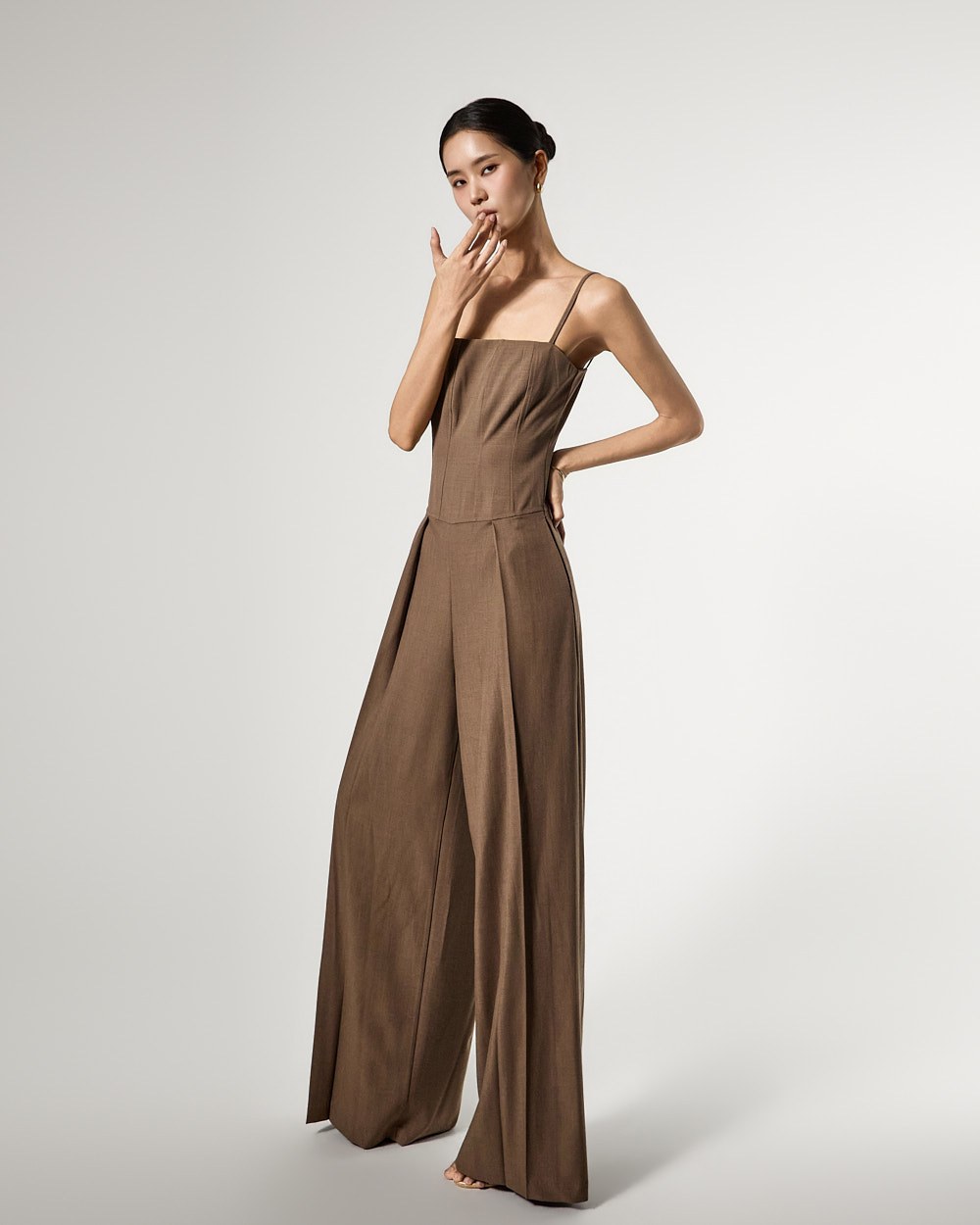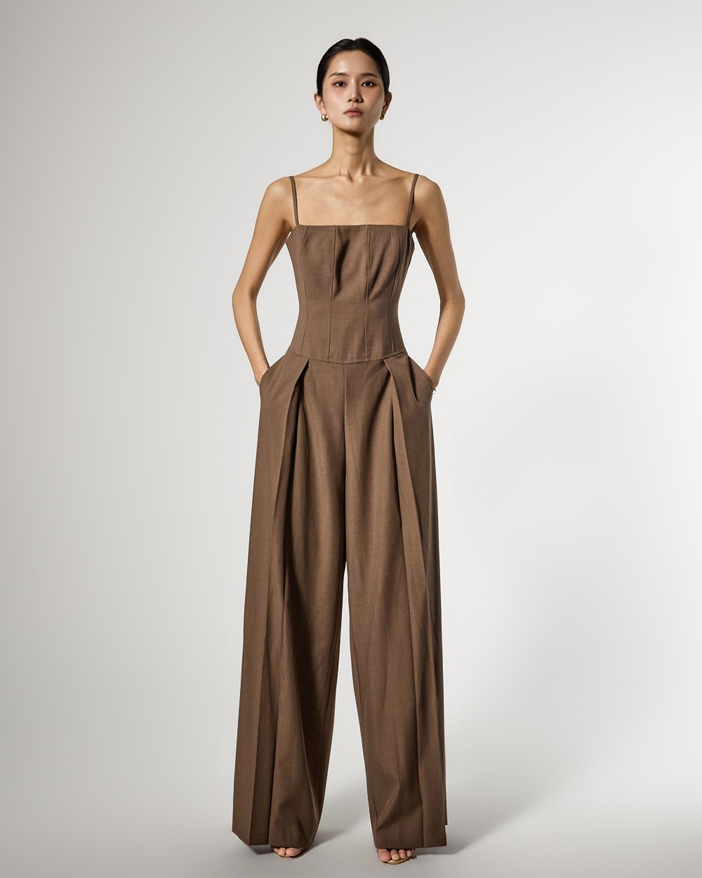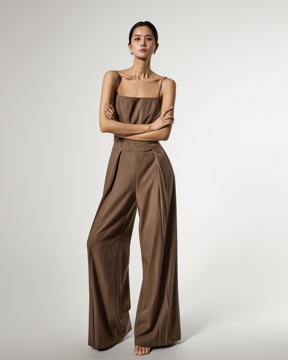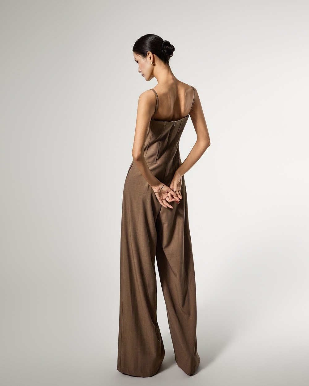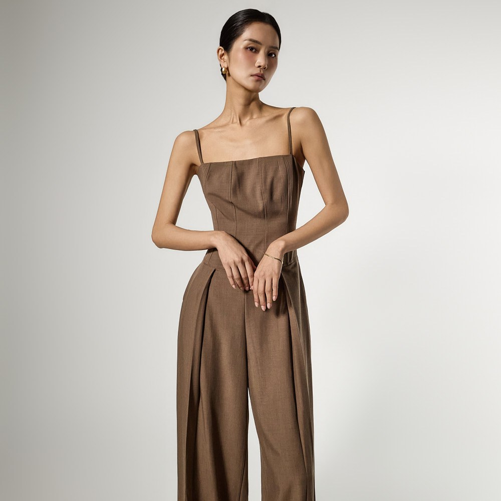 连体裤采用修身款上衣和宽松款裤子的和谐搭配,