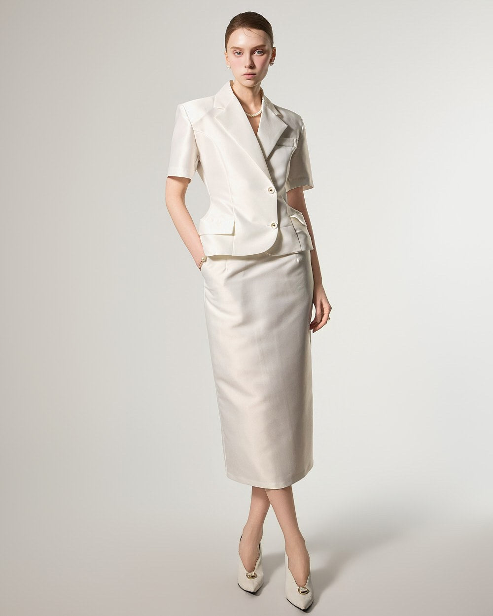这是一款充满现代感的夹克和半身裙套装。