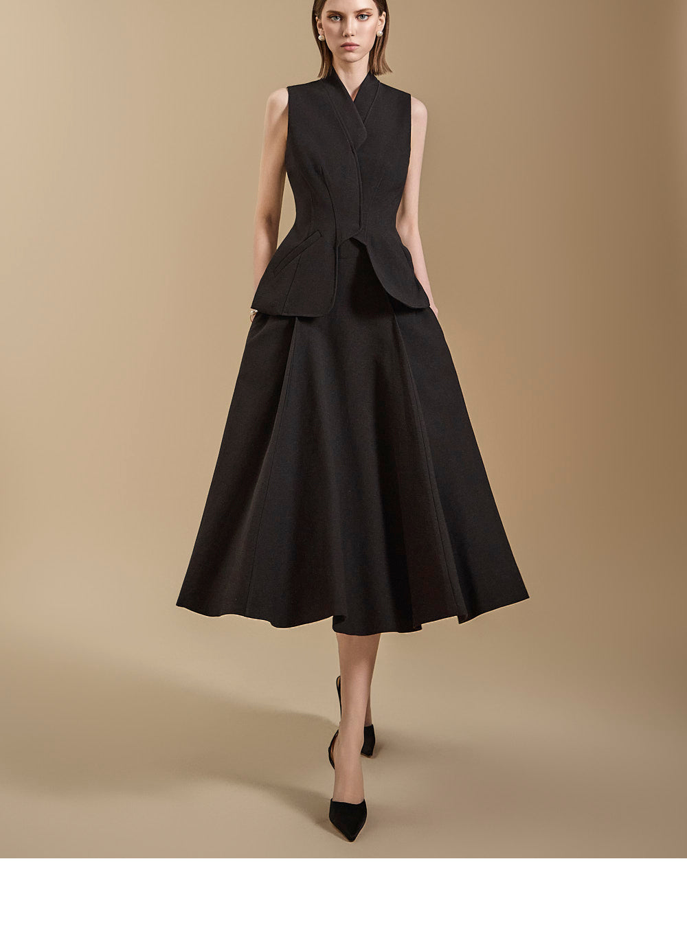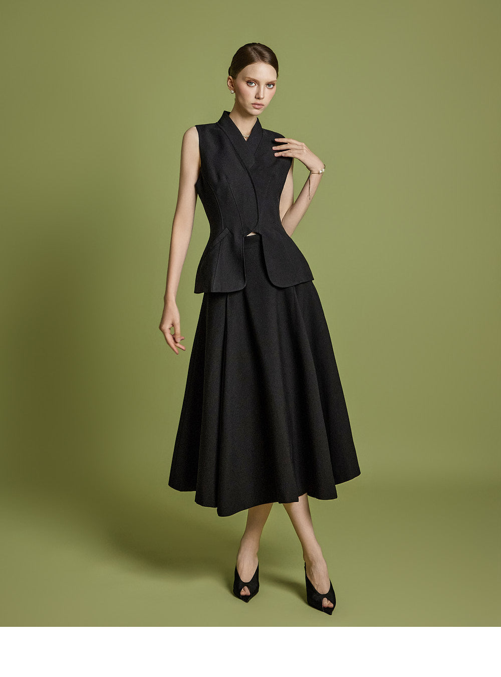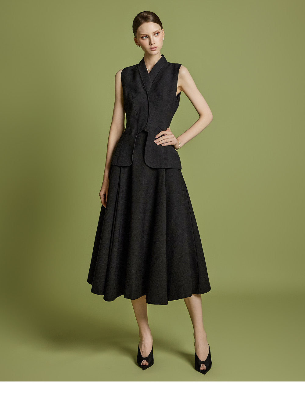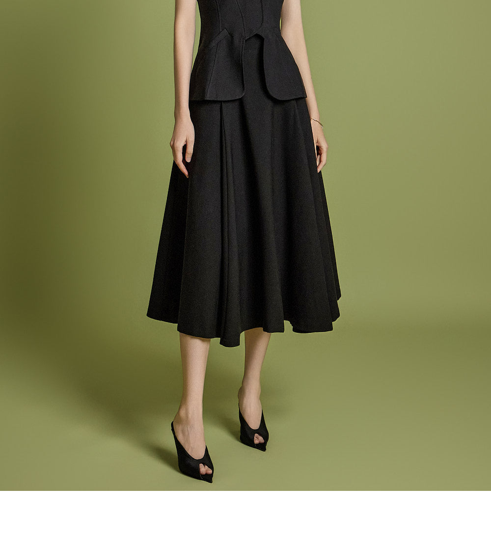 背心设计增添了古典气息,而喇叭裙线
