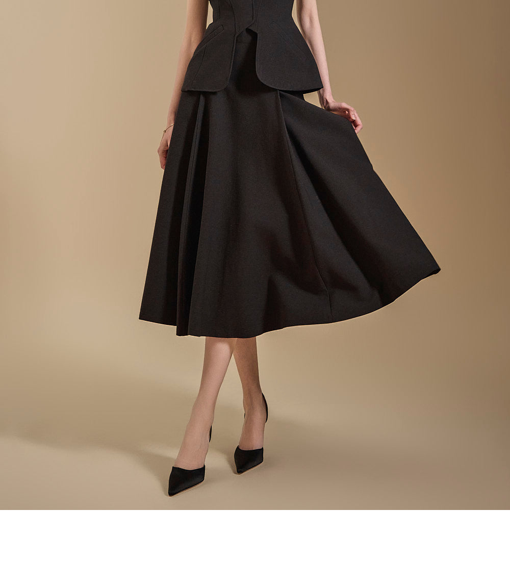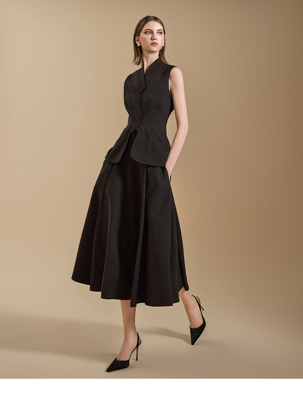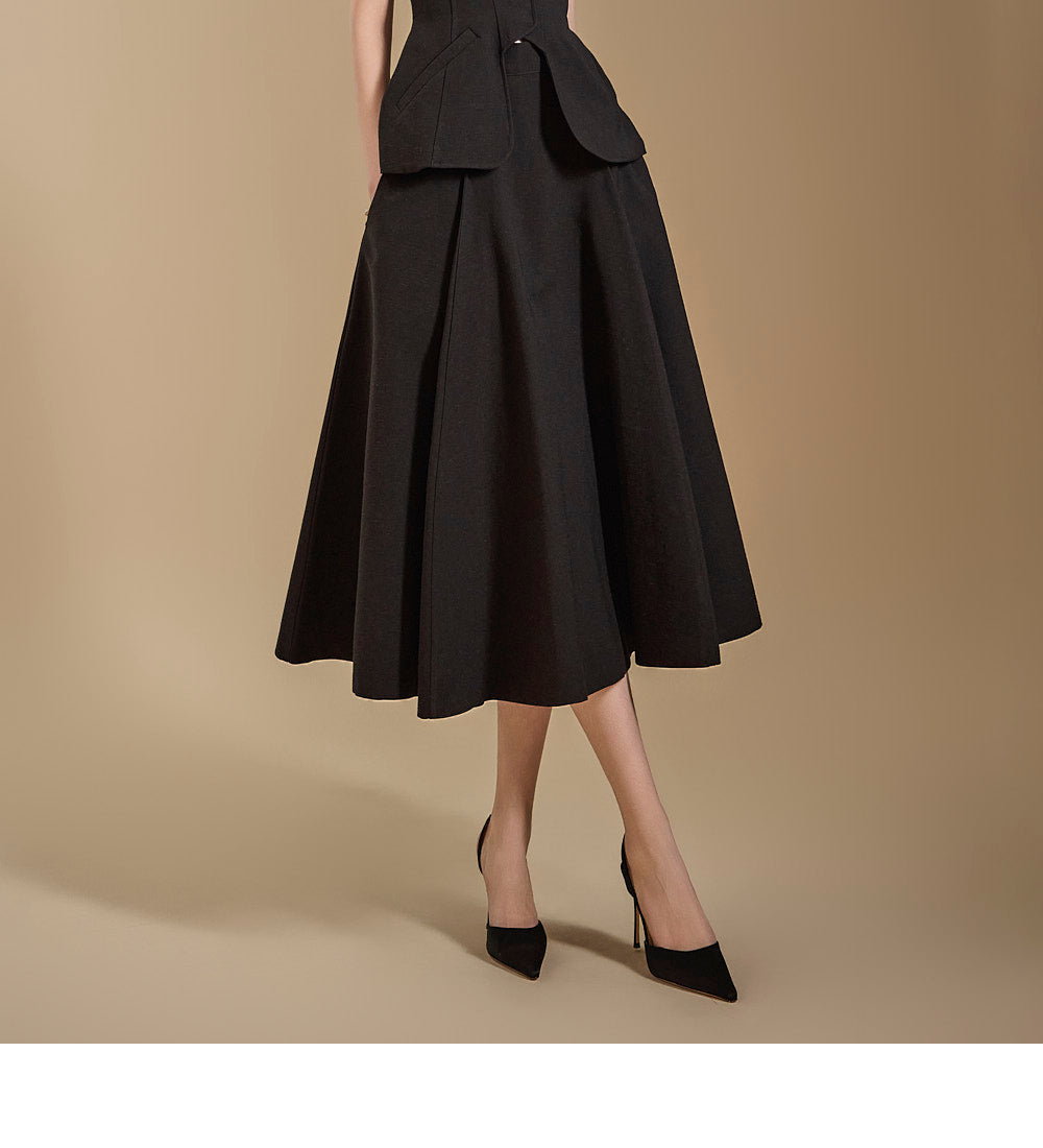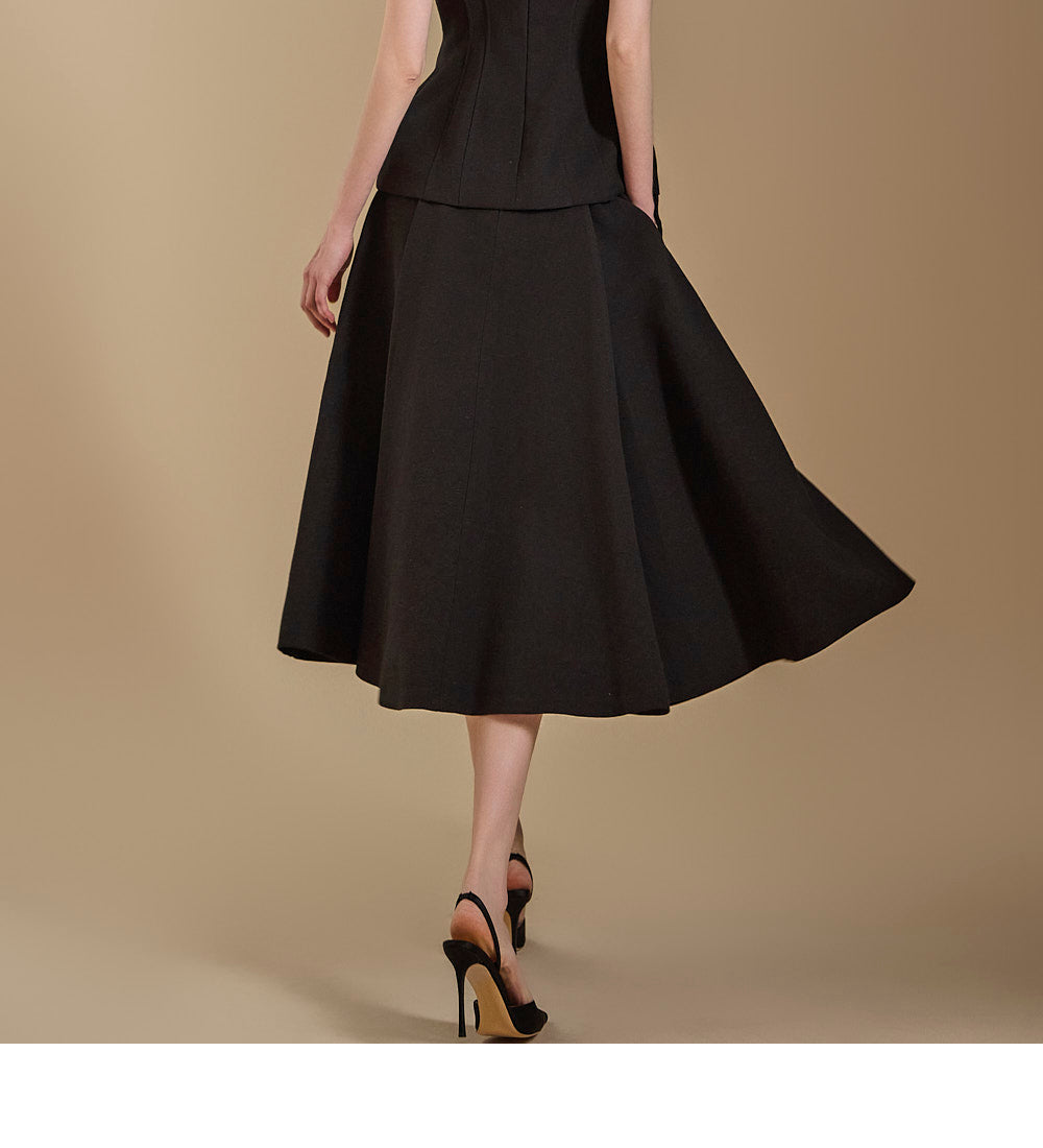 背心设计增添了古典气息,而喇叭裙线