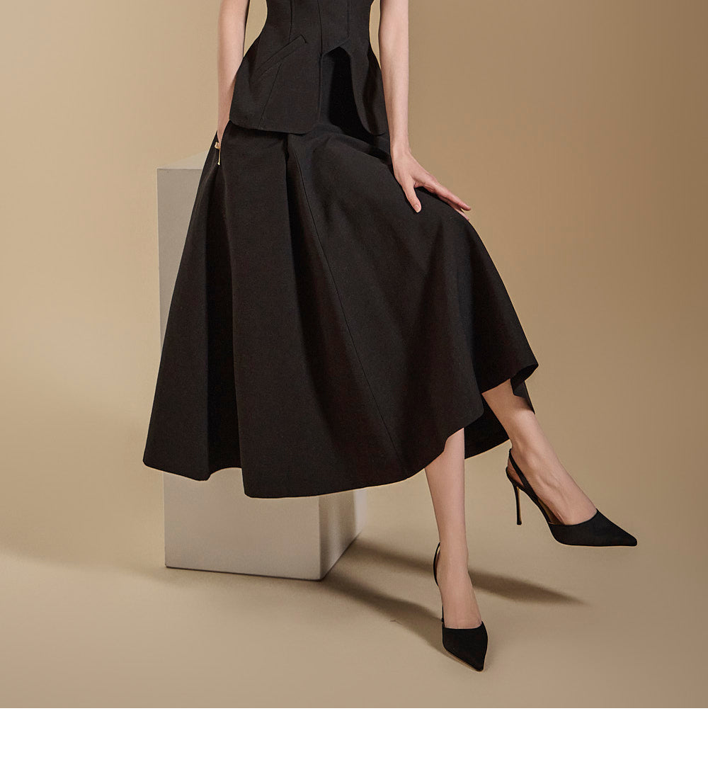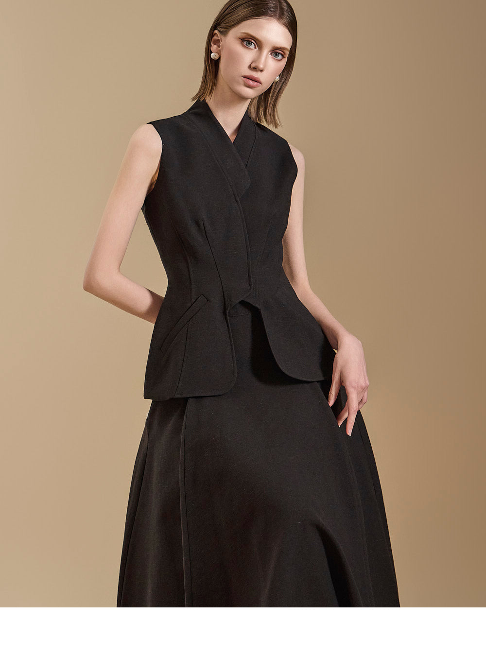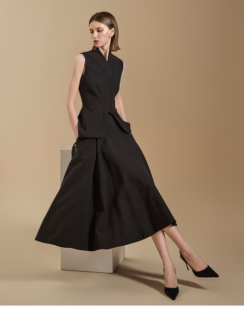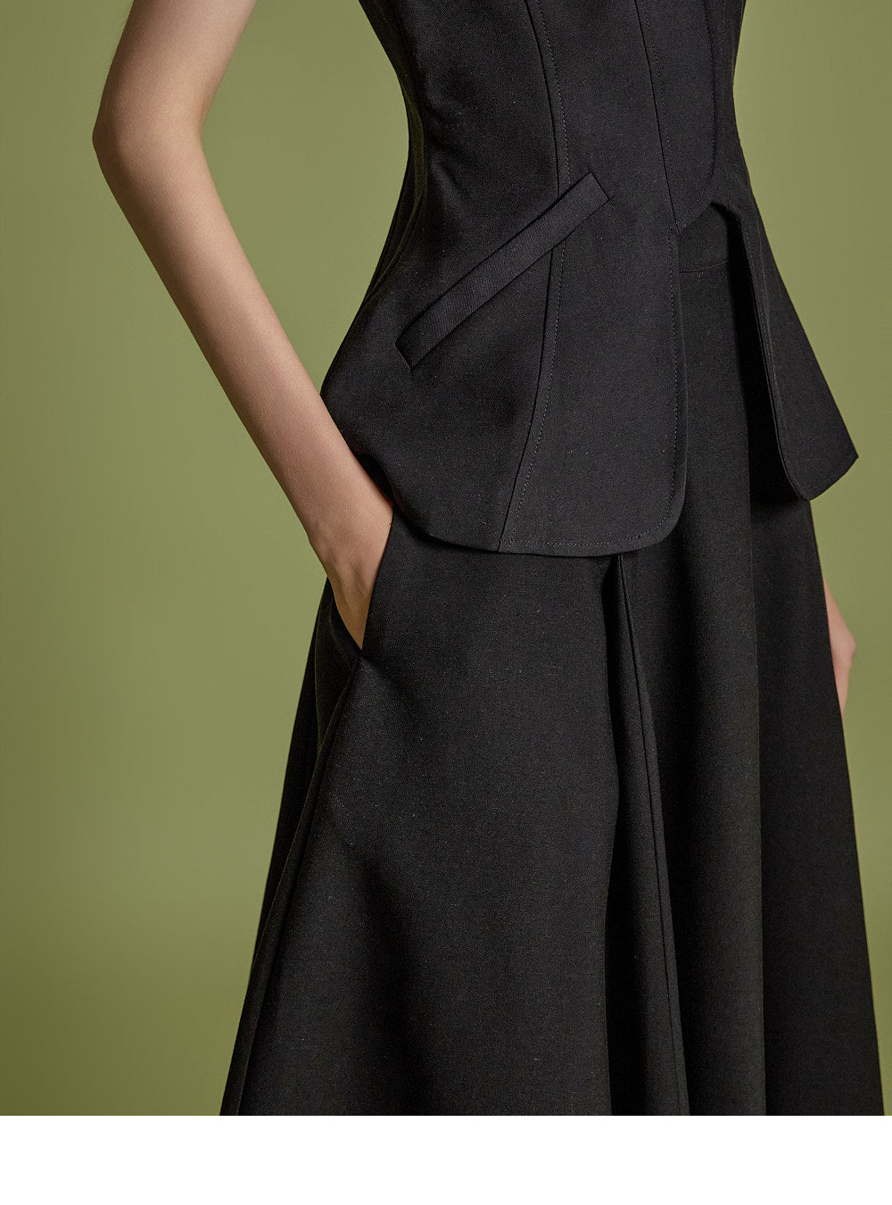 背心设计增添了古典气息,而喇叭裙线