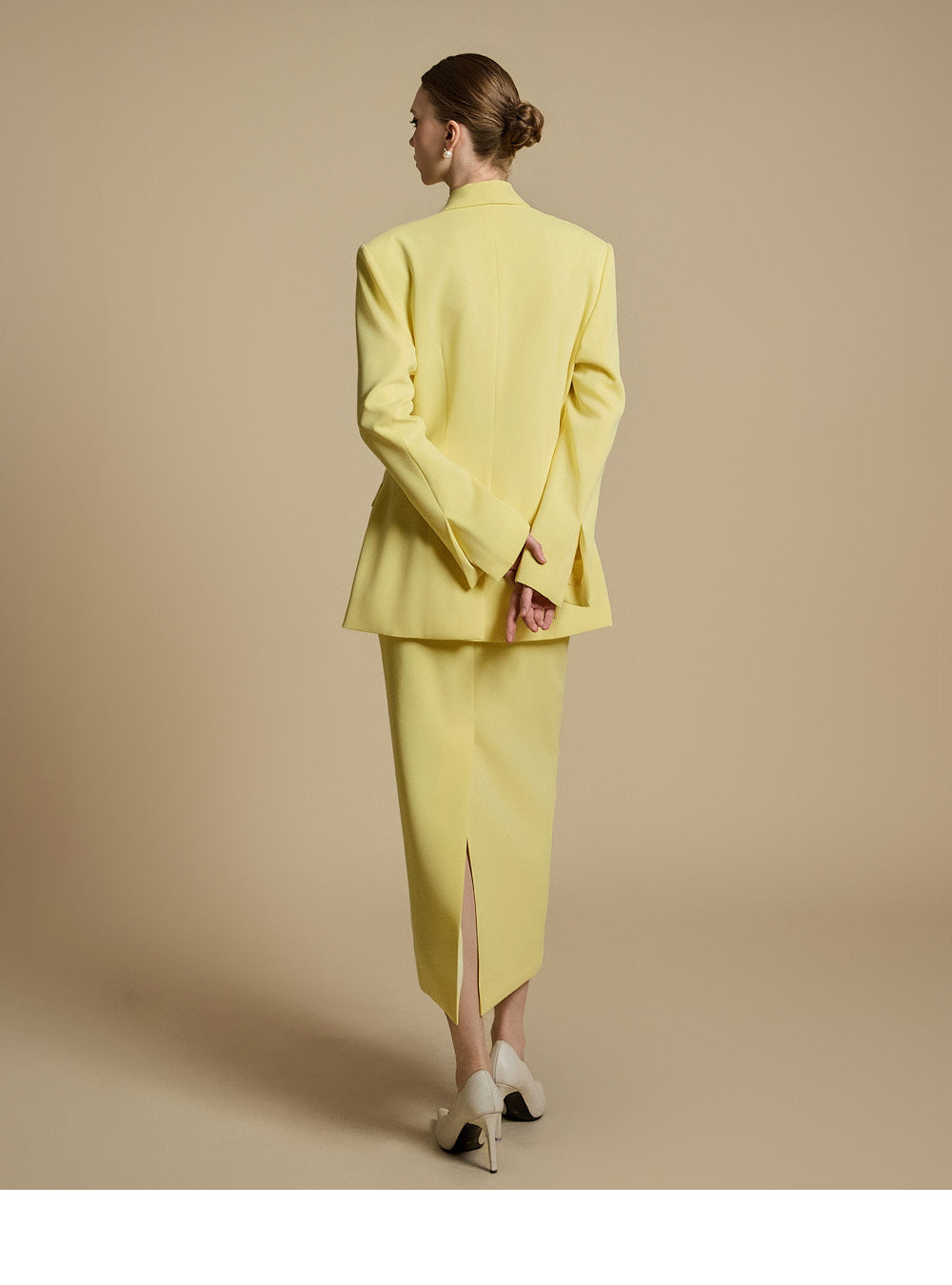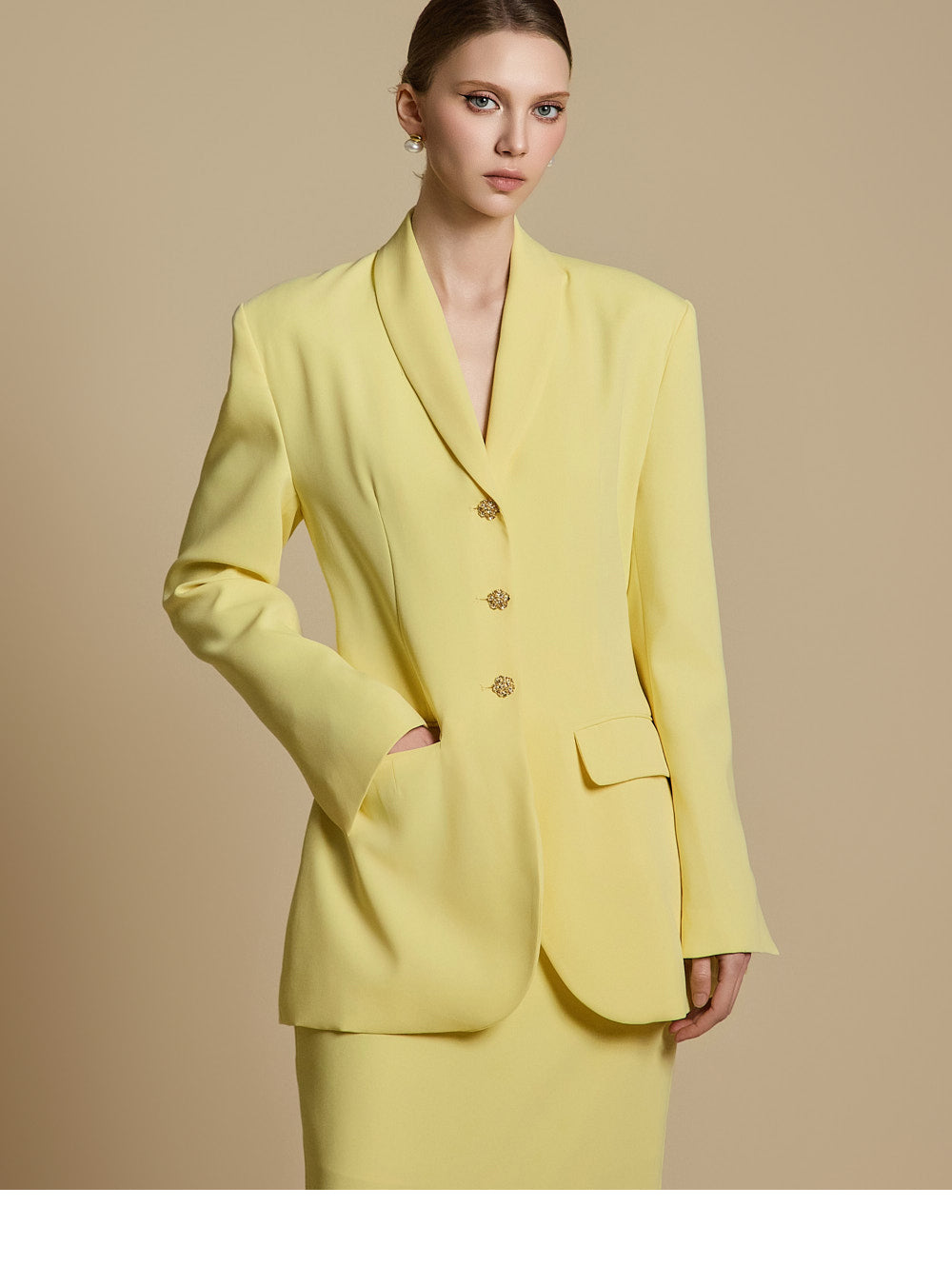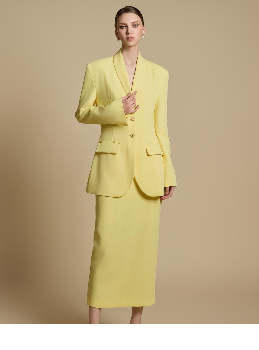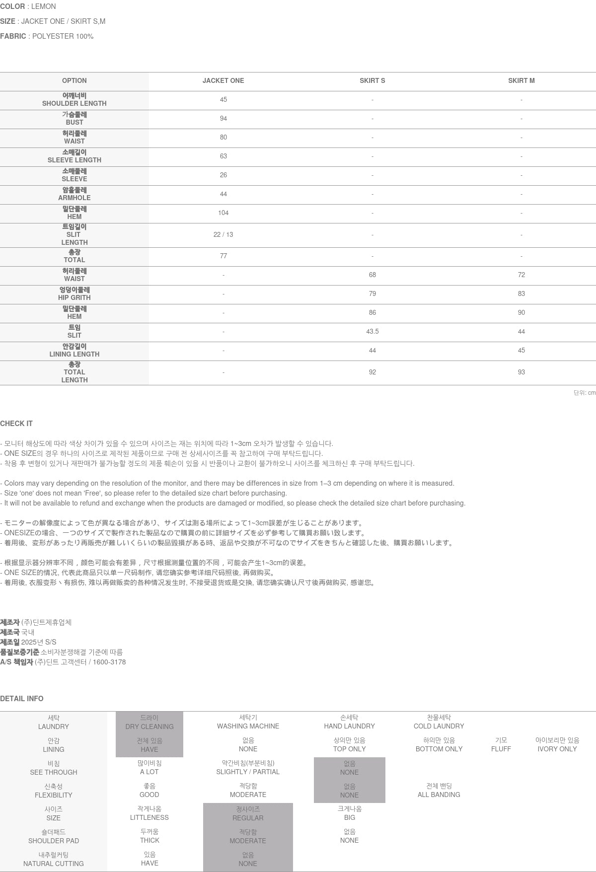 模特身高 174 厘米,穿着 LEMON 的 ONE 尺寸夹克和 S 尺寸裙子。