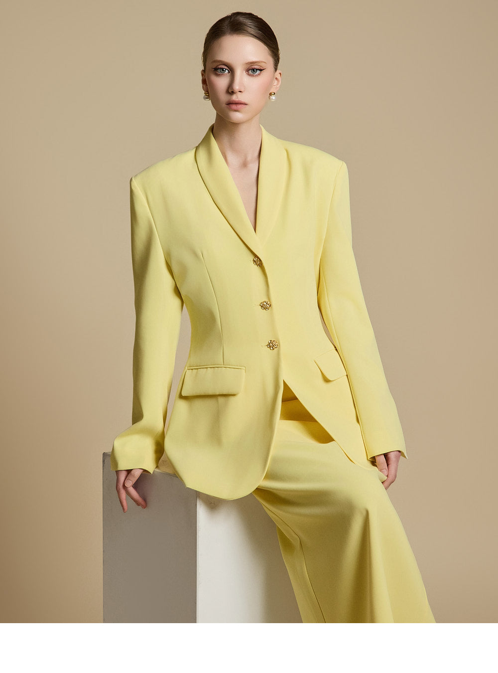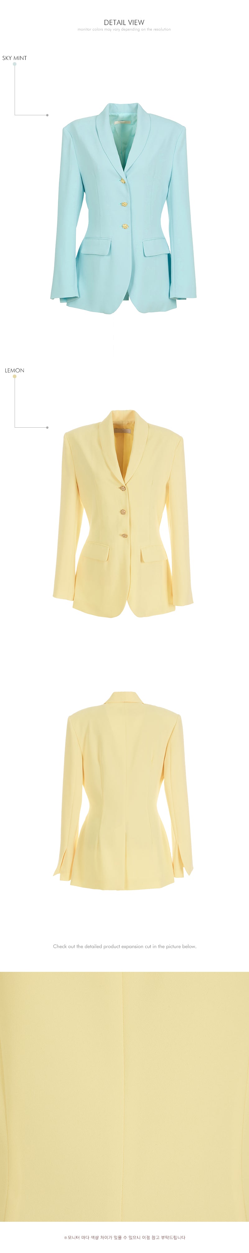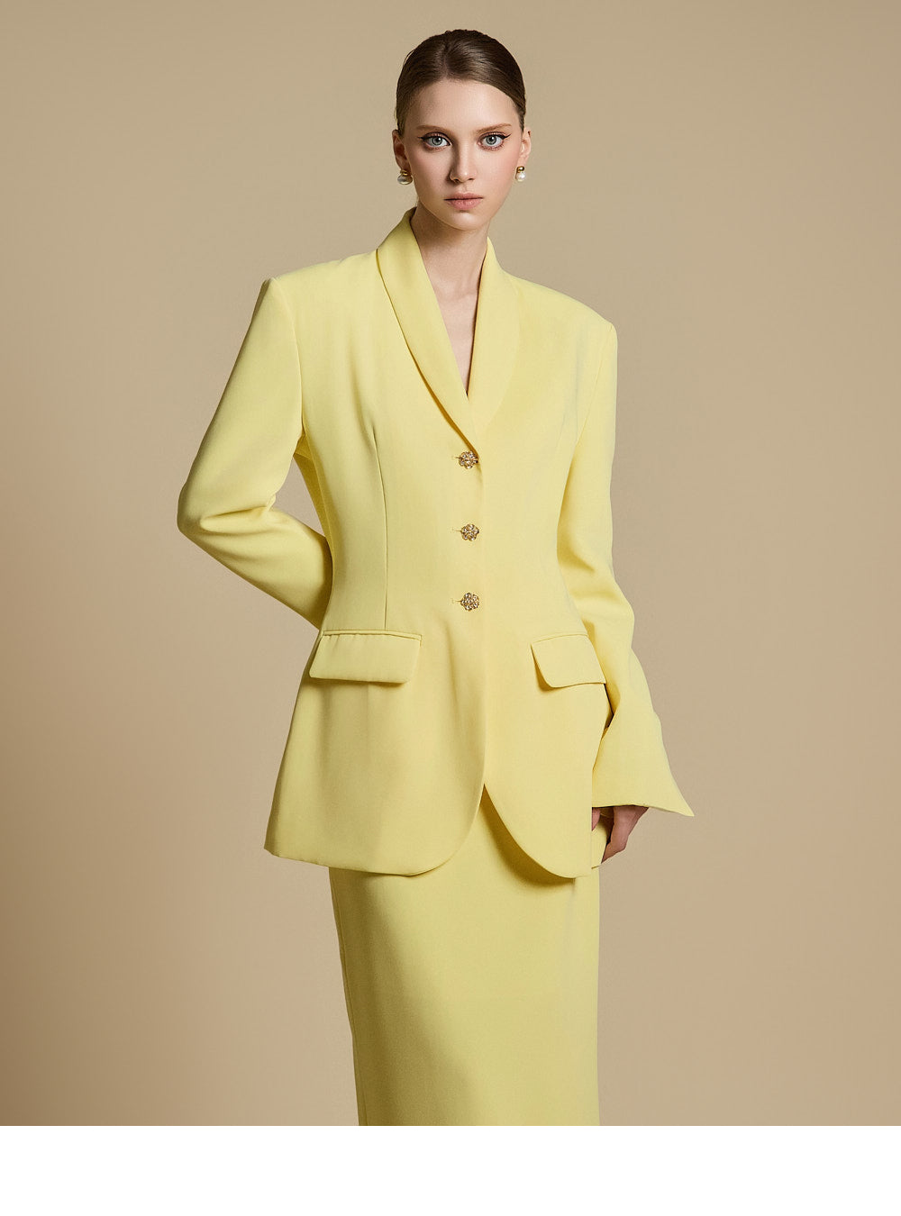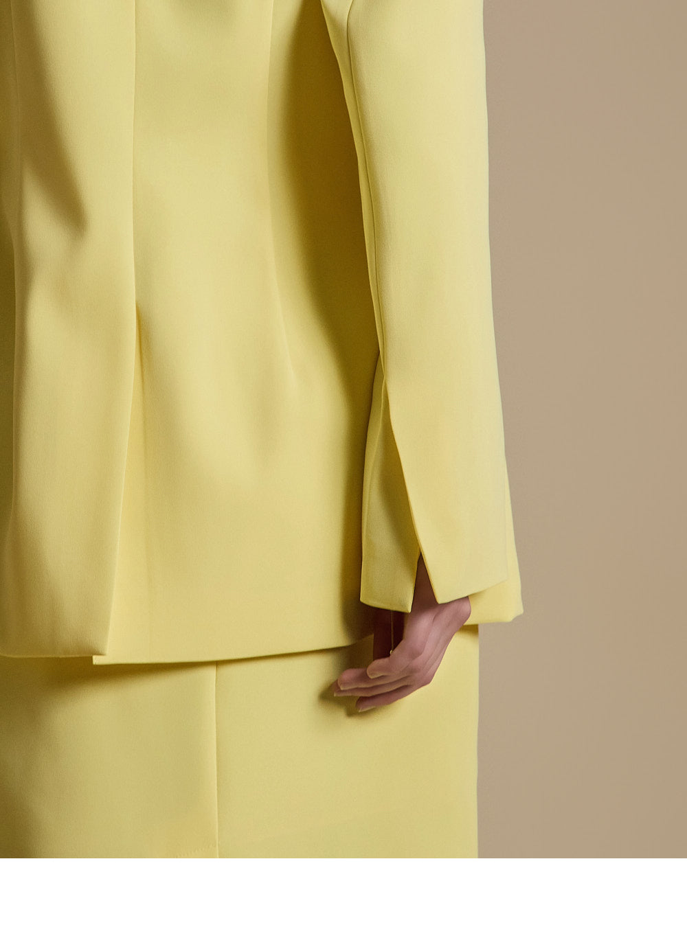 模特身高 174 厘米,穿着 LEMON 的 ONE 尺寸夹克和 S 尺寸裙子。