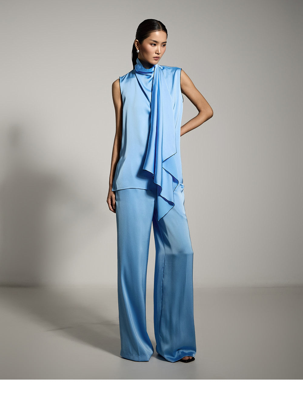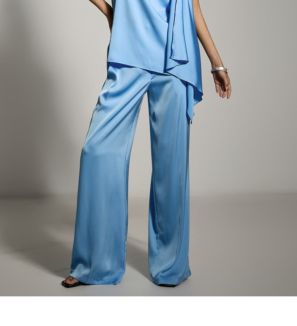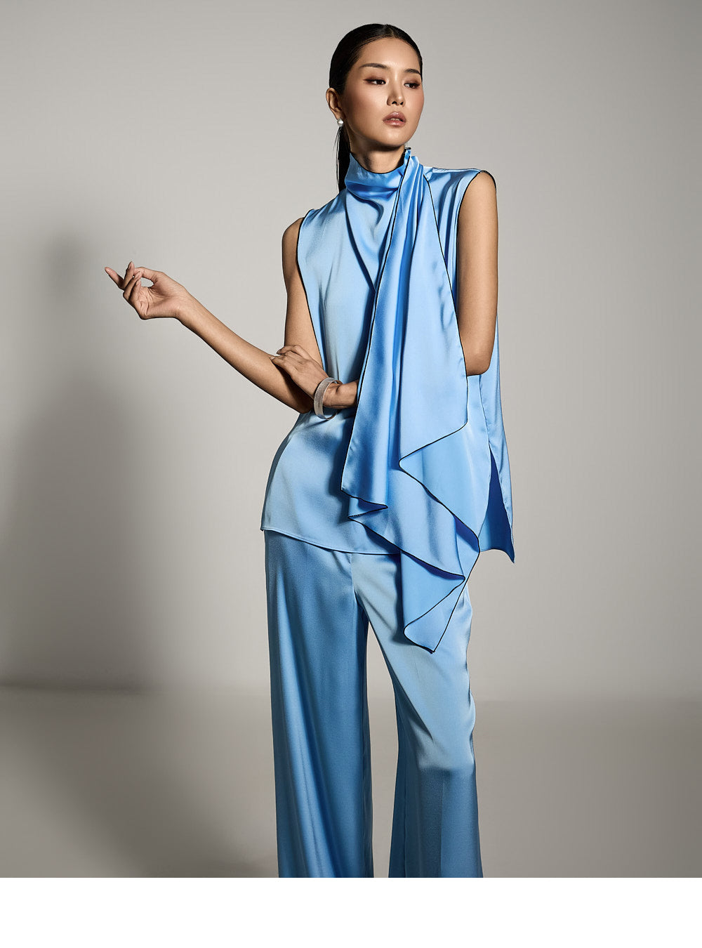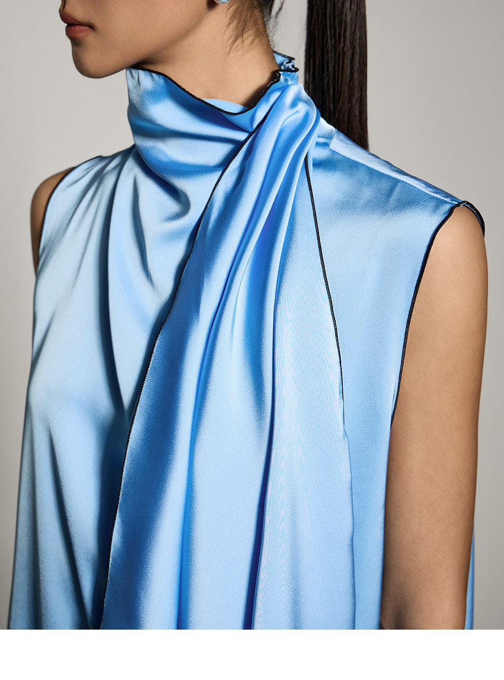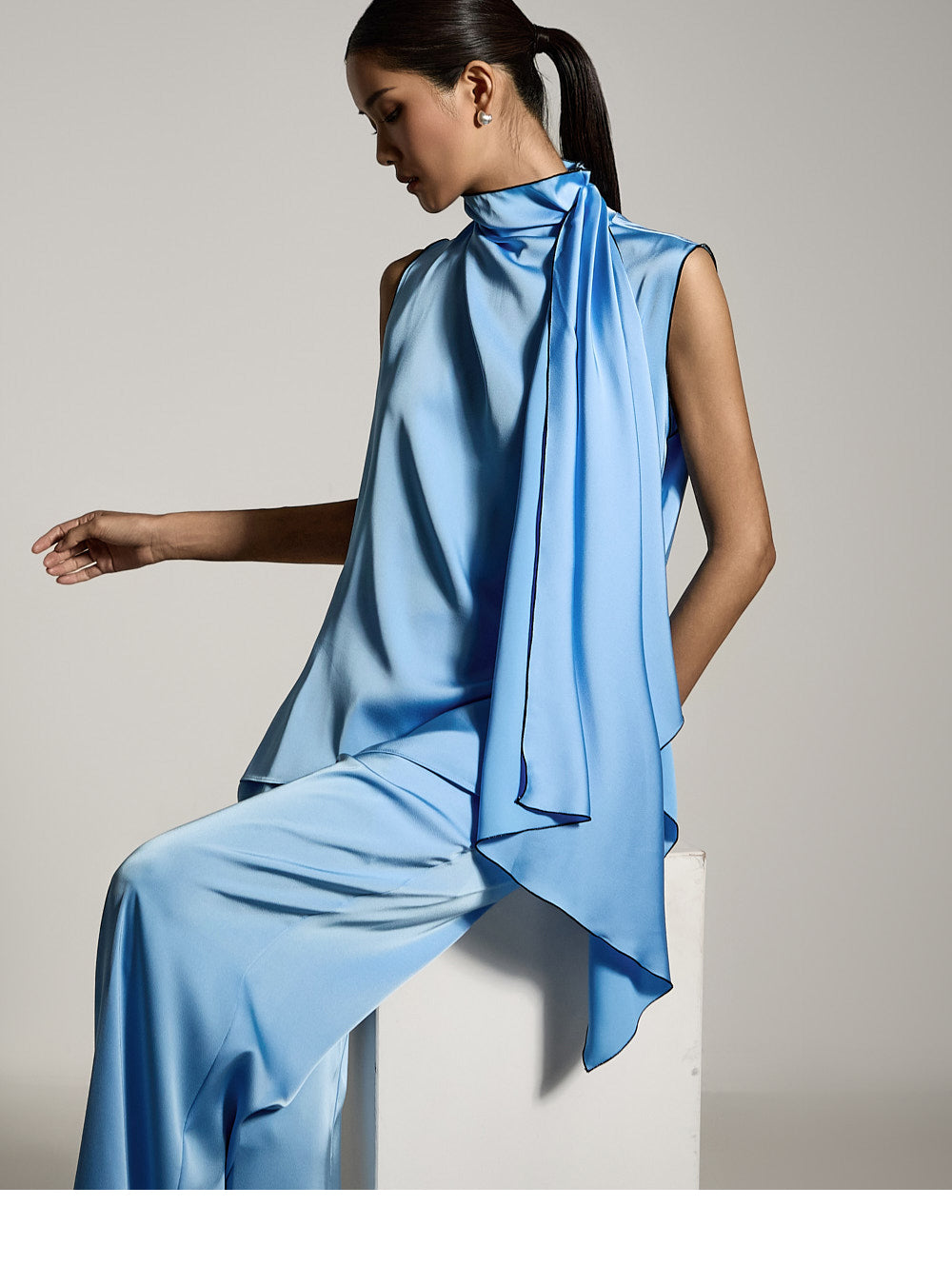 模特身高 173 厘米,穿着天蓝色均码服装。
